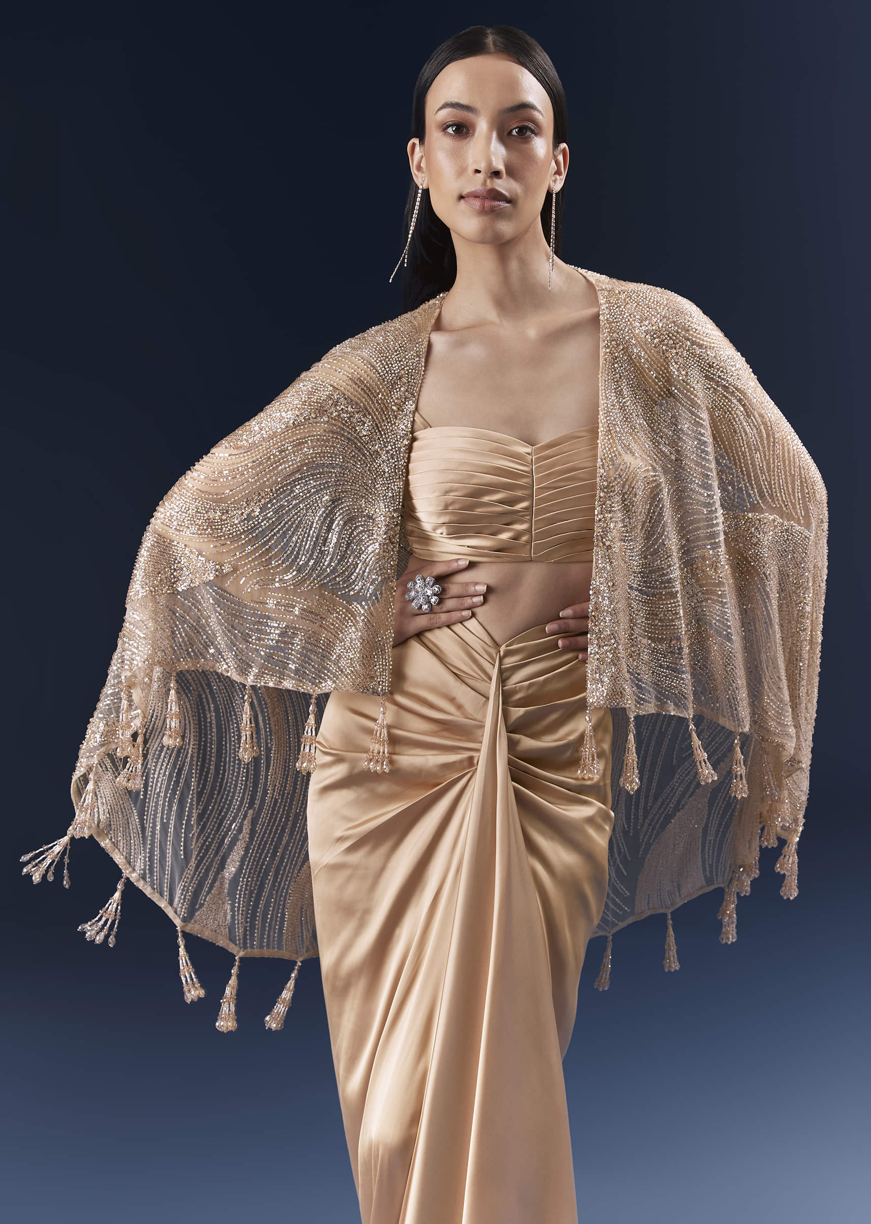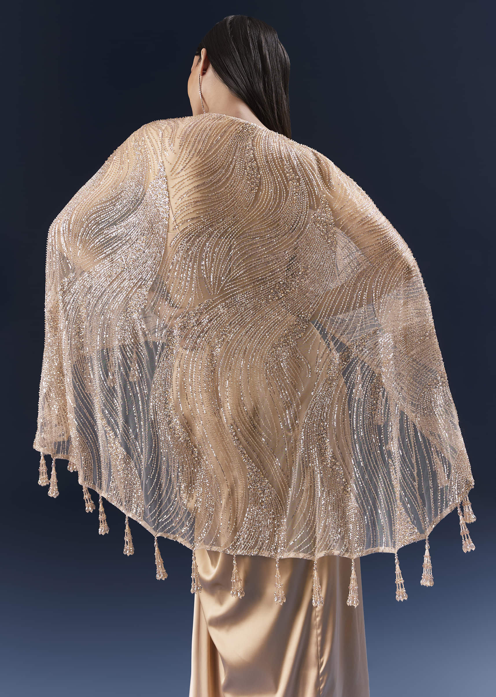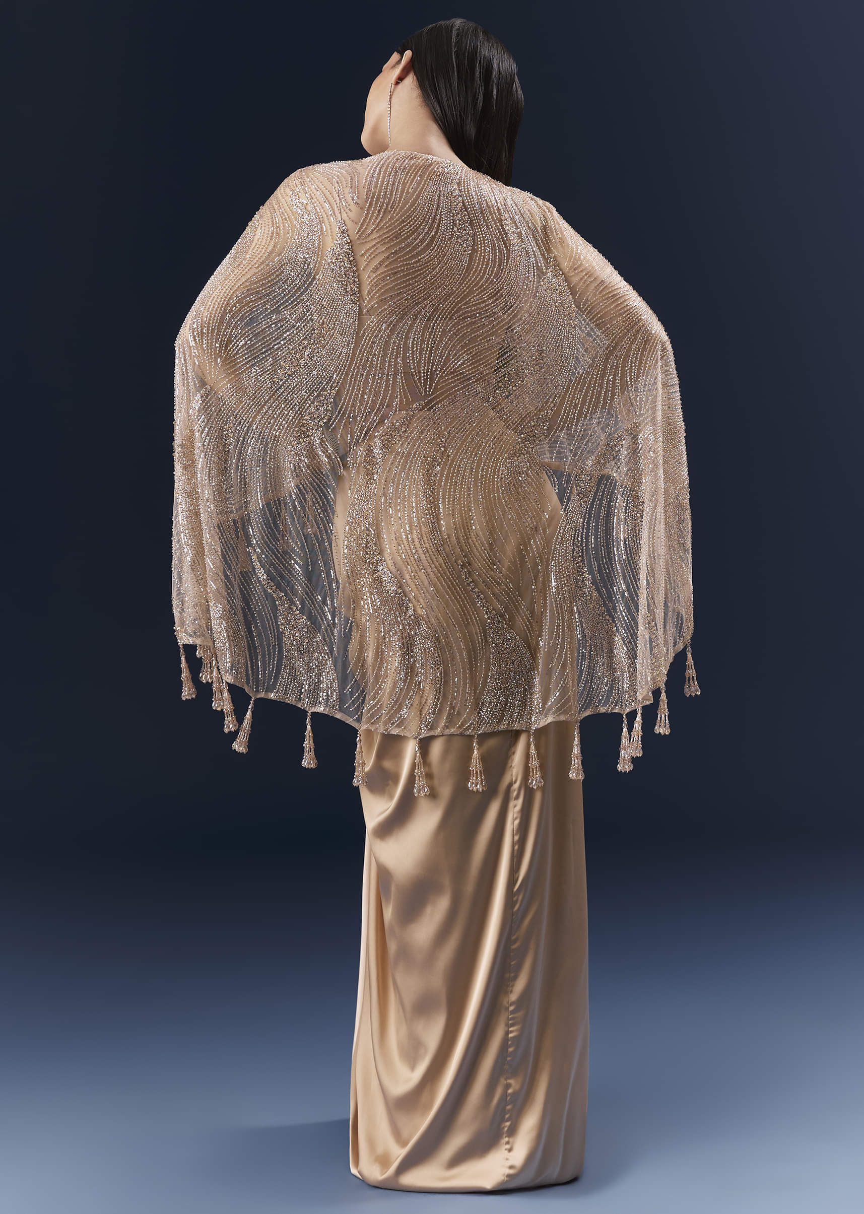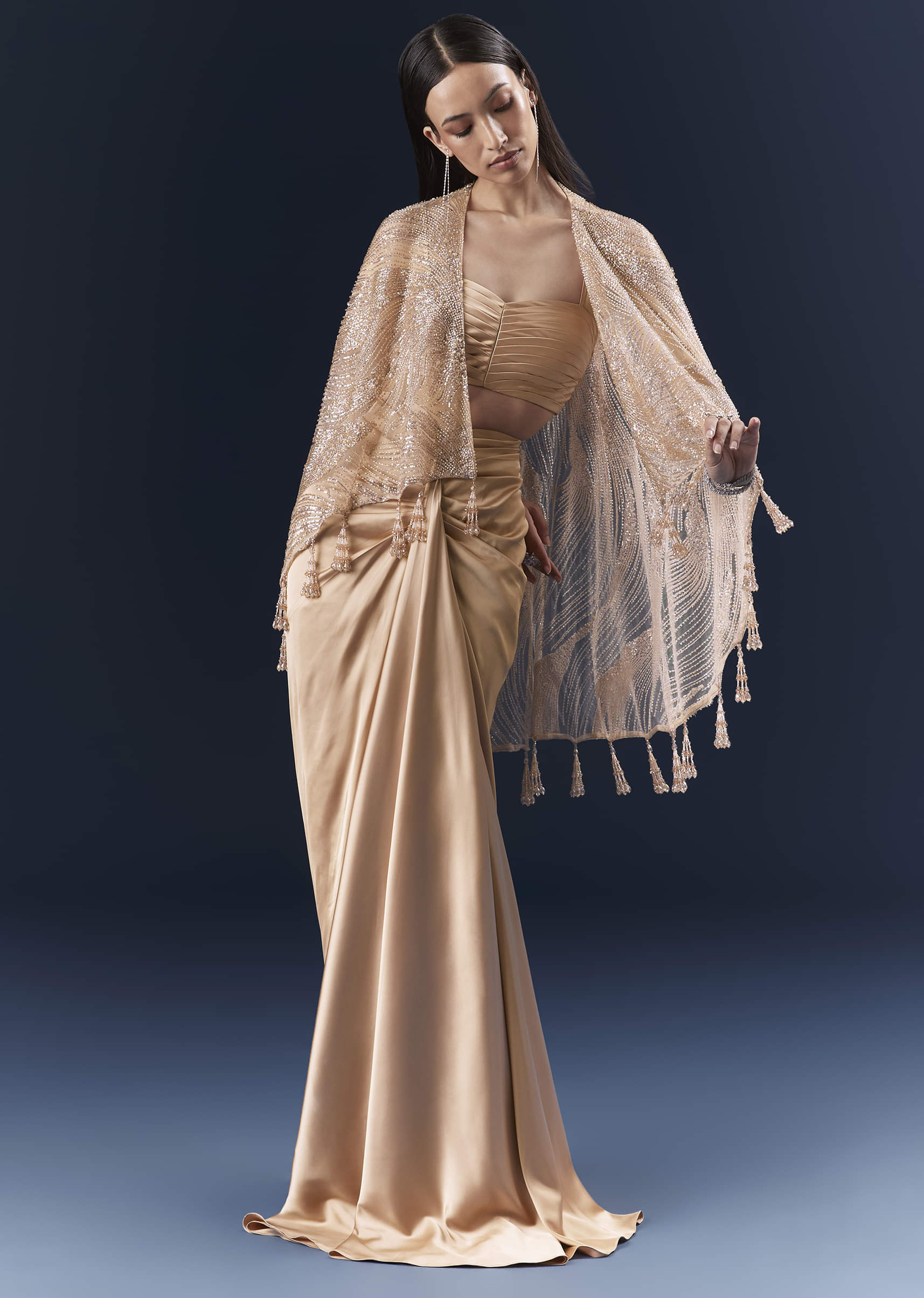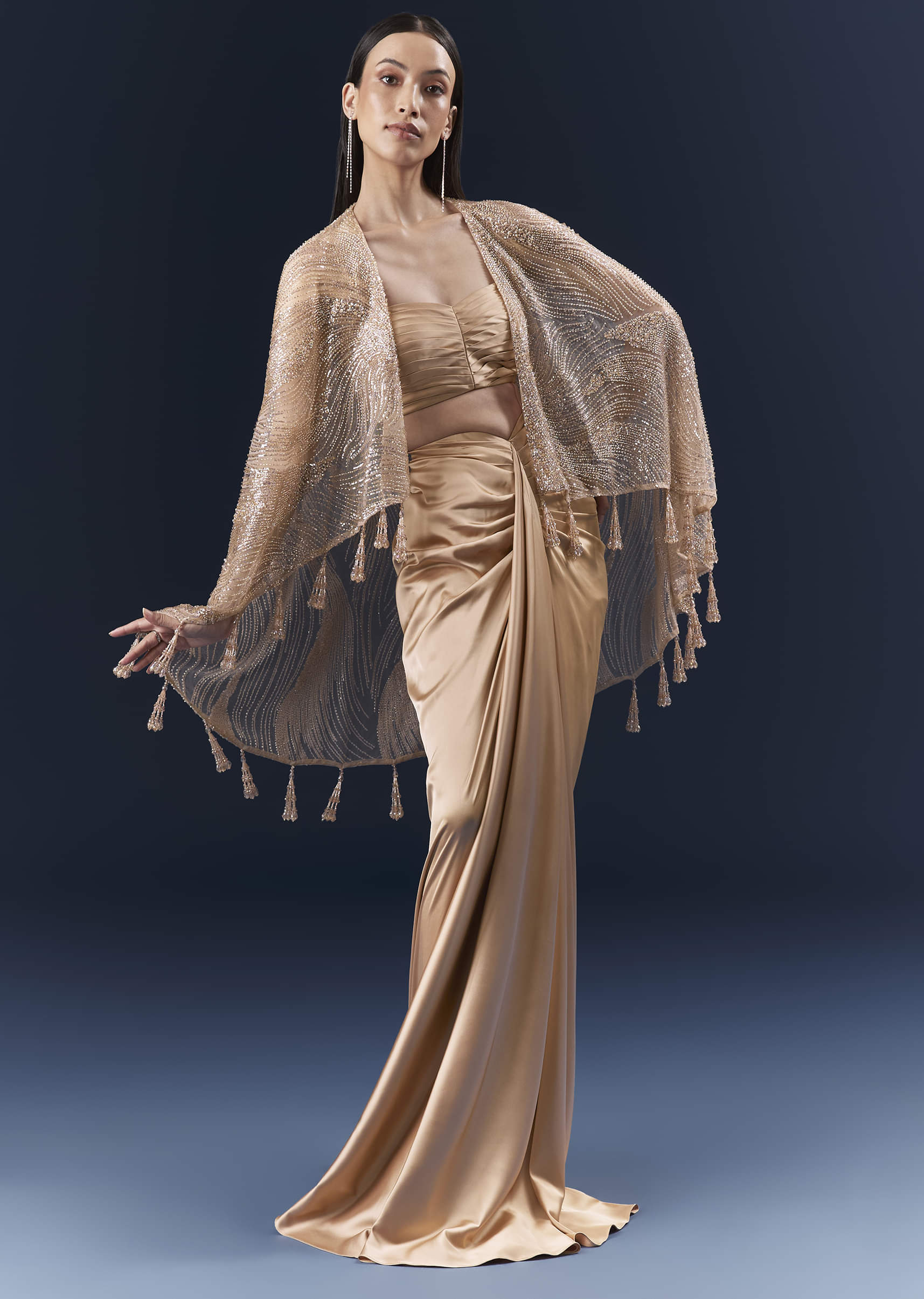 When soft colour meets statement styling, this peach satin crop top and skirt set adds a weightless cape that frames the silhouette without bulk. Cutdana and bead embellishments are tuned... More Product Details