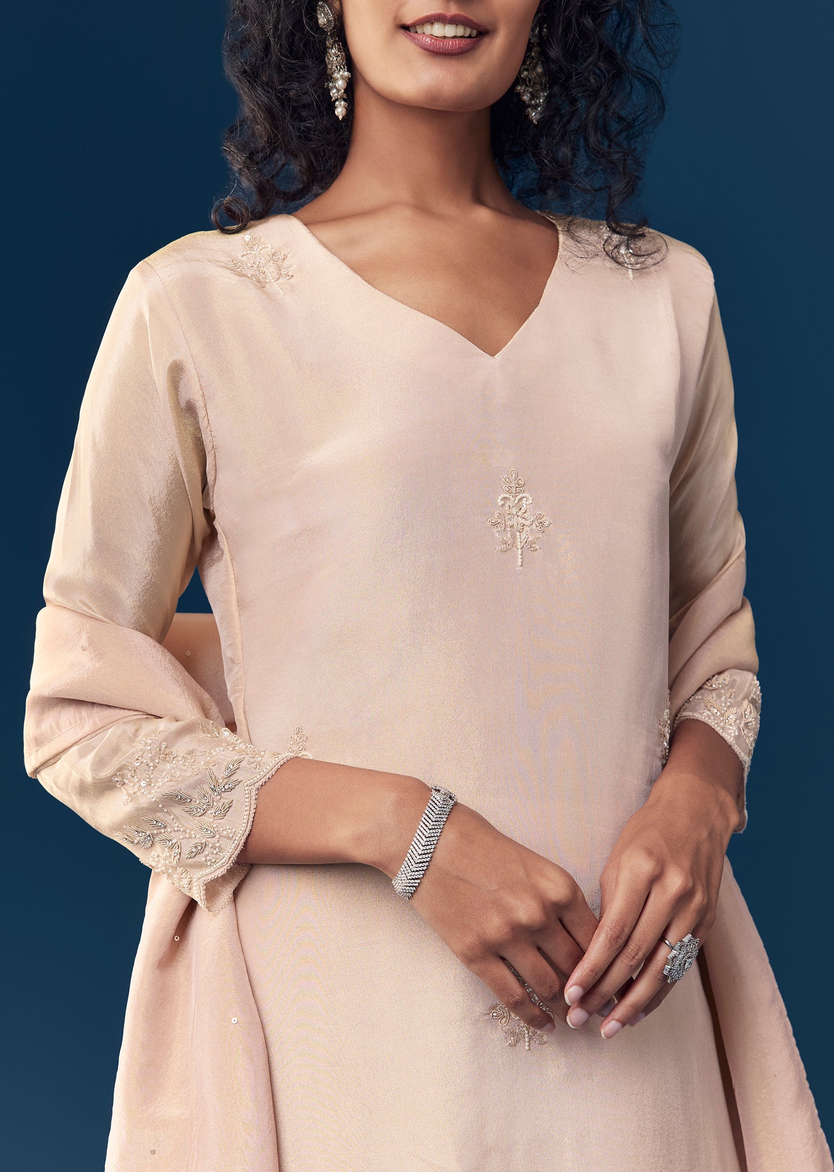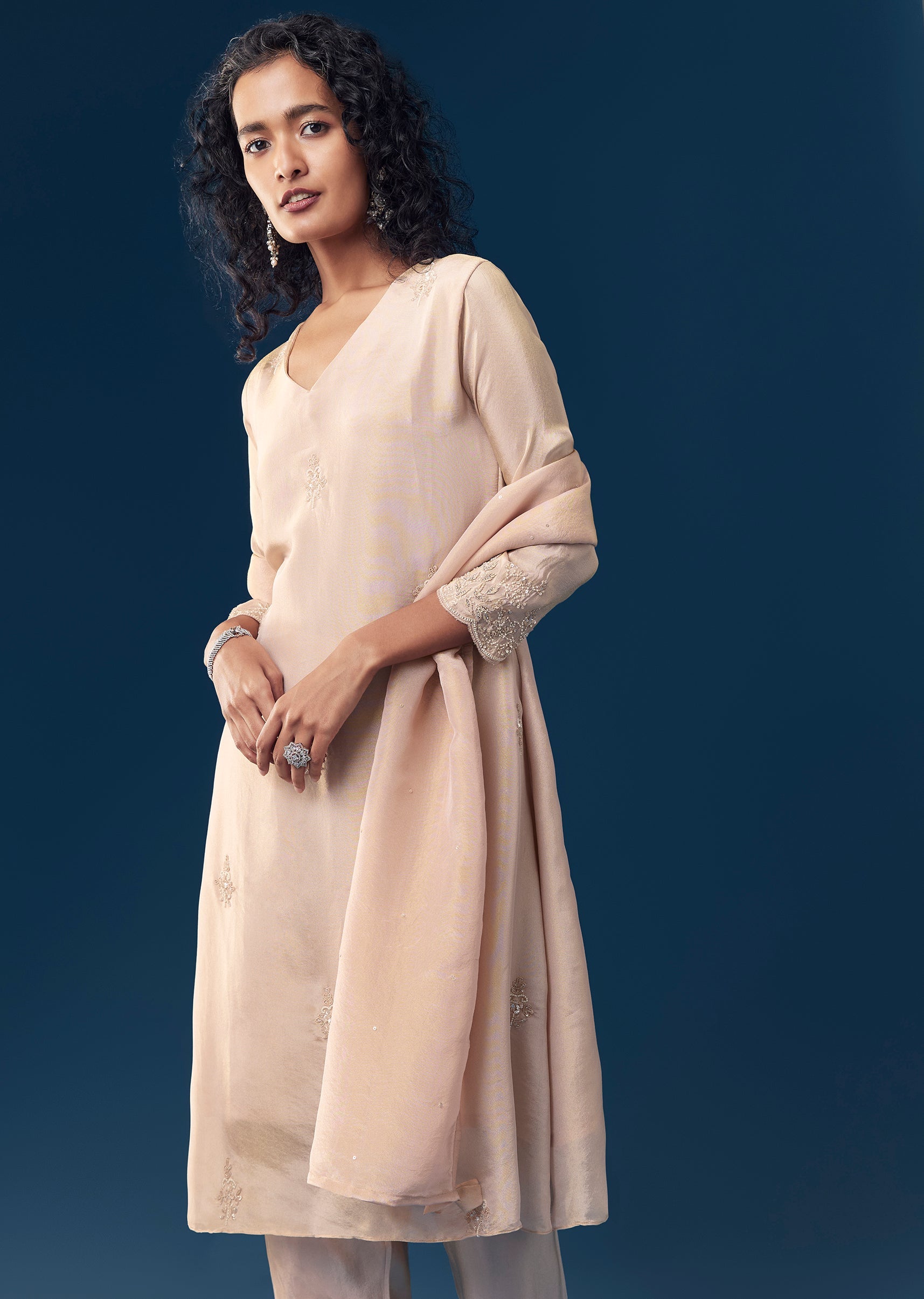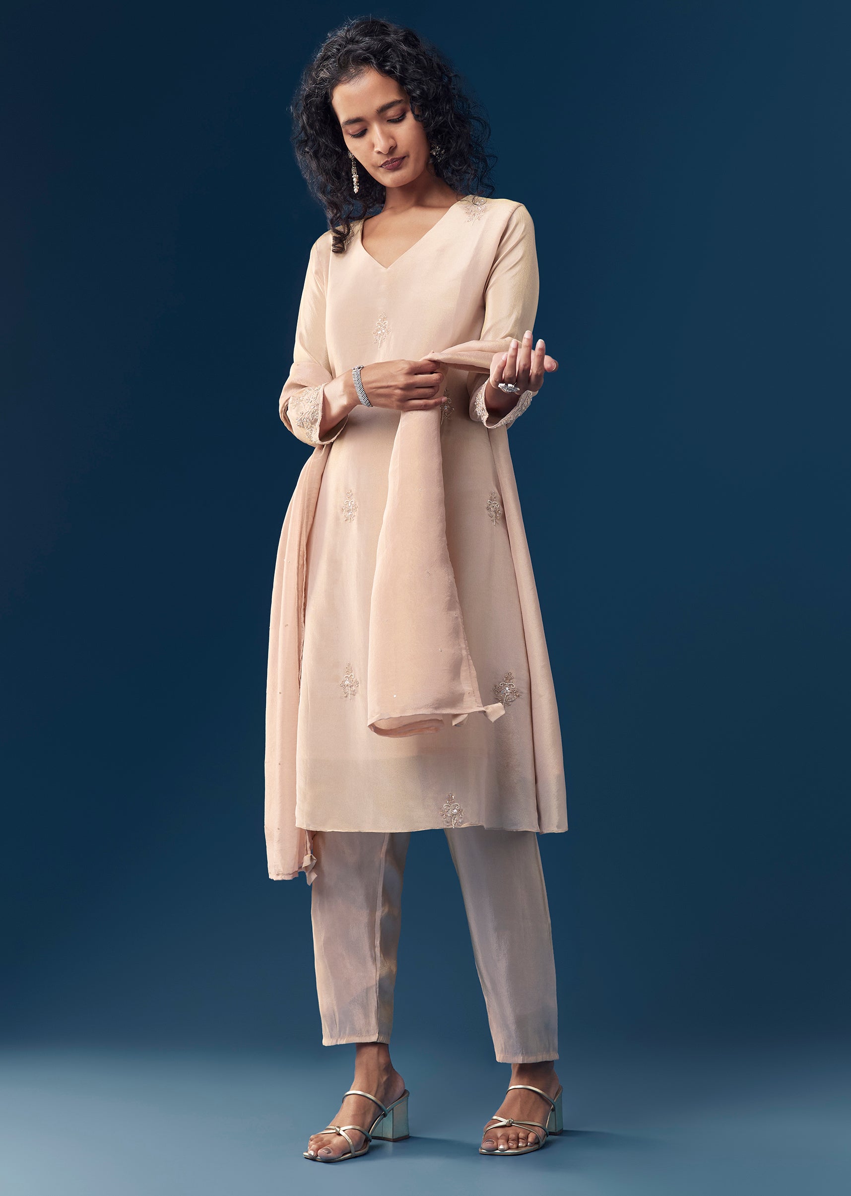 Style with pearl or kundan earrings and subtle metallic heels, keeping accessories light to complement the delicate butti work.