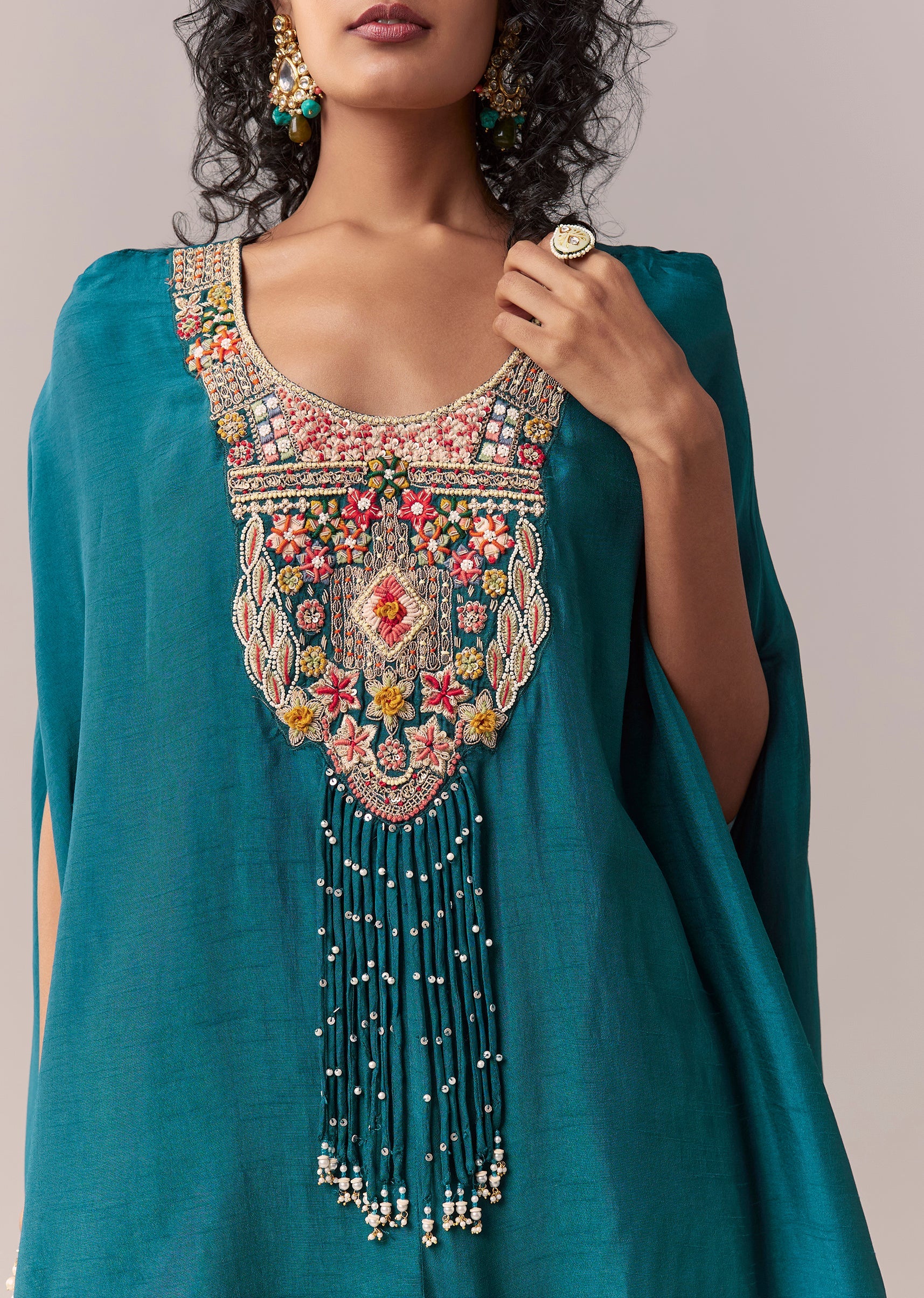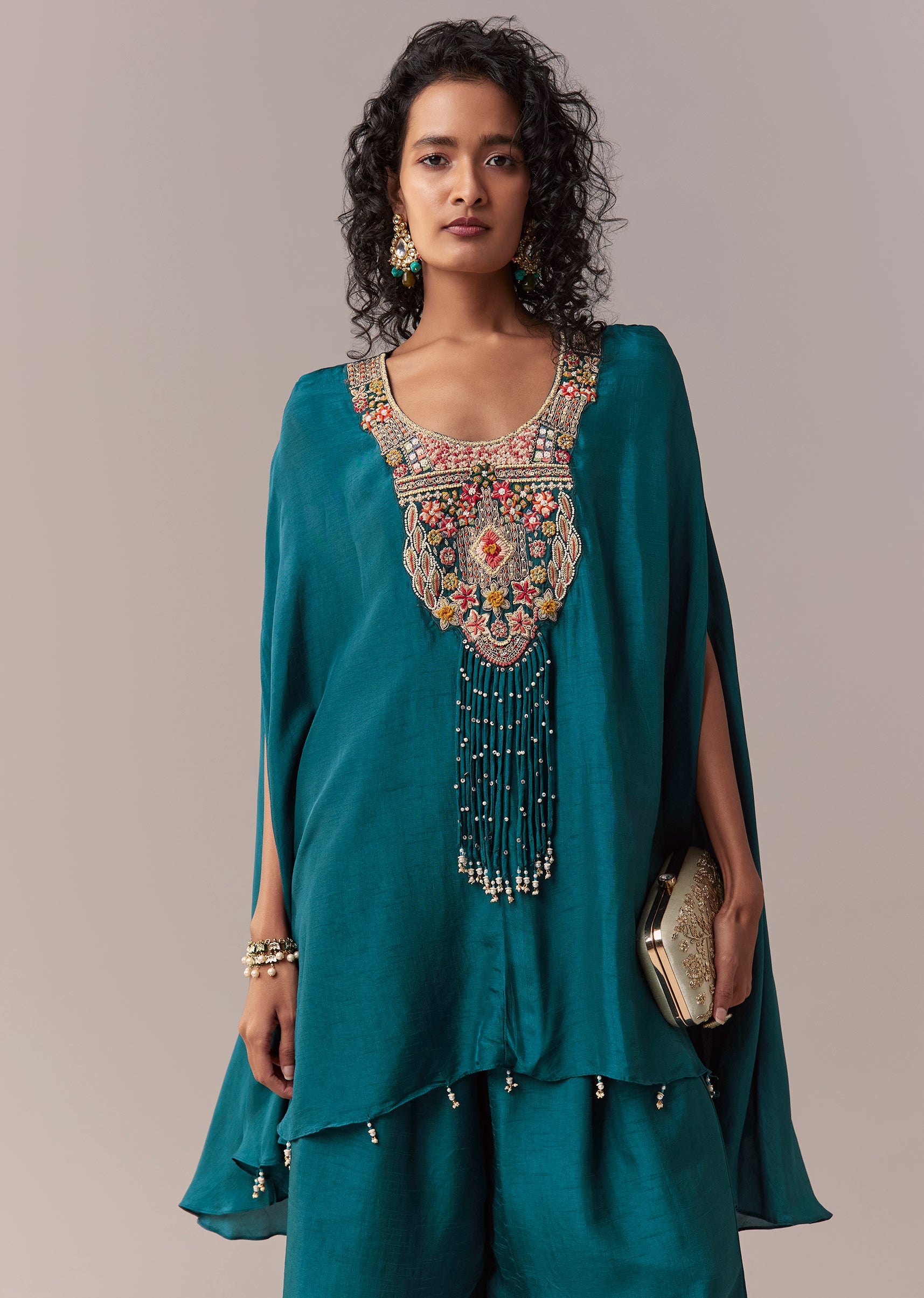 This contemporary co-ord set is crafted in smooth dola silk and designed to make a statement. Featuring a thread and moti embroidered cape layered over a matching inner, it is... More Product Details