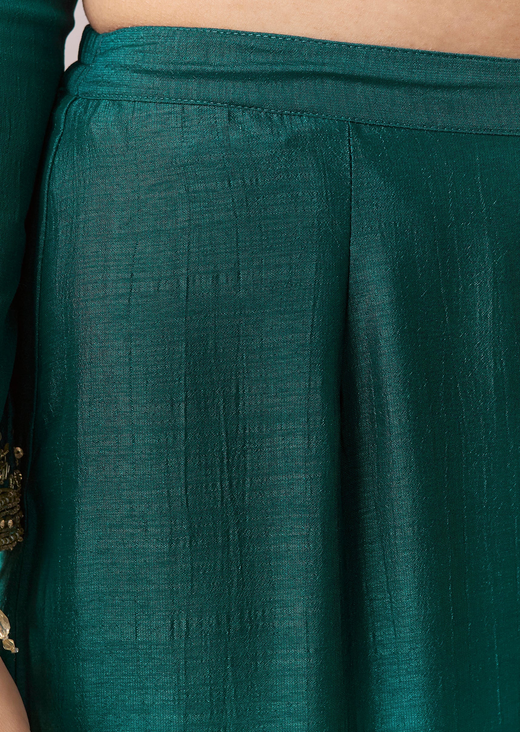 Crafted in pure silk, this peacock blue straight-fit kurta features intricate zardosi embroidery with a V-neckline and side slits. Paired with a flared sharara (mid-waist, partially elasticated) and a matching... More Product Details