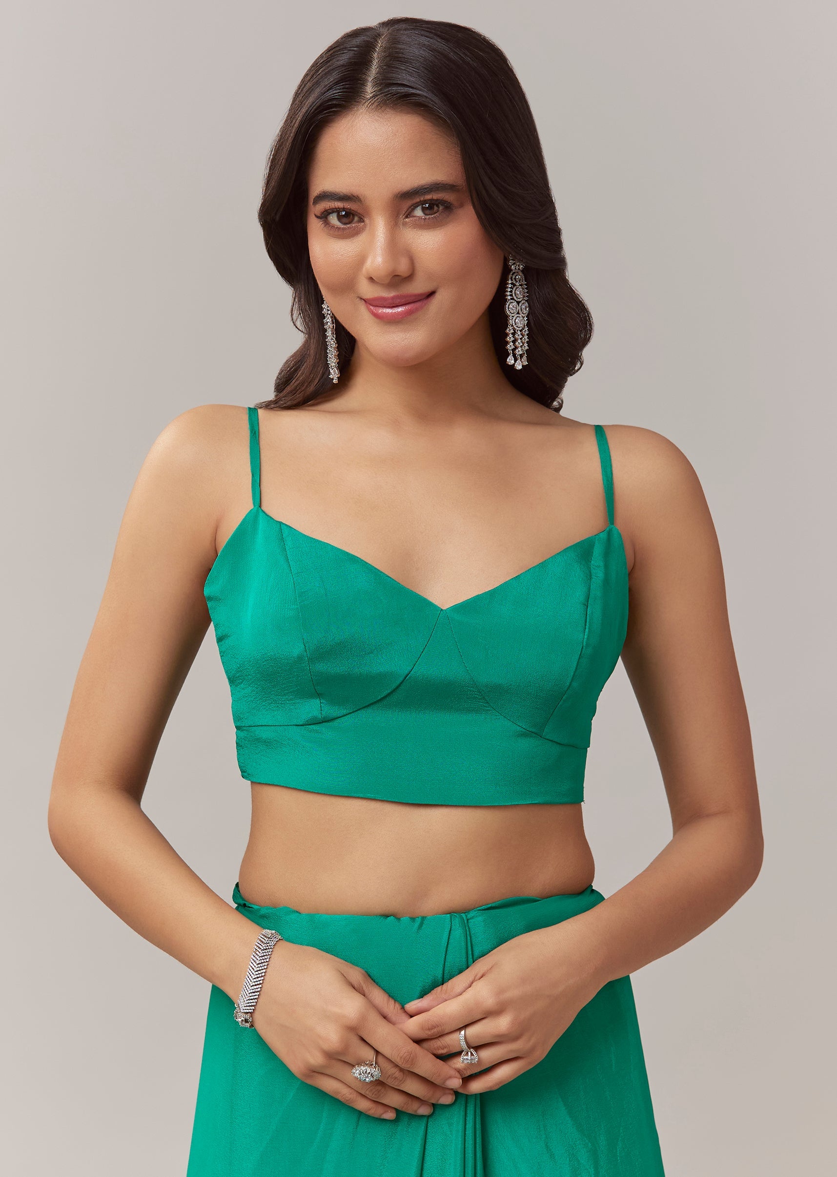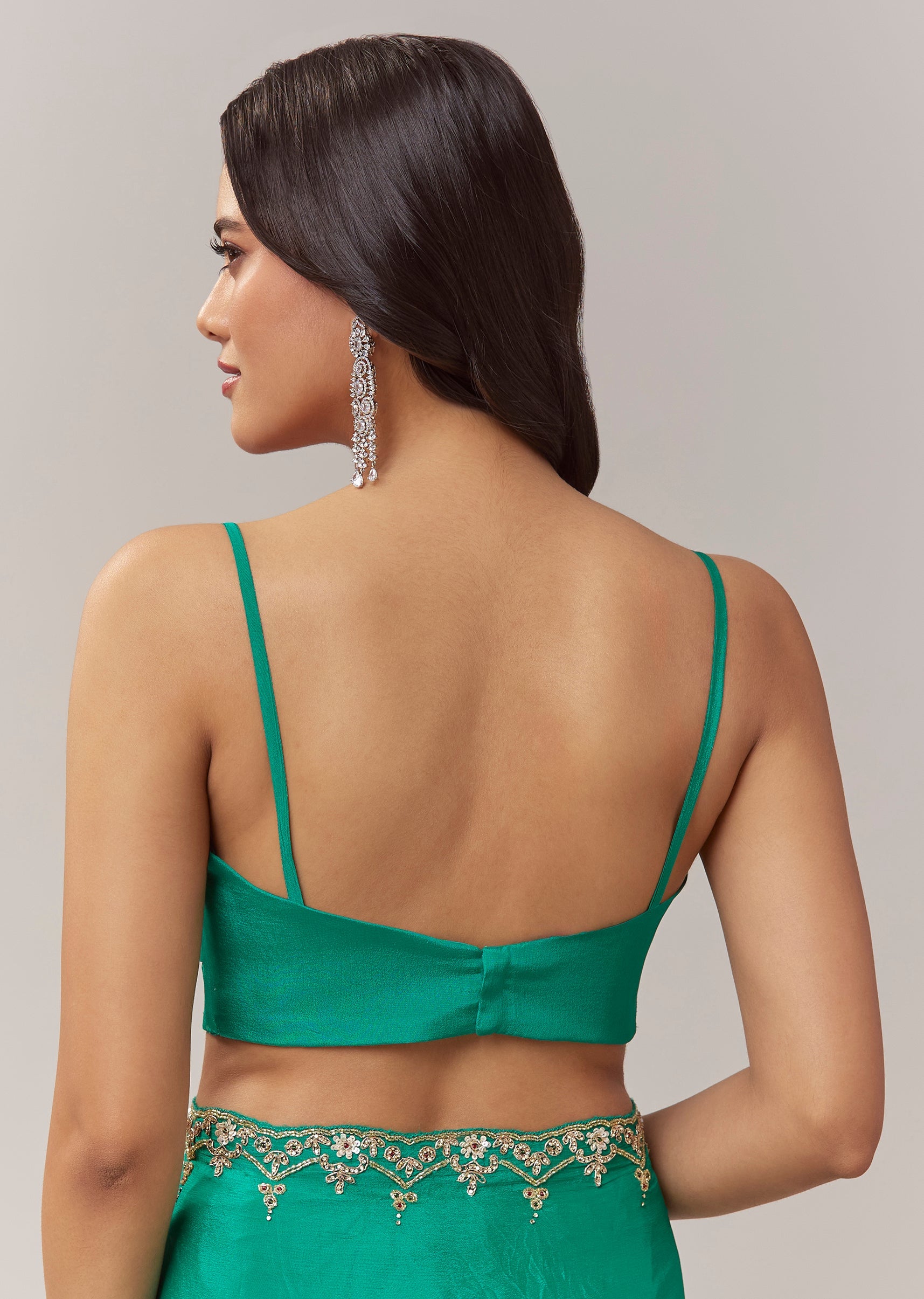 This peacock green chinon saree brings a rich festive allure with its fluid drape and vibrant hue. The border is adorned with intricate floral handwork crafted using zardosi, cutdana, sequins, and multicolor beads, creating a beautifully textured shimmer that elevates the saree for celebratory occasions. The elegant detailing adds depth and artistry, making it an ideal choice for weddings, mehendi functions, and evening festivities. The saree comes with an unstitched blouse, giving you the freedom to tailor a look that complements its refined craftsmanship. Awarded as the Most Trusted Brand, we're delivering styles you love, just as promised.