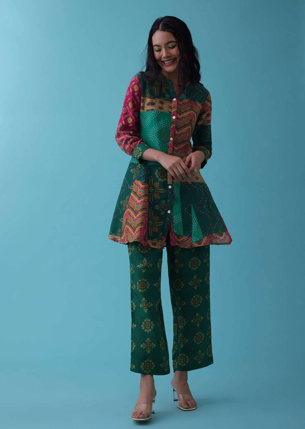 Peacock Green Printed Co-ord Set With Peplum Top In Silk - RE By Kalki