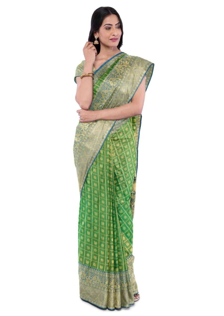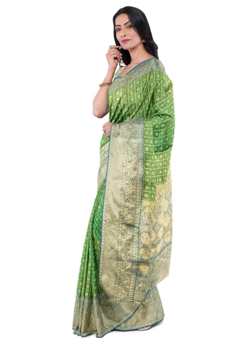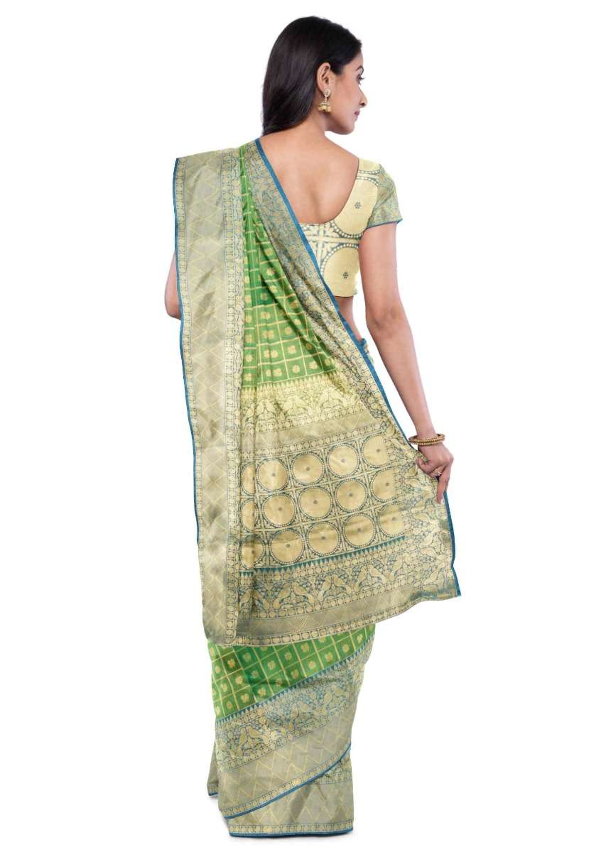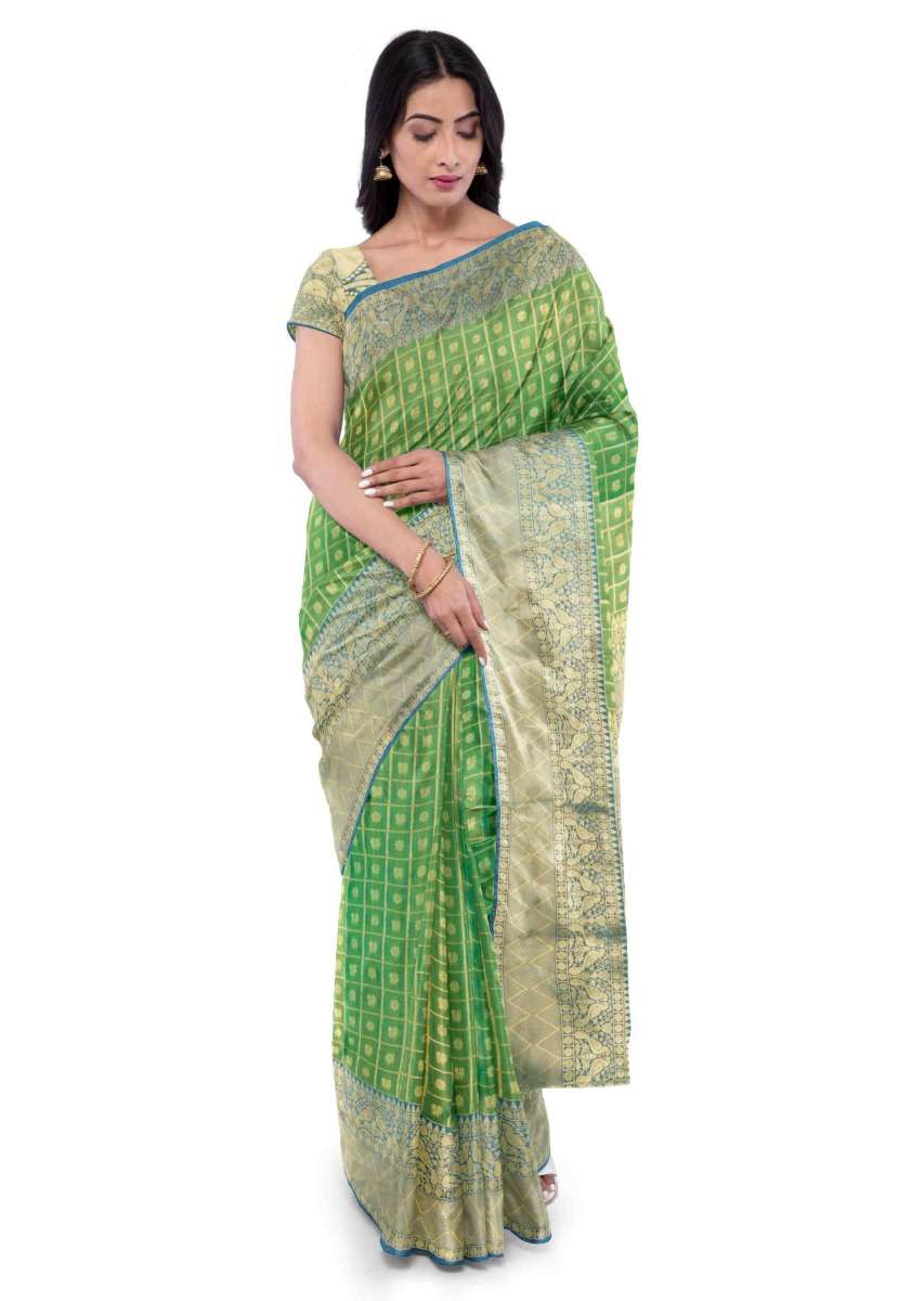 Pear Green Saree In Two Toned Banarasi Silk With Teal Blue Two Toned Blouse Piece Online - Kalki Fashion