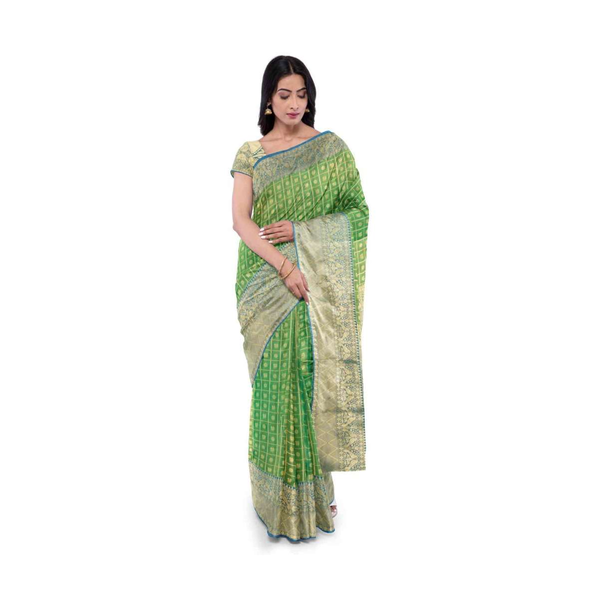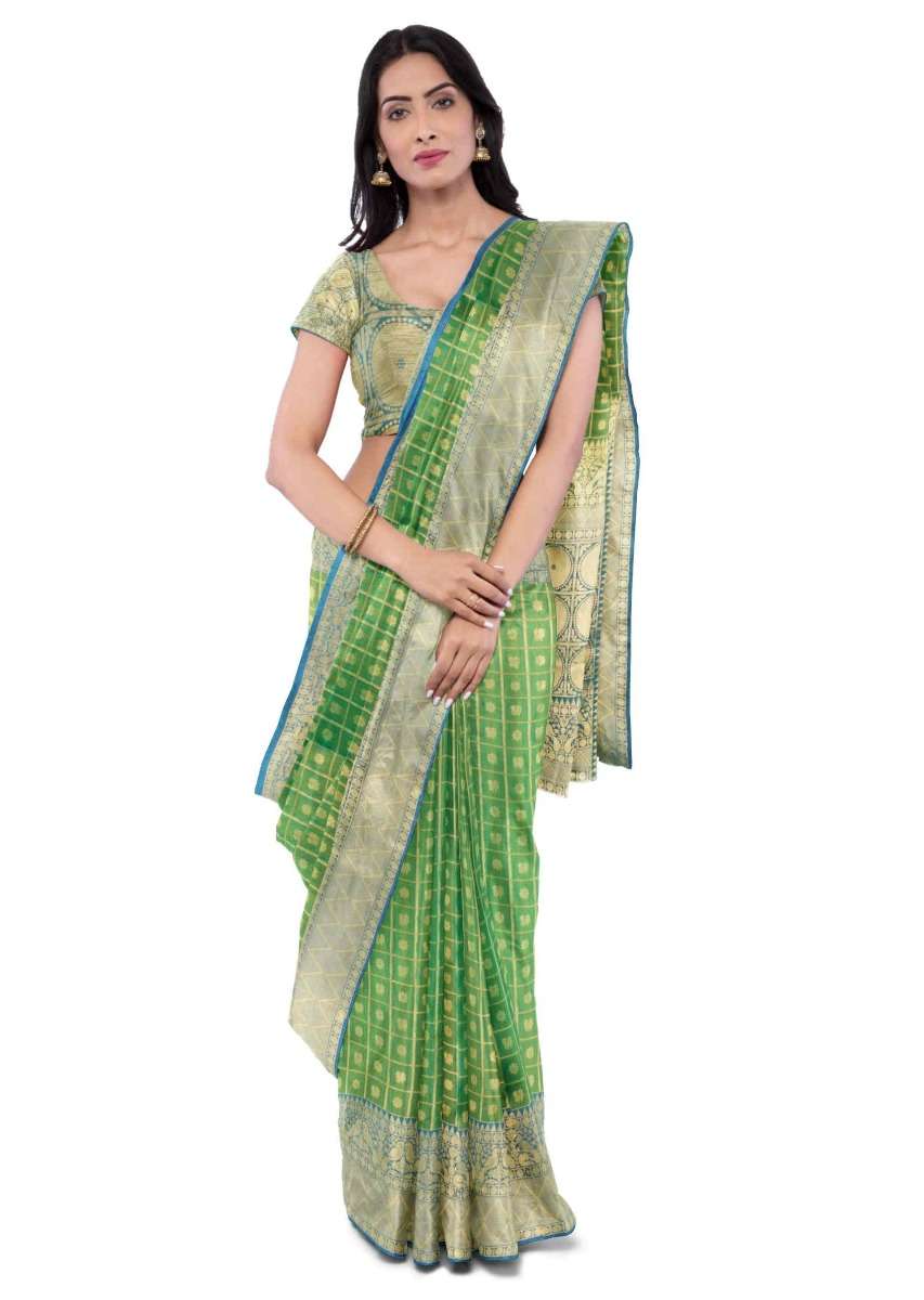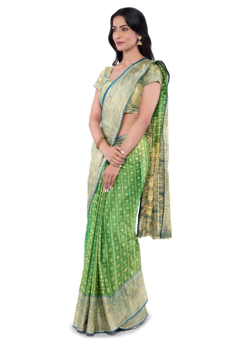 Pear Green Saree In Two Toned Banarasi Silk With Teal Blue Two Toned Blouse Piece Online - Kalki Fashion