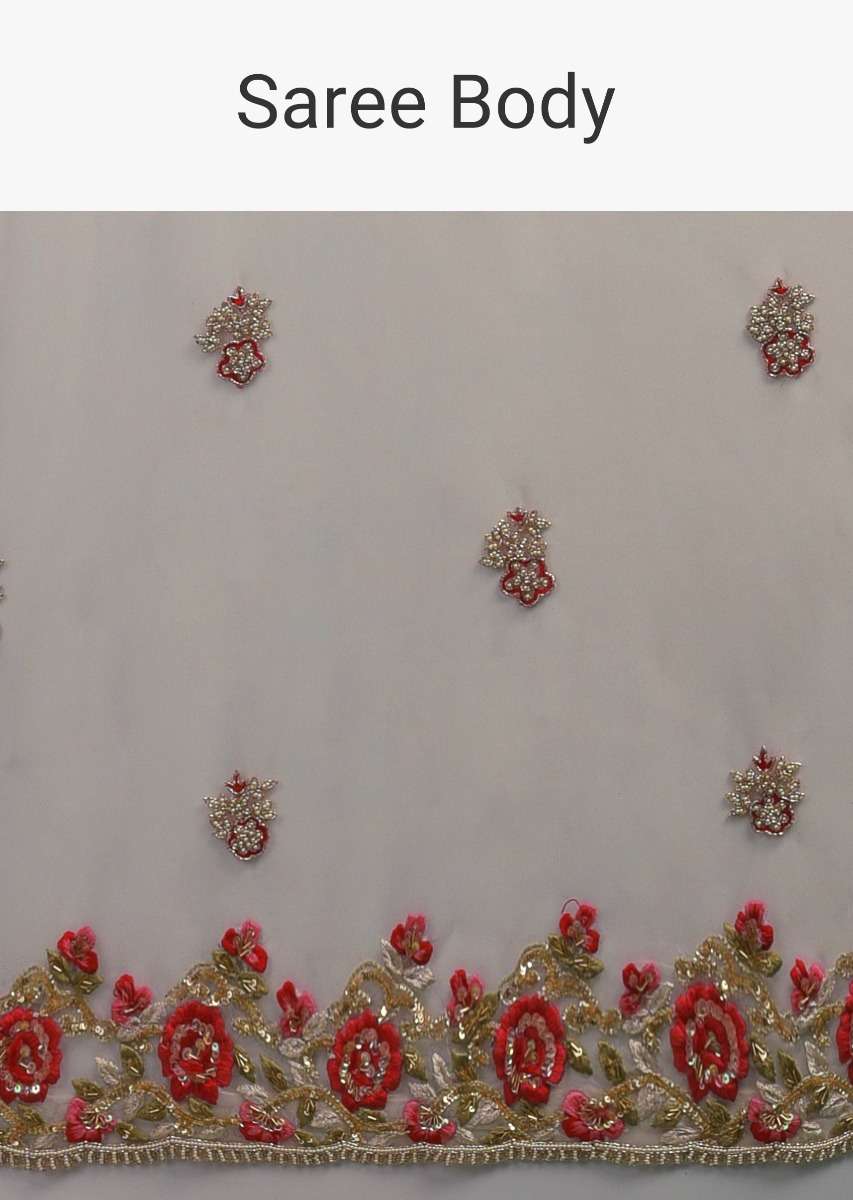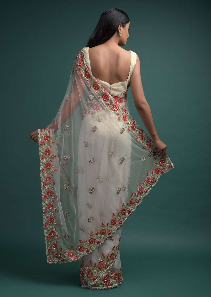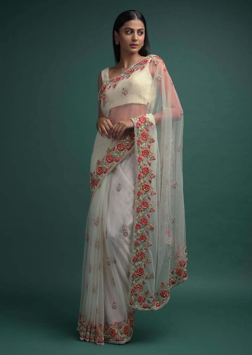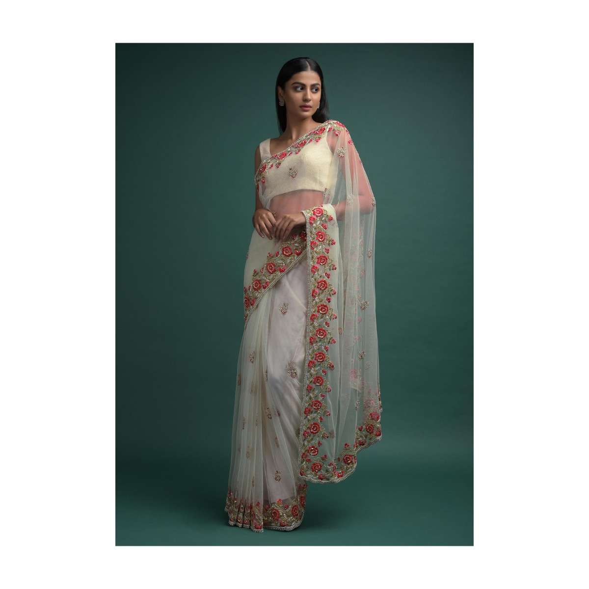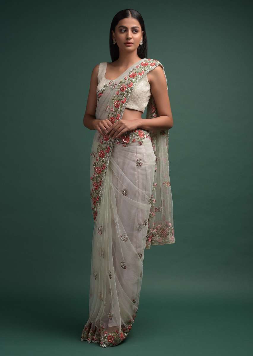 Pearl White Saree In Net Adorned With Resham Embroidered Floral Buttis And Border Online - Kalki Fashion