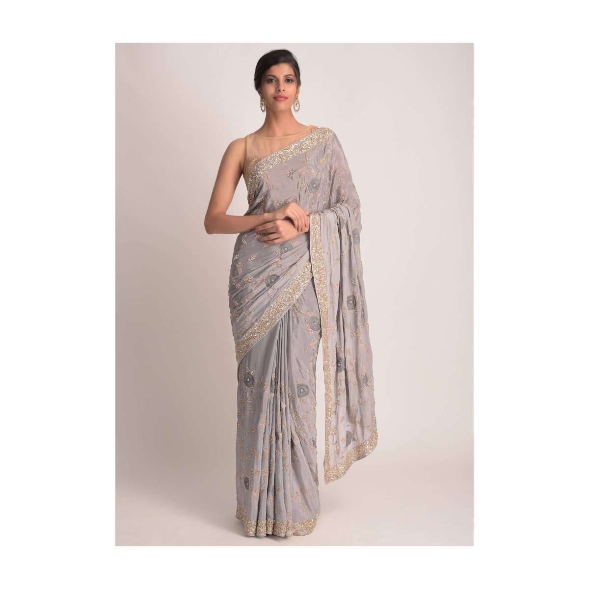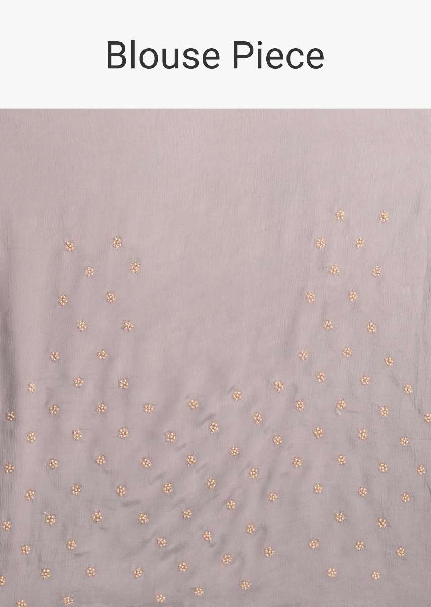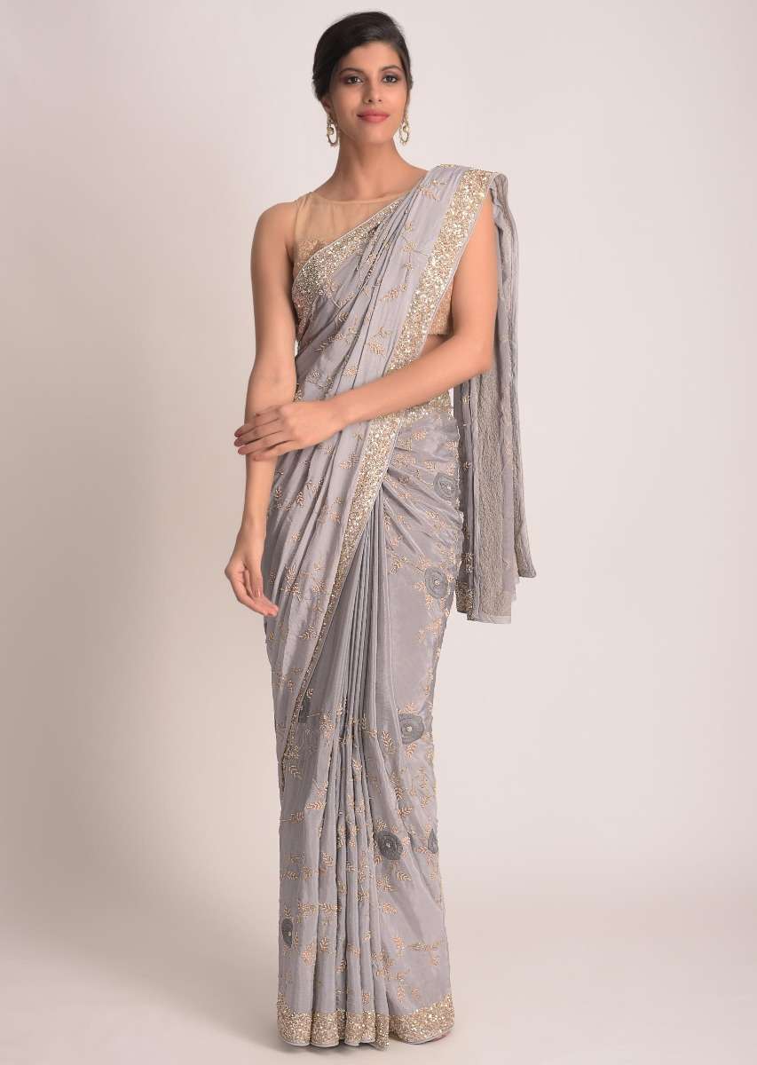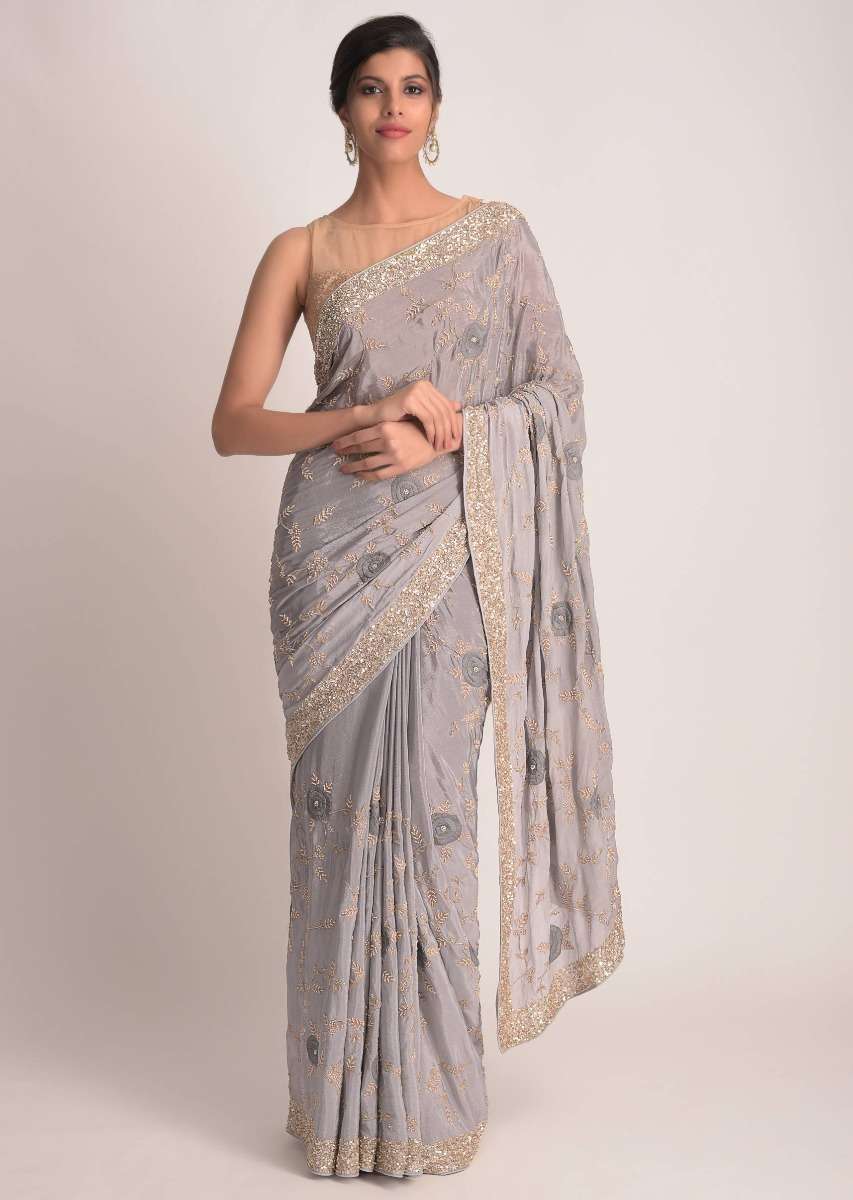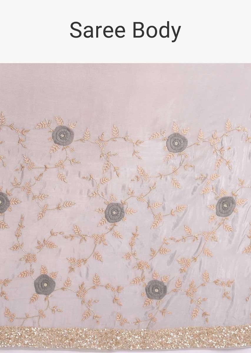 Pewter Grey Saree In Ombre Shaded Chiffon With 3D Floral Applique Online - Kalki Fashion