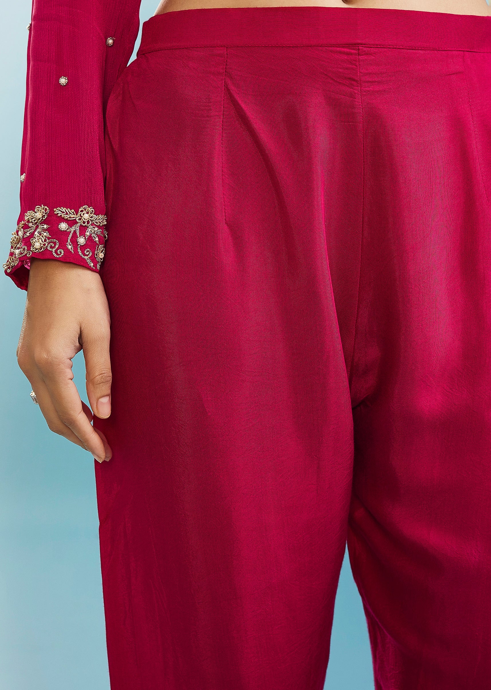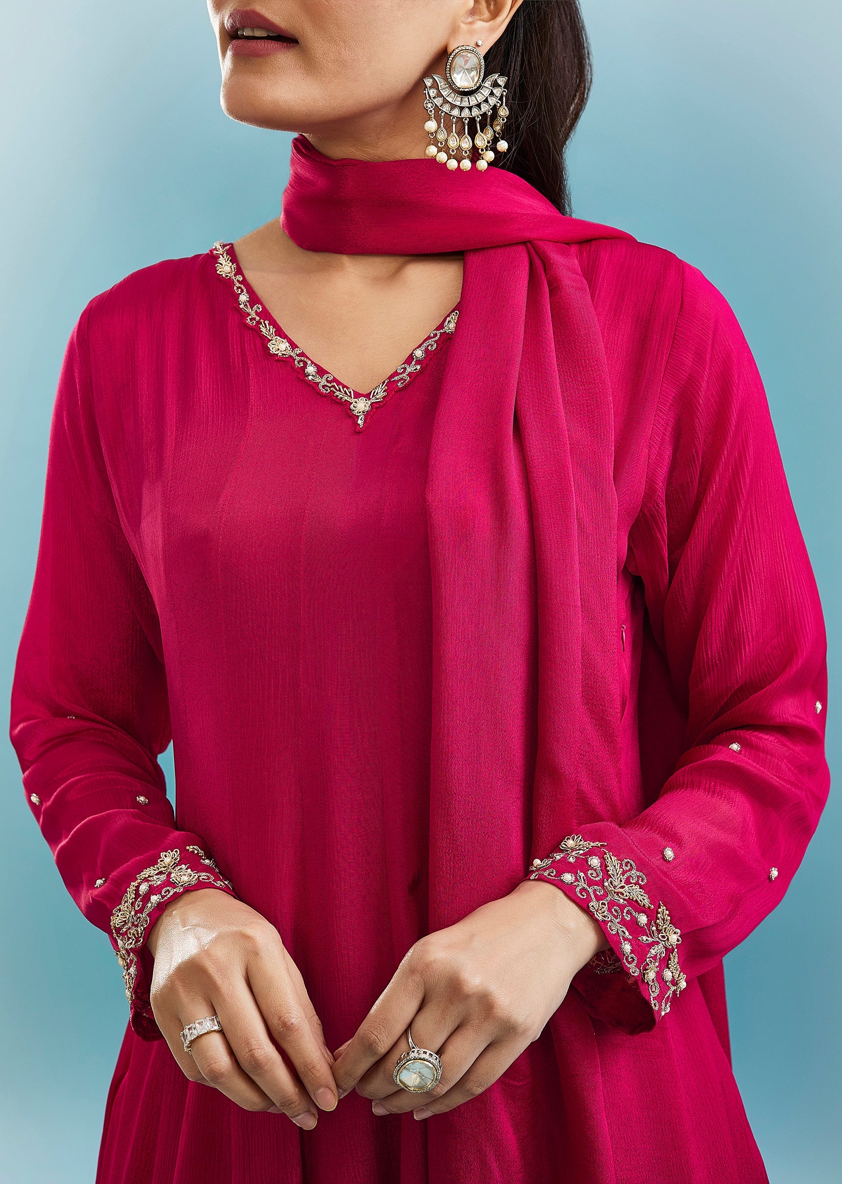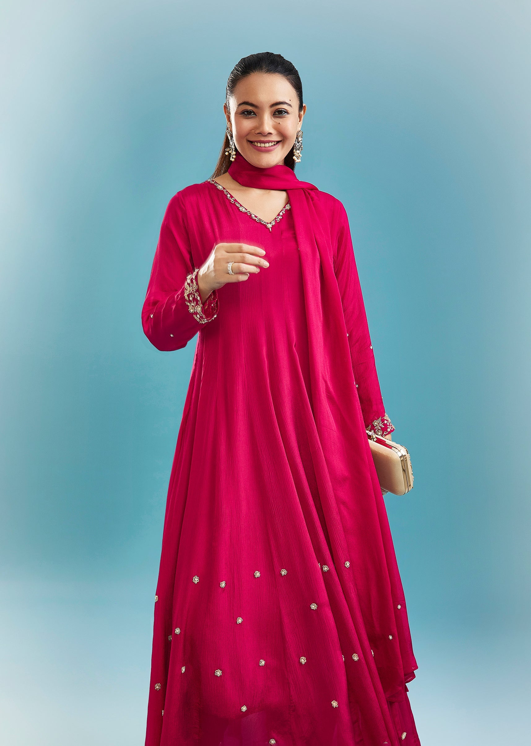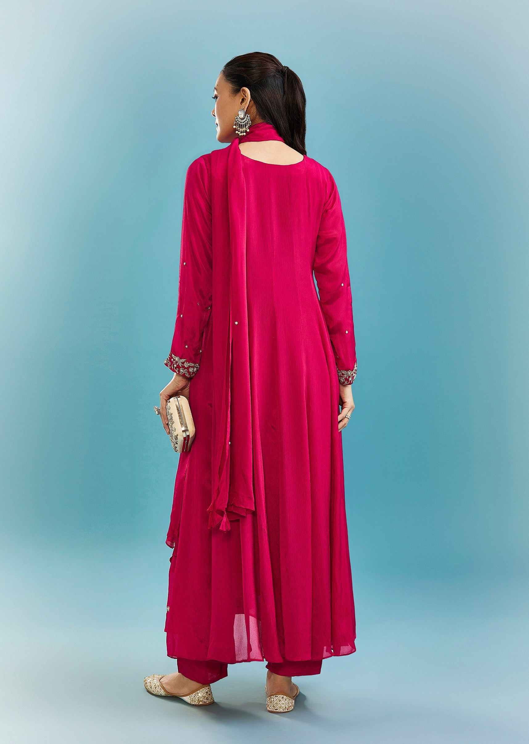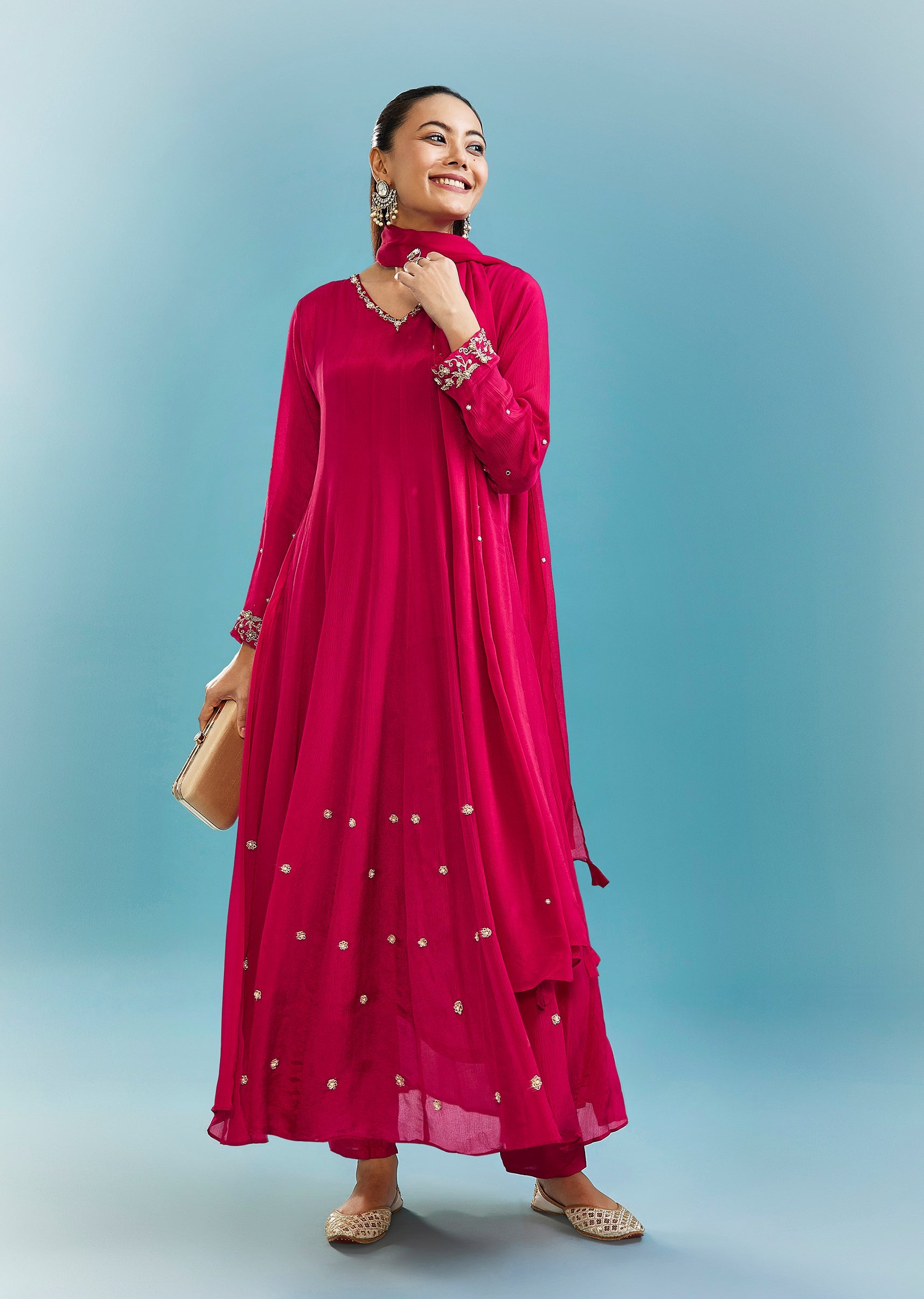 Rich and refined, this pink anarkali set is adorned with intricate zardosi work that adds depth and opulence. The full-sleeve silhouette makes it perfect for evening celebrations. Awarded as the... More Product Details