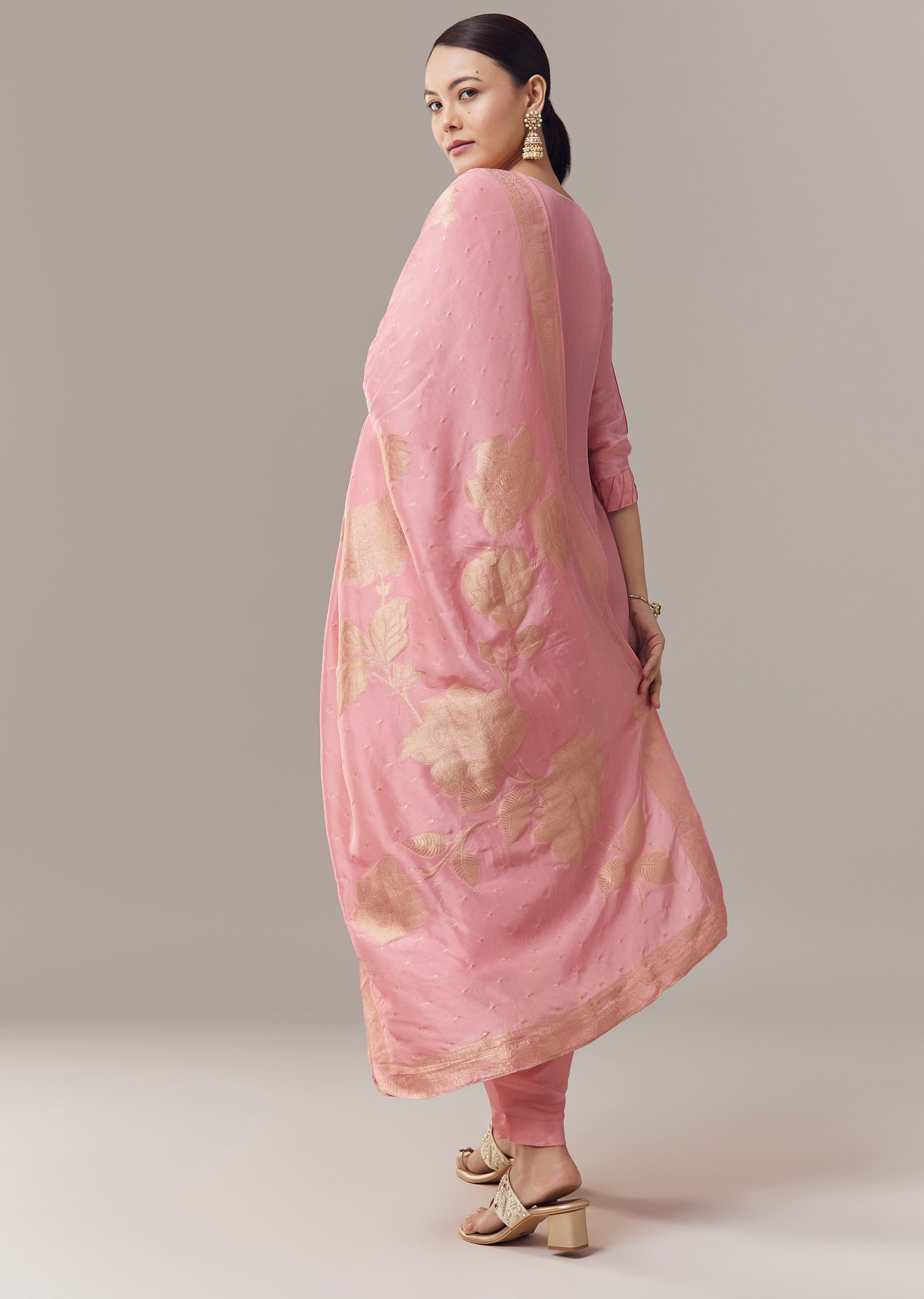 Pair it with metallic juttis and minimal jewellery to highlight the zardosi detailing and maintain a festive look.