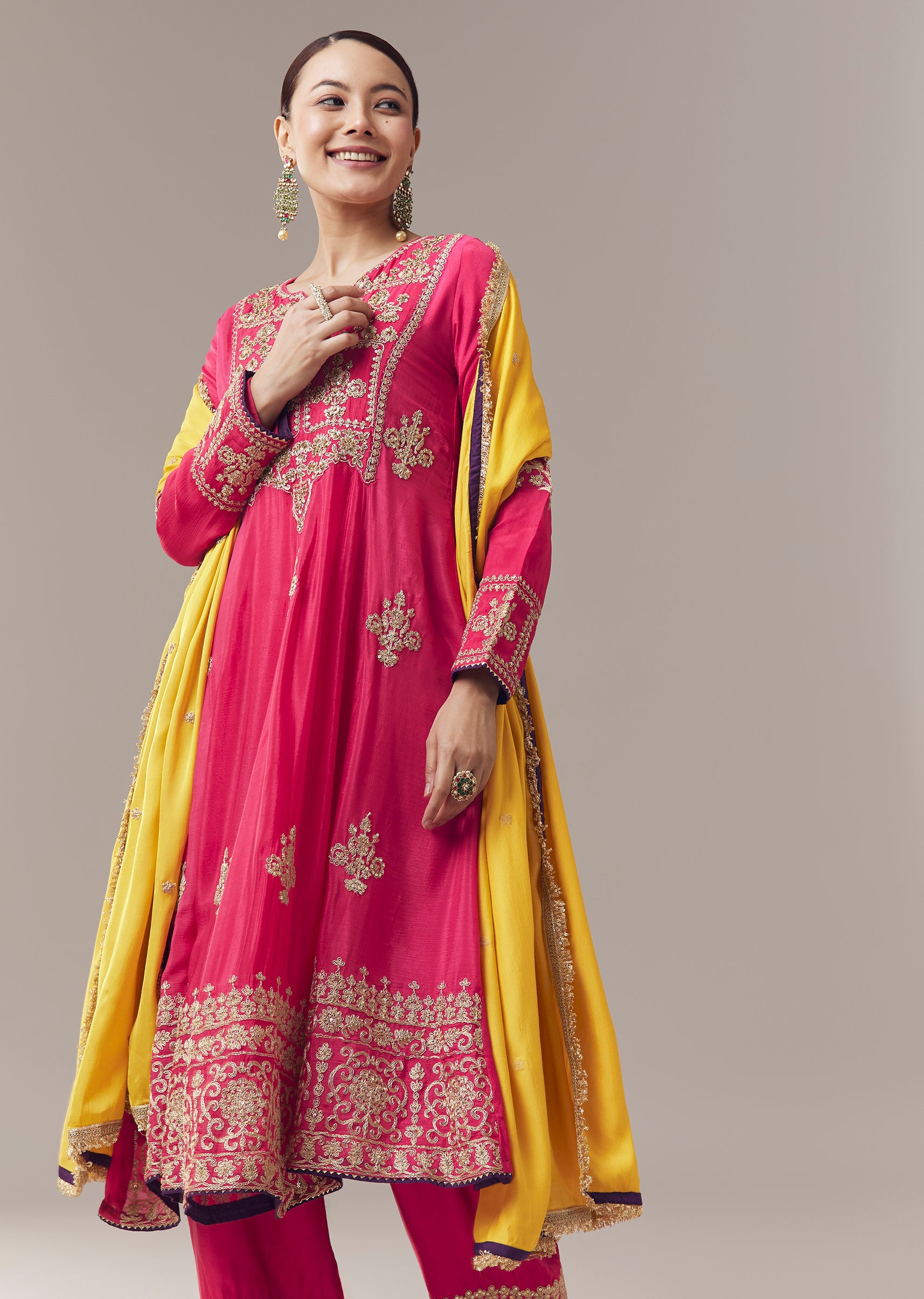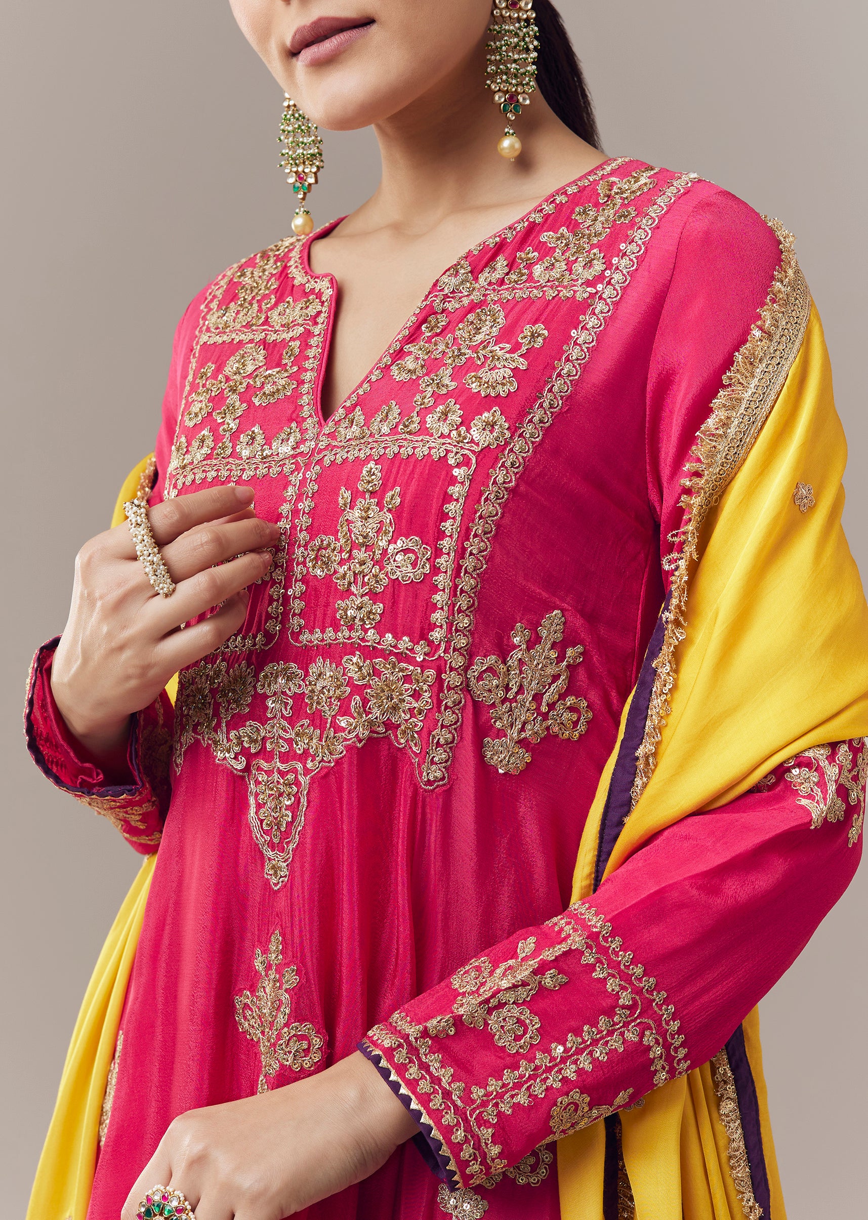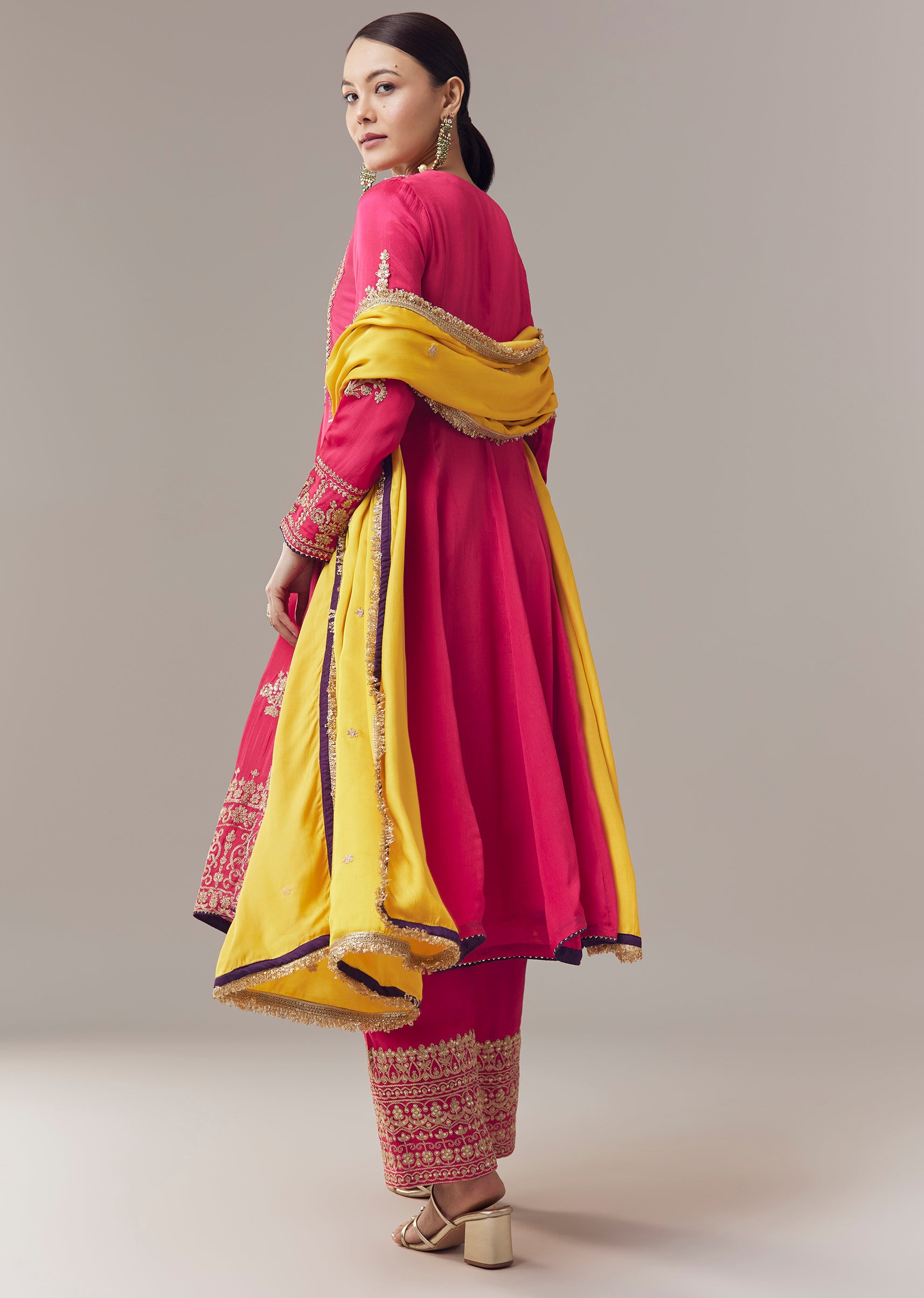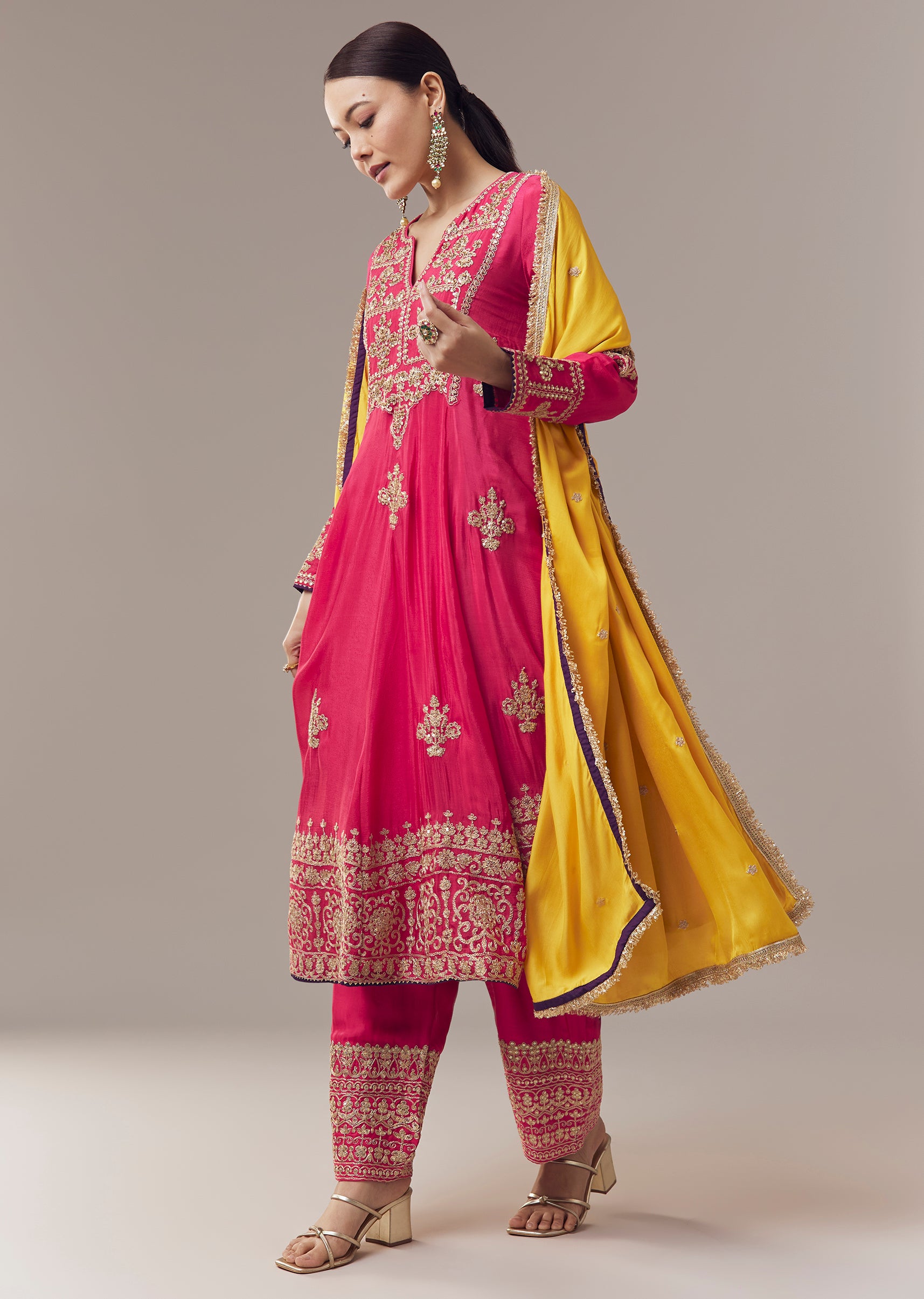 Vibrant and festive, this pink anarkali suit is crafted in soft chinon fabric for a lightweight and elegant feel. The kurta is adorned with intricate zari, cut dana, and... More Product Details