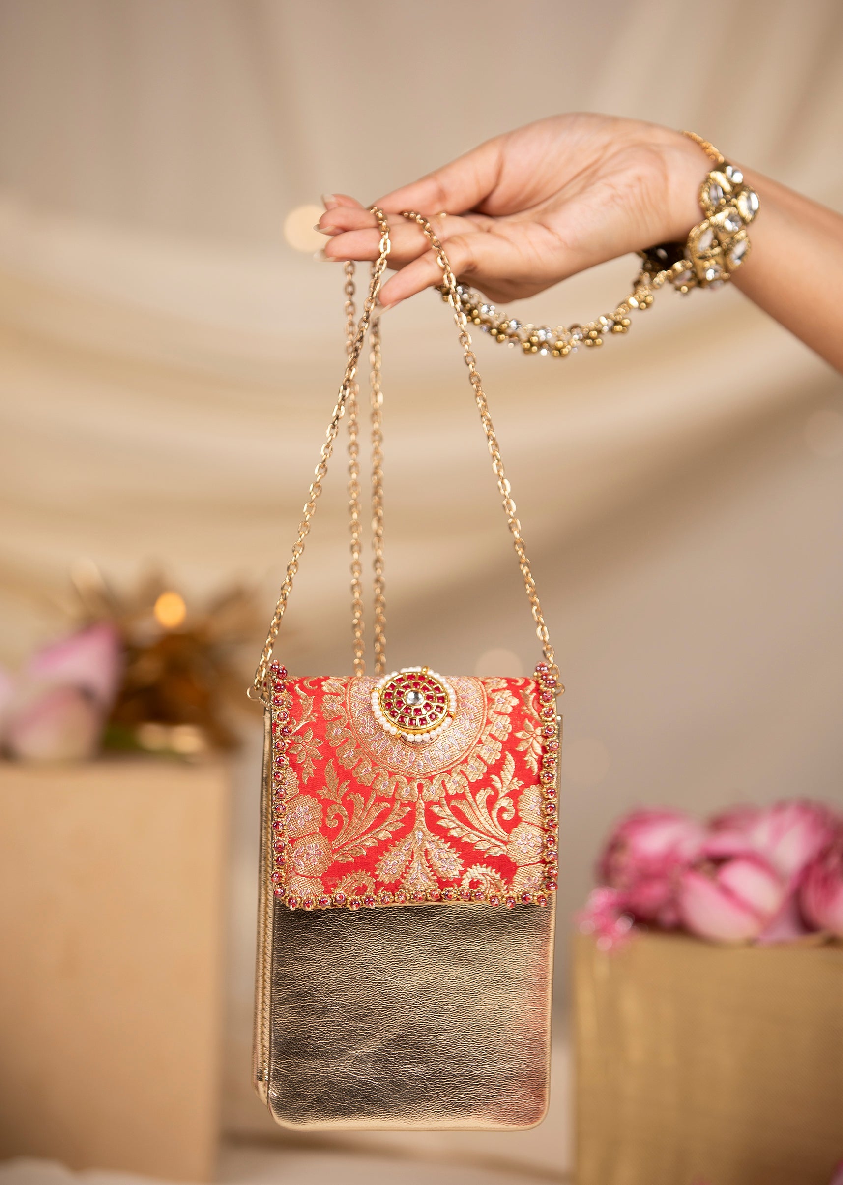 Pair with Kundan jewelry or gold accents to echo the bag’s ornate detailing.