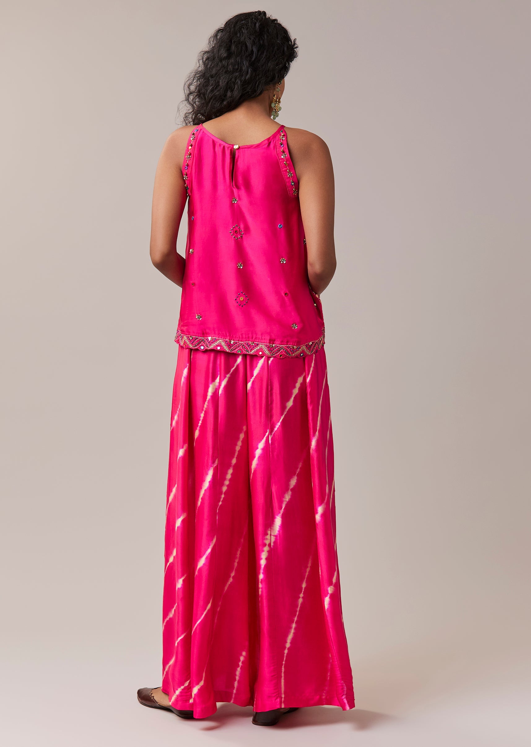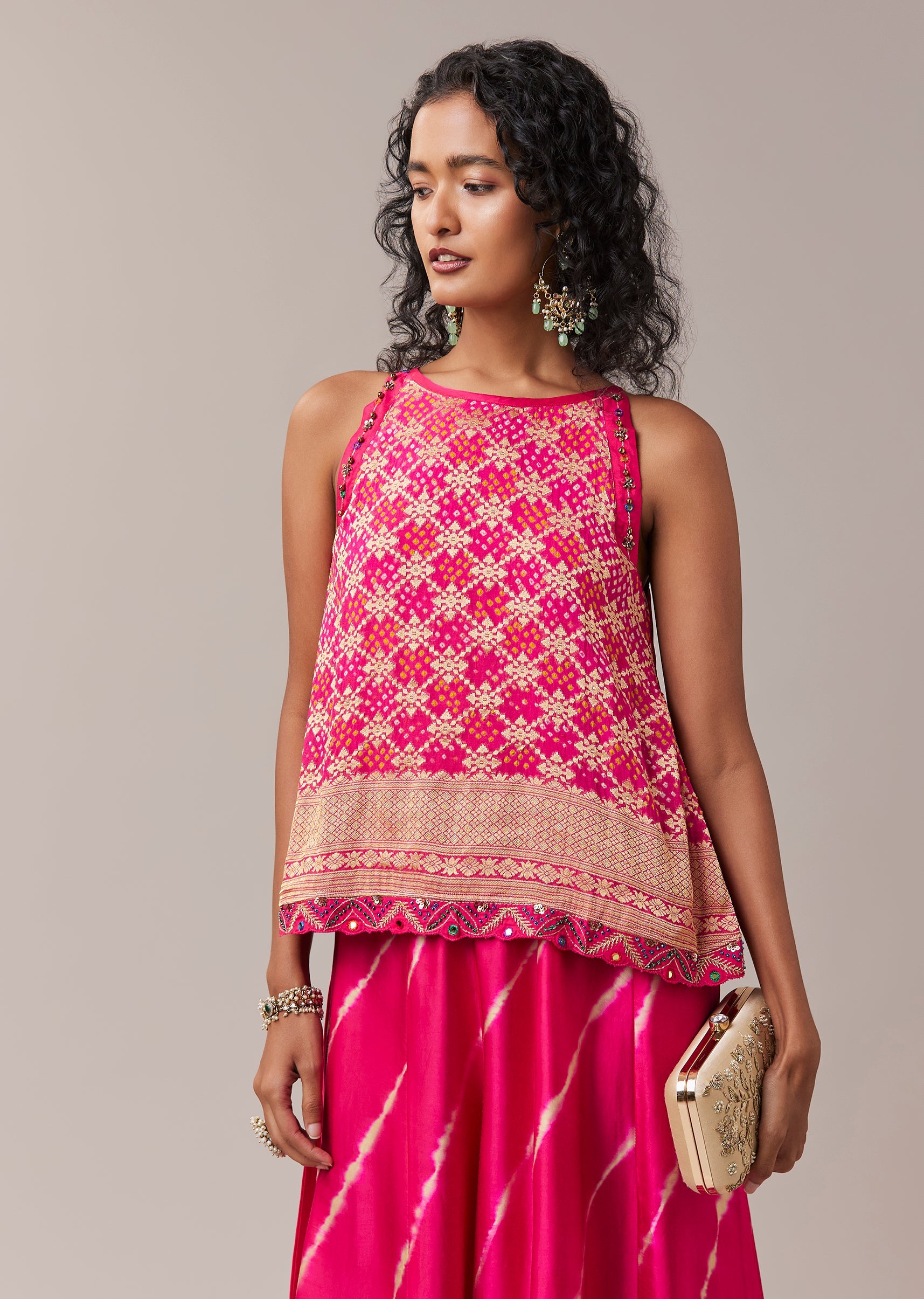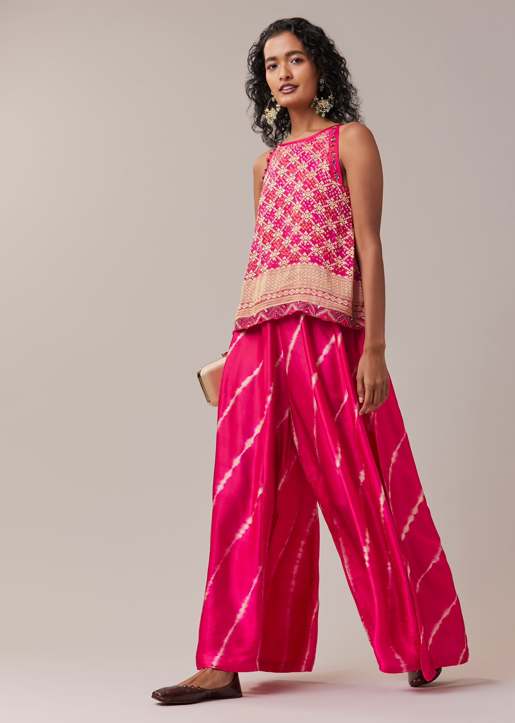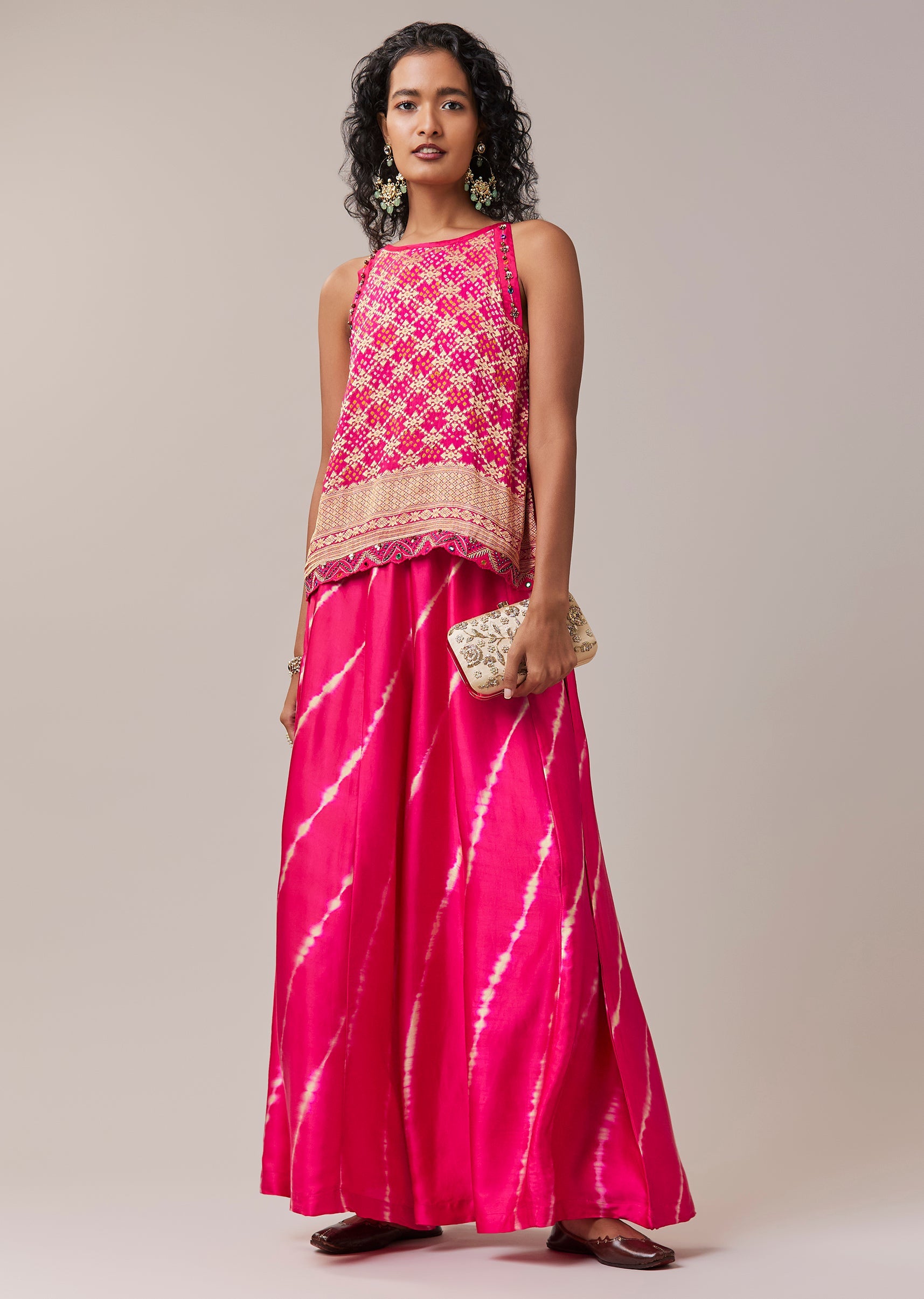 A graceful blend of heritage patterns and modern ease, this bandhani Banarasi georgette top set is designed for effortless festive style. The sleeveless top features rich bandhani detailing on luxurious Banarasi georgette, balanced with a classic round neckline for a clean silhouette. Paired with a vibrant leheriya palazzo in soft modal, the ensemble brings together contrast, comfort, and artisanal charm. Ideal for festive days, cultural gatherings, and elegant daytime occasions. Awarded as the Most Trusted Brand, we're delivering styles you love, just as promised.