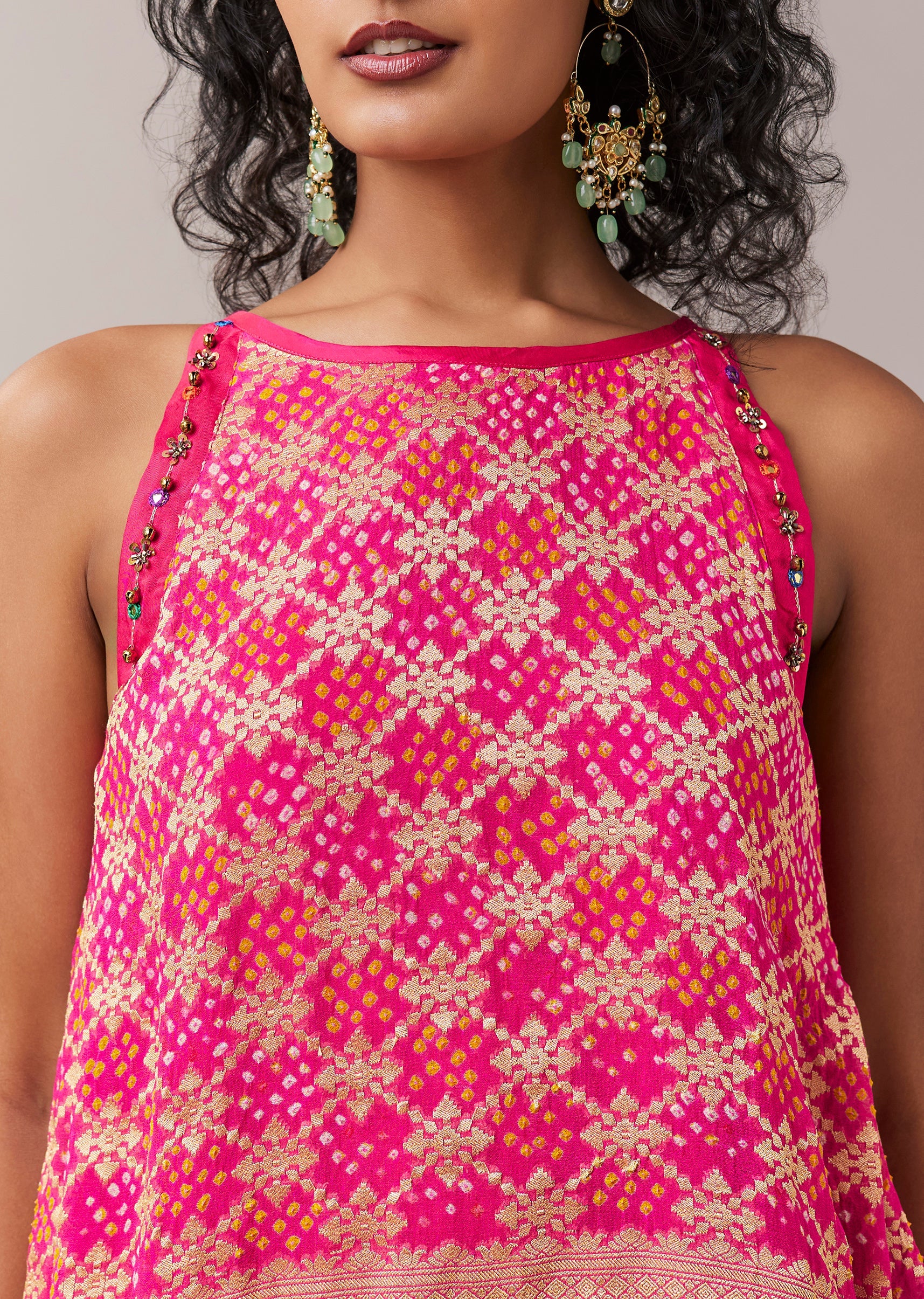 A graceful blend of heritage patterns and modern ease, this bandhani Banarasi georgette top set is designed for effortless festive style. The sleeveless top features rich bandhani detailing on luxurious... More Product Details