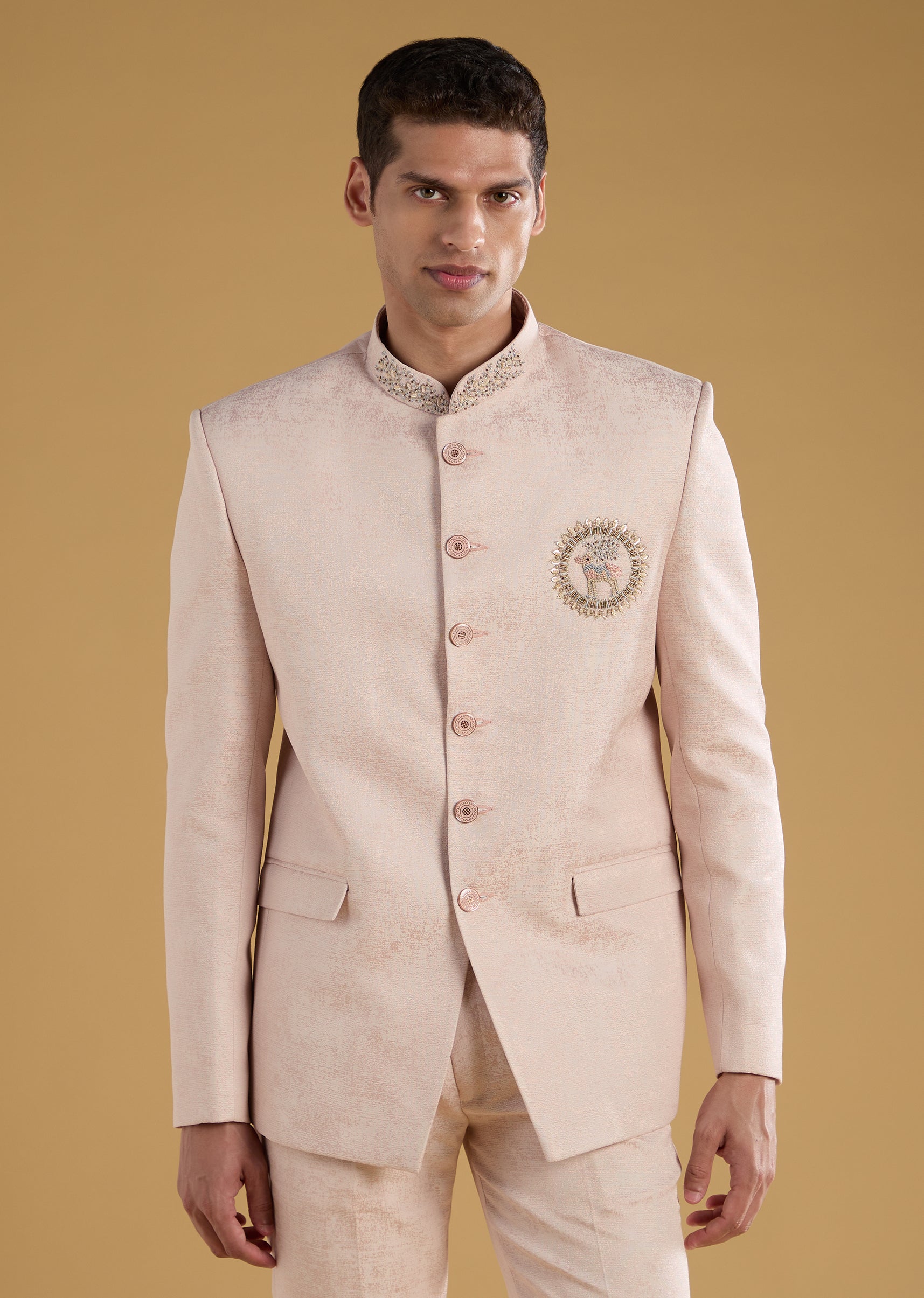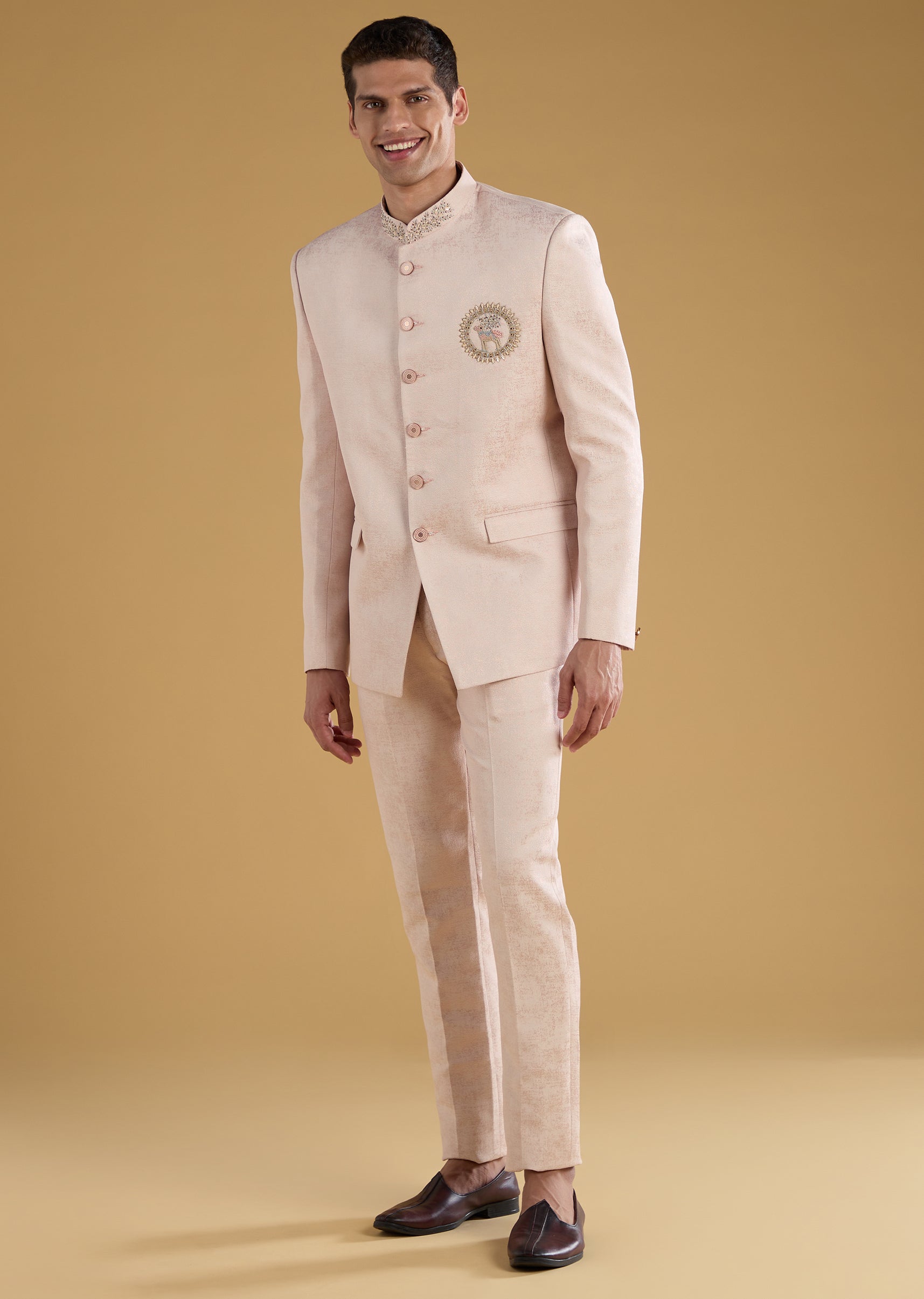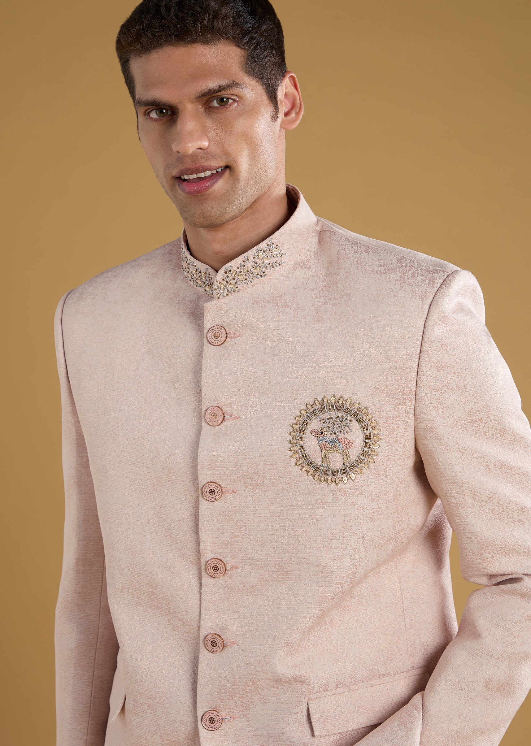 Drape yourself in refined elegance with this pink Jodhpuri set crafted from luxurious imported fabric and highlighted with delicate resham embroidery. The soft hue paired with the structured silhouette creates a perfect balance of regality and modern charm. Its finely tailored jacket, complemented by sleek matching pants, makes this ensemble ideal for engagement functions, festive evenings, or daytime wedding celebrations. Awarded as the Most Trusted Brand, we're delivering styles you love, just as promised.