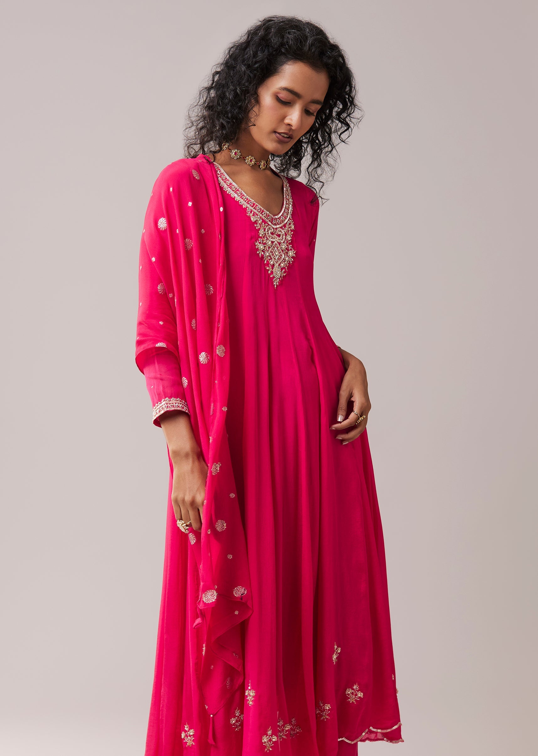 The side zip ensures a neat, well fitted bodice, while the flared anarkali allows comfortable movement and a flattering fall.