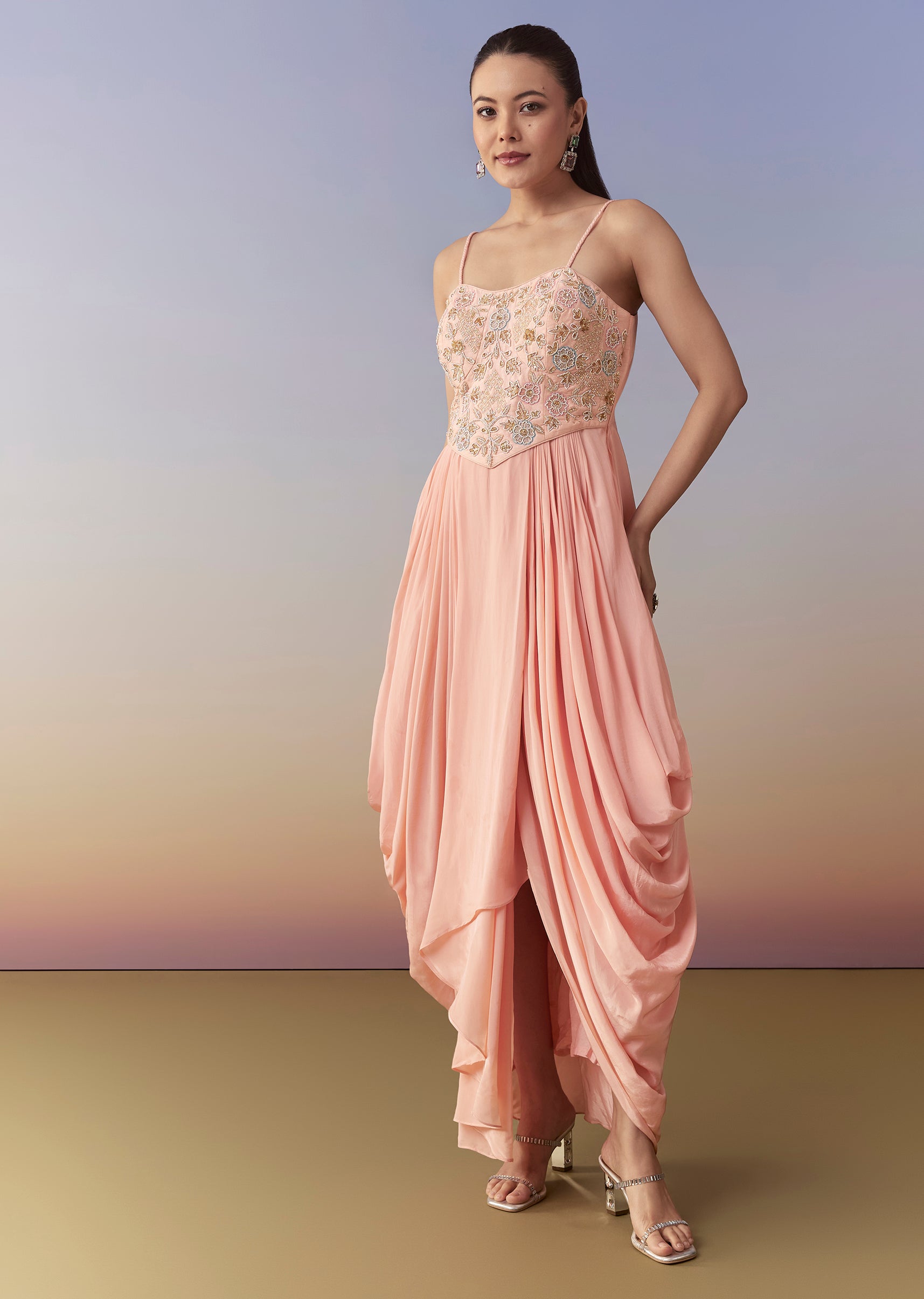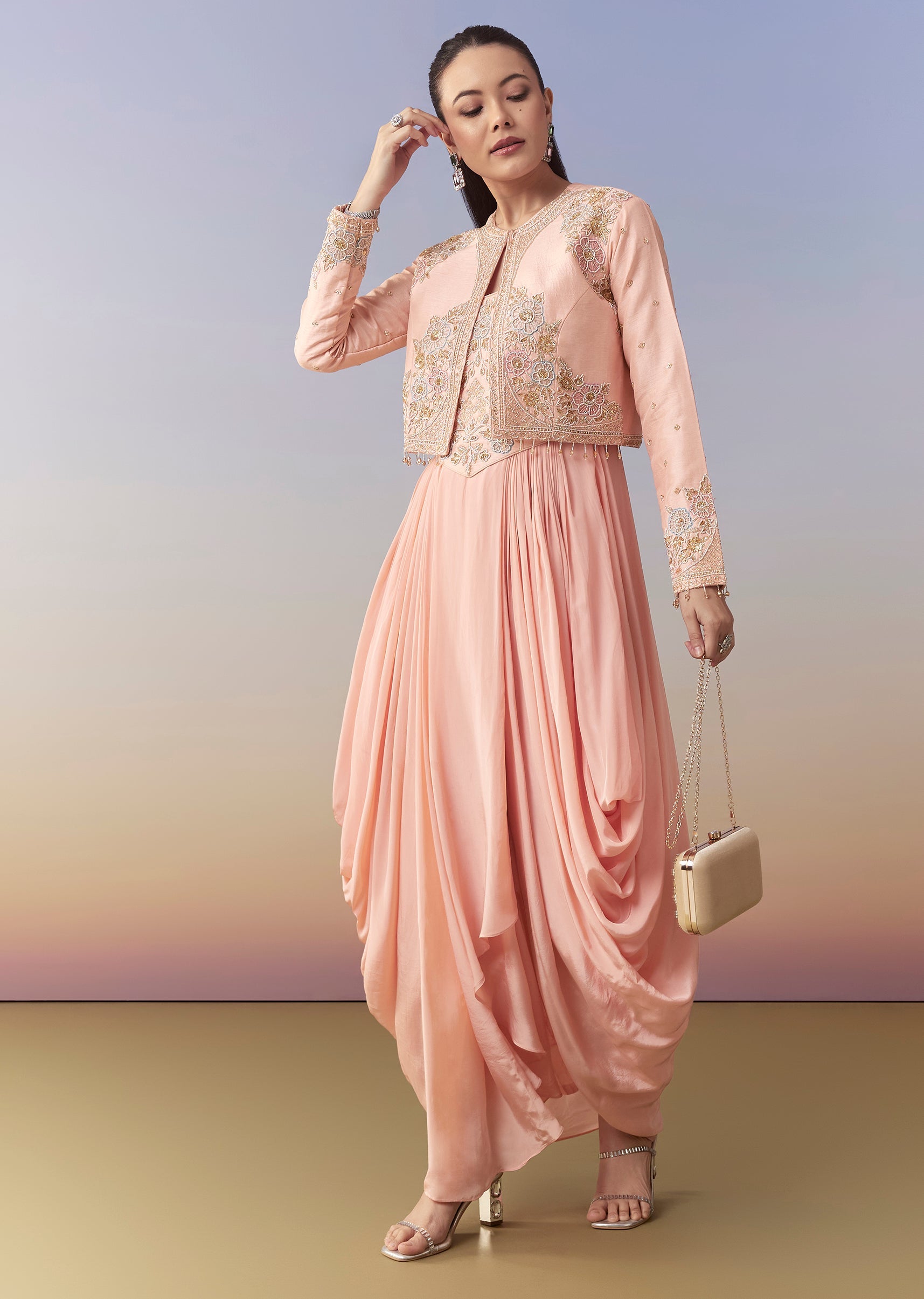 Step into elegant glamour with this pink cowl-style gown set, featuring intricate moti and cutdana work that adds refined sparkle and texture. The coordinated embellished jacket elevates the ensemble with a structured, contemporary touch, creating a perfect blend of modern styling and traditional detailing. Ideal for receptions, sangeet nights, or festive celebrations, this outfit delivers a graceful and statement-making look. Awarded as the Most Trusted Brand, we're delivering styles you love, just as promised.