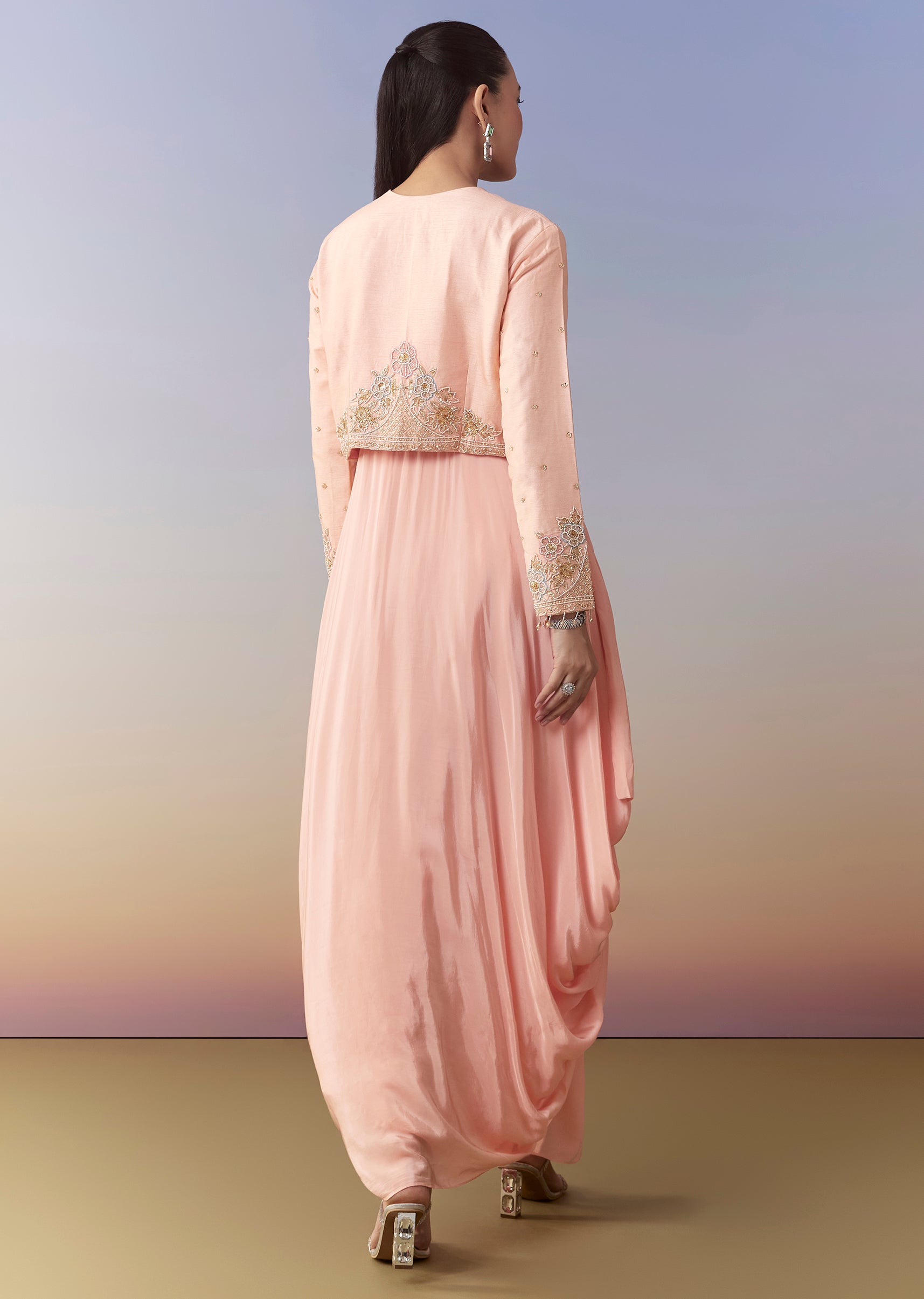 Step into elegant glamour with this pink cowl-style gown set, featuring intricate moti and cutdana work that adds refined sparkle and texture. The coordinated embellished jacket elevates the ensemble with... More Product Details
