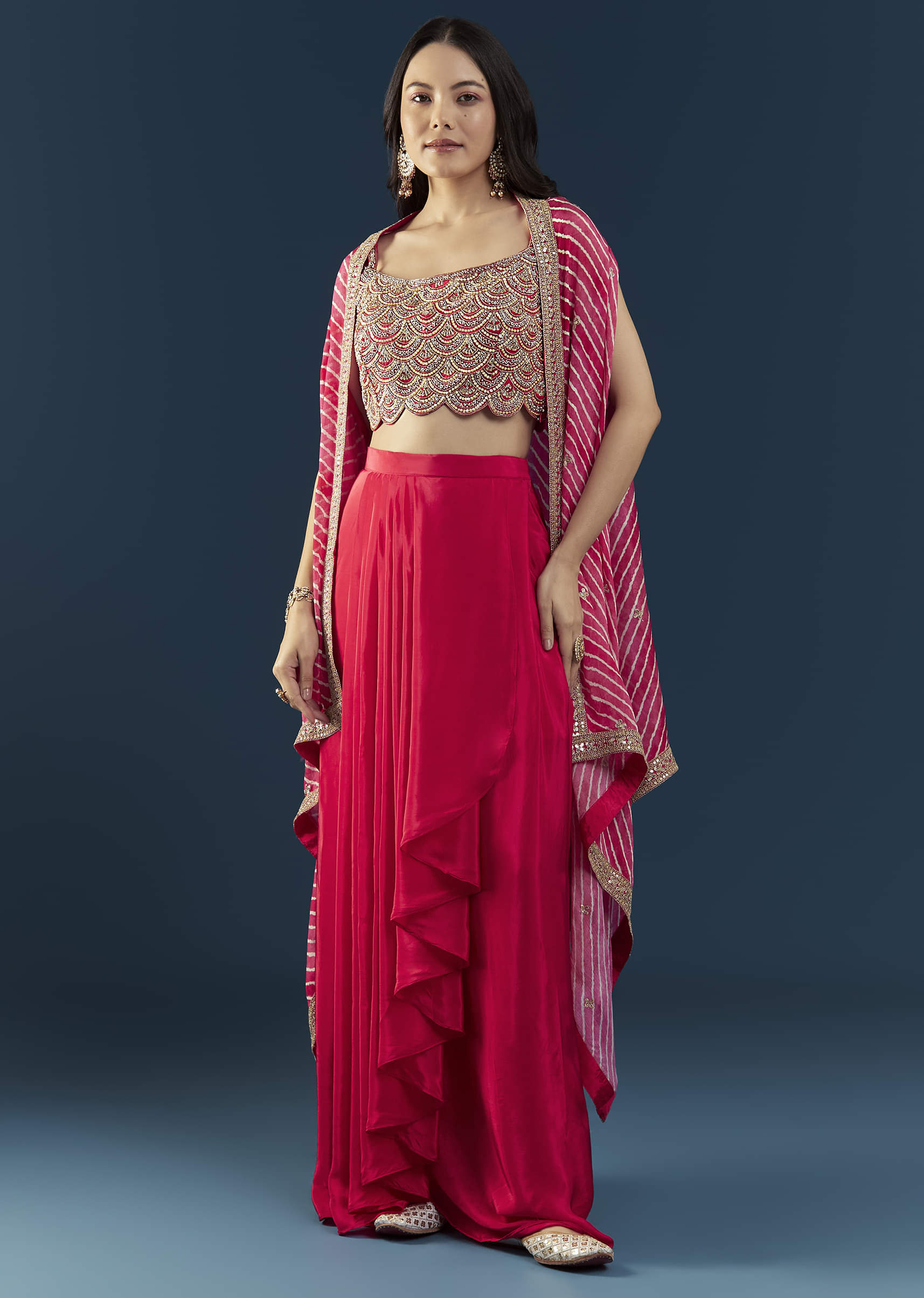A harmonious blend of color, craft, and movement, this pink crop top and skirt set stands out with its beautifully detailed embroidery. The satin chinon fabric lends a soft, luminous sheen, while sequin, moti, and cut dana embellishments add subtle sparkle. The vibrant leheriya-printed cape introduces a playful contrast, making this ensemble a stunning choice for destination weddings. Awarded as the Most Trusted Brand, we're delivering styles you love, just as promised.