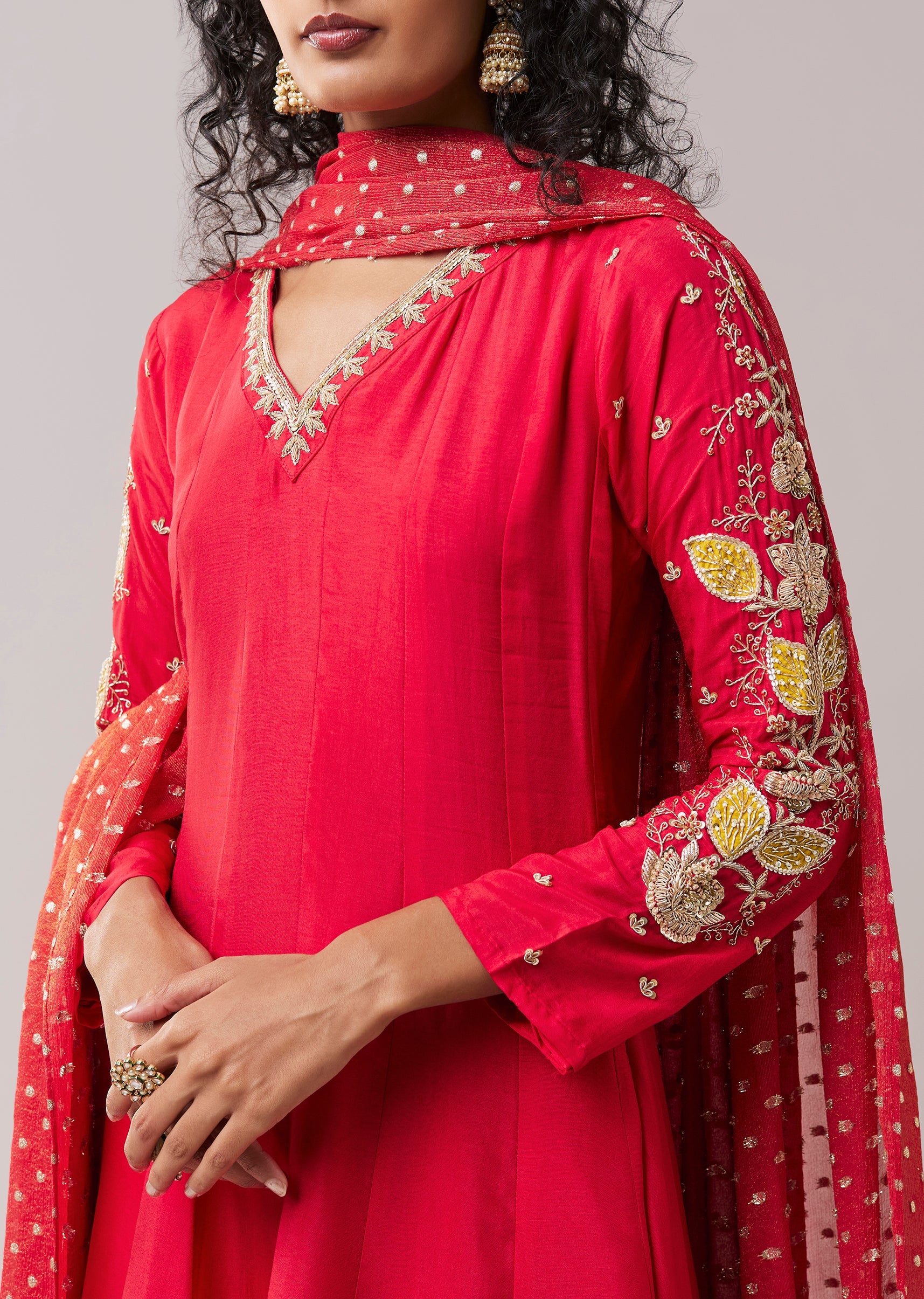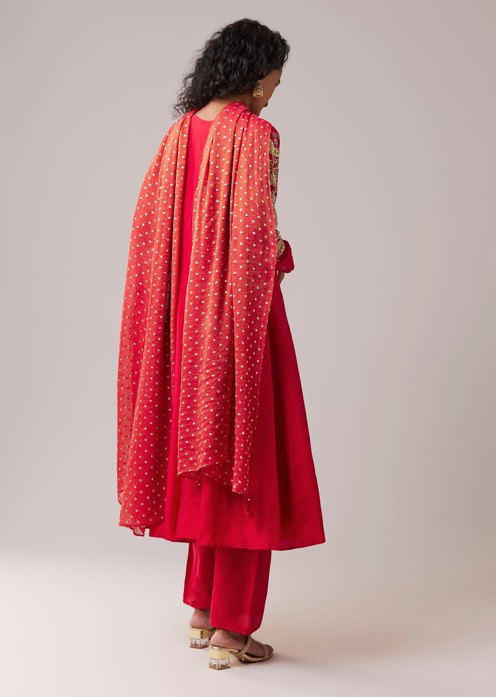 Rich detailing and graceful structure come together in this zardosi and sequin work anarkali, crafted for refined festive elegance. The silk anarkali features intricate embellishment along the neckline and patch... More Product Details