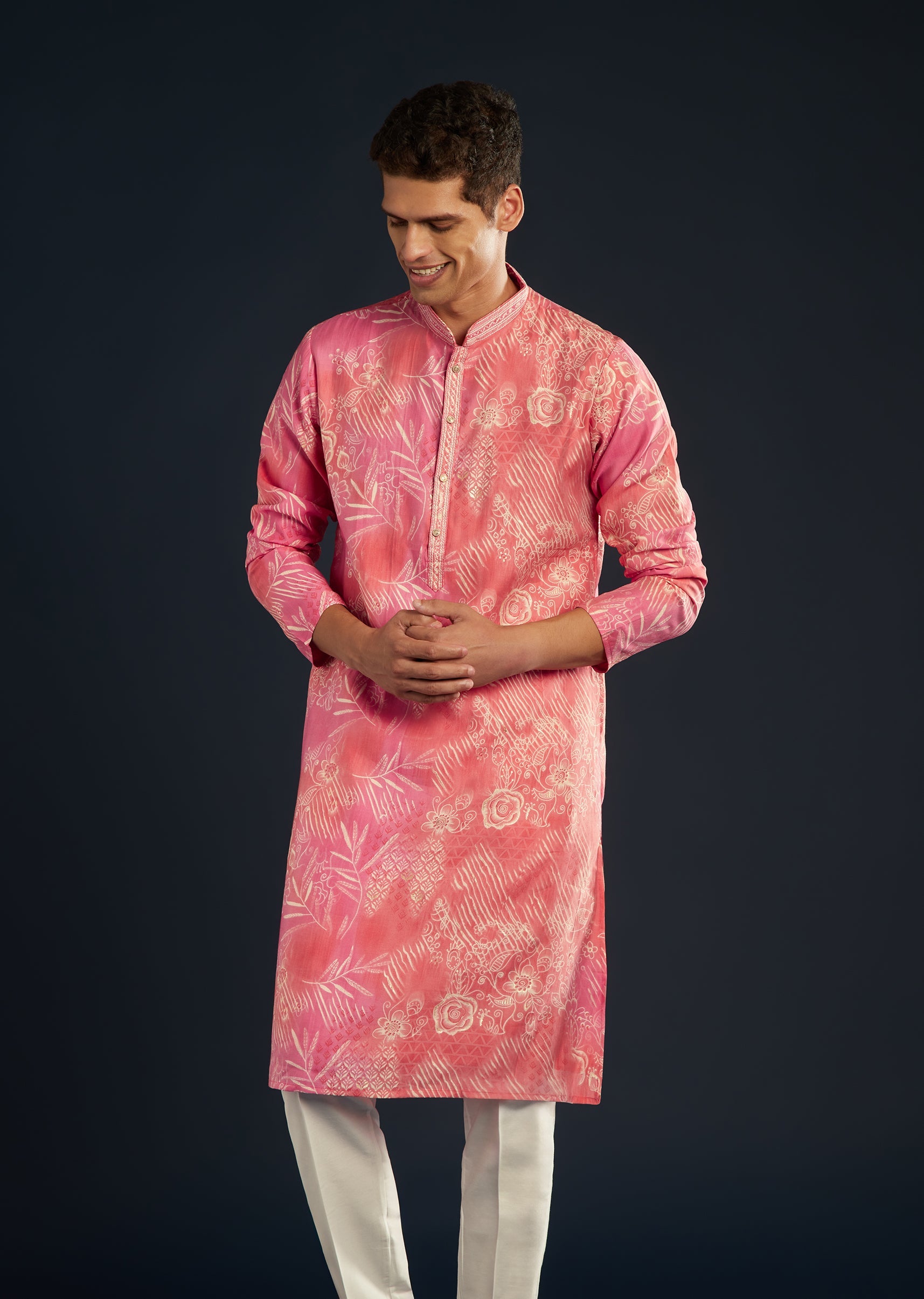 Radiant and regal, this pink silk kurta set brings together elegance and sophistication. Doused in vivid multi-hued prints, it catches the light with every movement — perfect for wedding nights and festive gatherings. The soft art silk fabric and modern tailoring, complete with a mandarin collar and classic trousers, lend all-day comfort. Awarded as the Most Trusted Brand, we're delivering styles you love, just as promised.