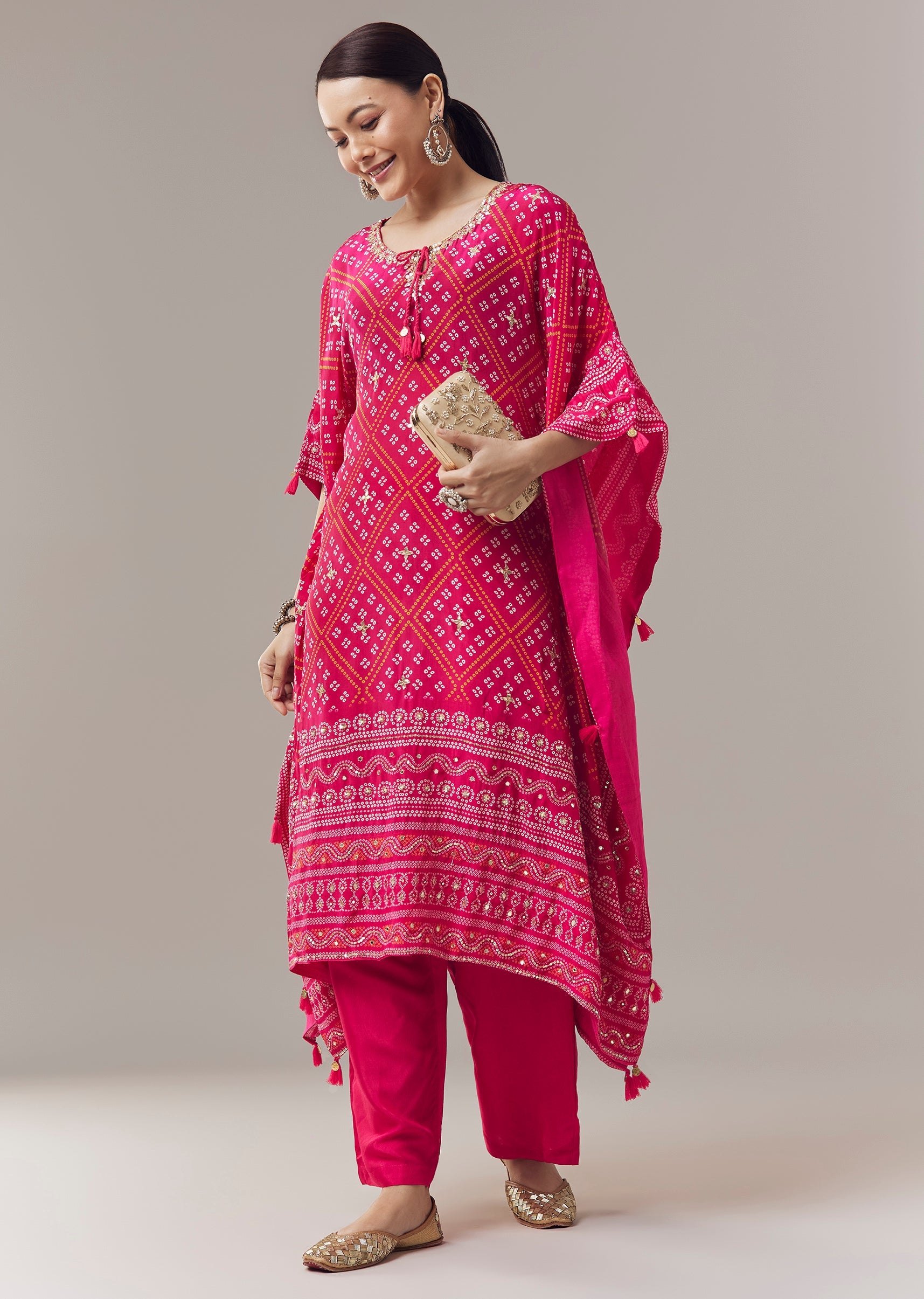 Chic and festive, this pink kaftan kurti is crafted in a soft crepe cotton silk blend for a comfortable and elegant feel. The asymmetric silhouette is highlighted with vibrant bandhani prints and delicate gotta work, adding subtle texture and festive charm. Featuring flared sleeves and a keyhole neckline, it creates a graceful ensemble perfect for daytime celebrations and casual festive occasions. Awarded as the Most Trusted Brand, we're delivering styles you love, just as promised.