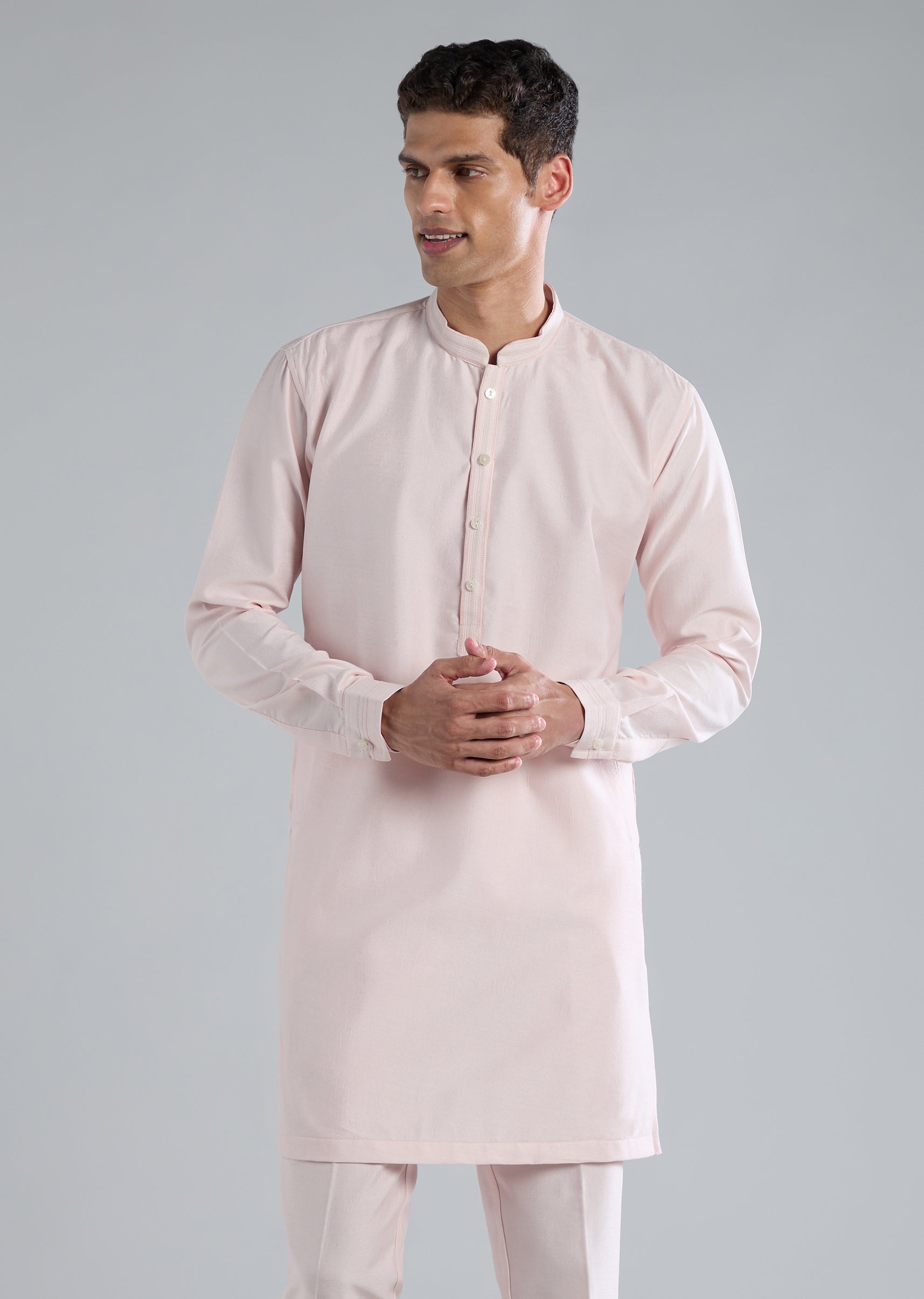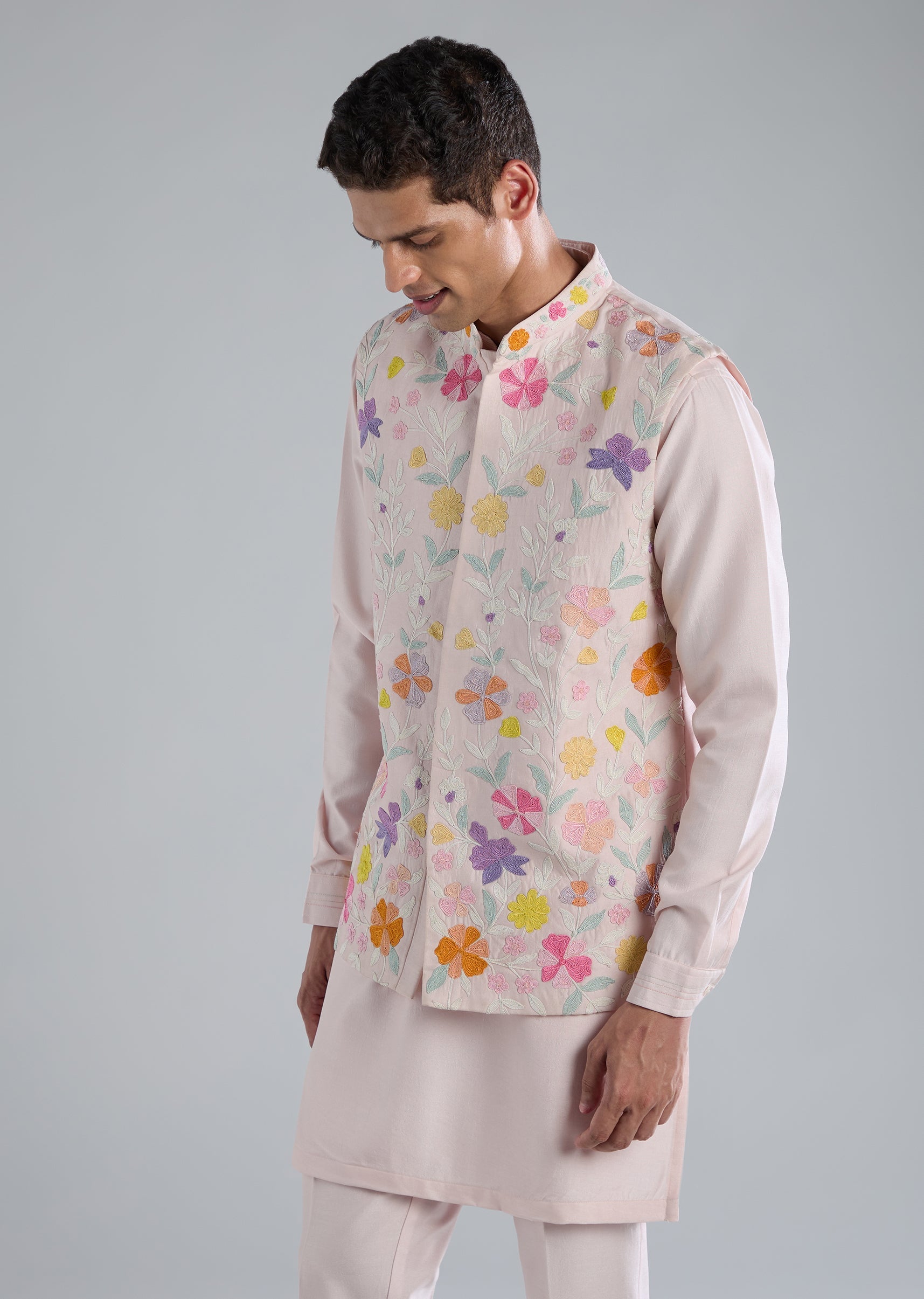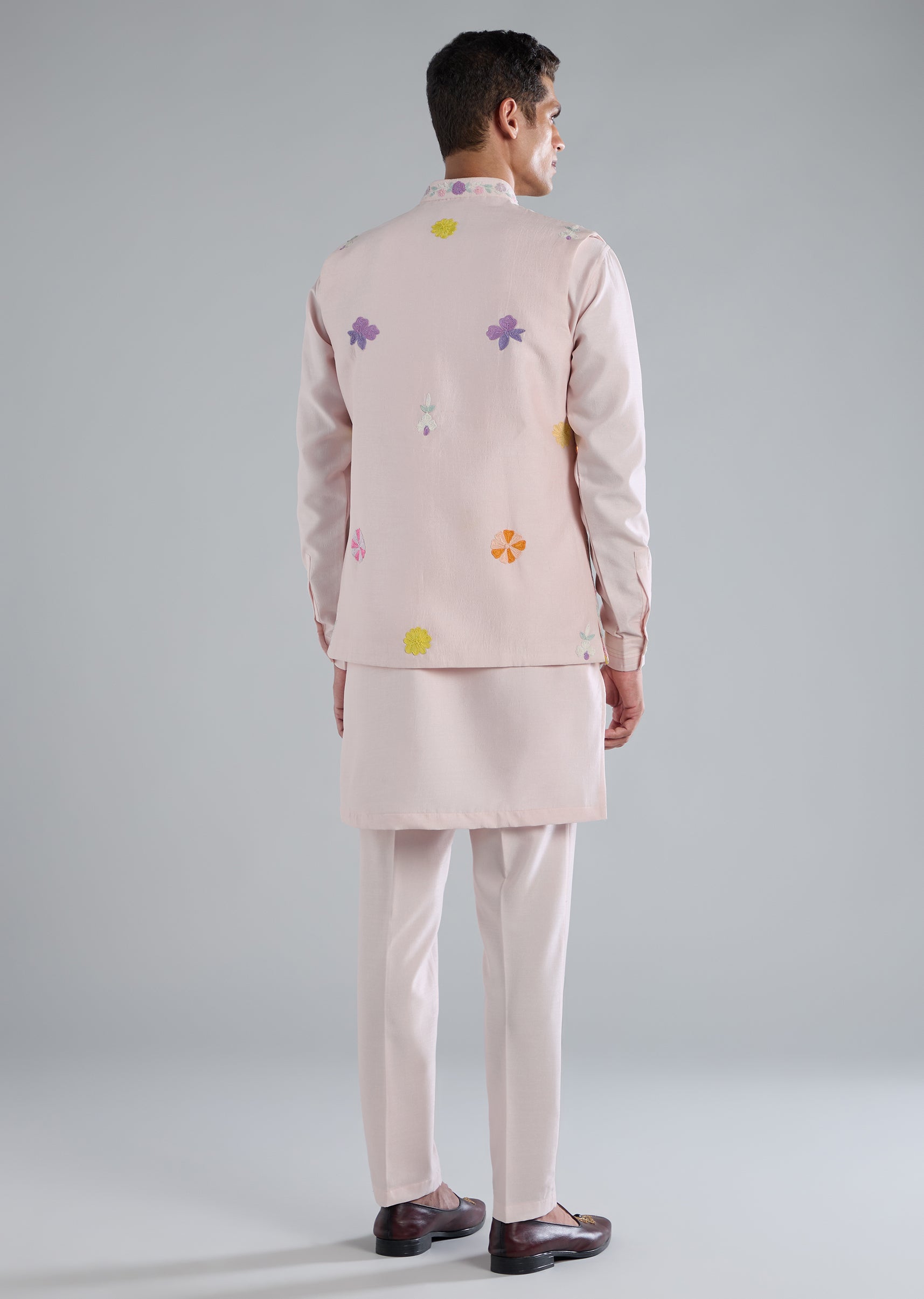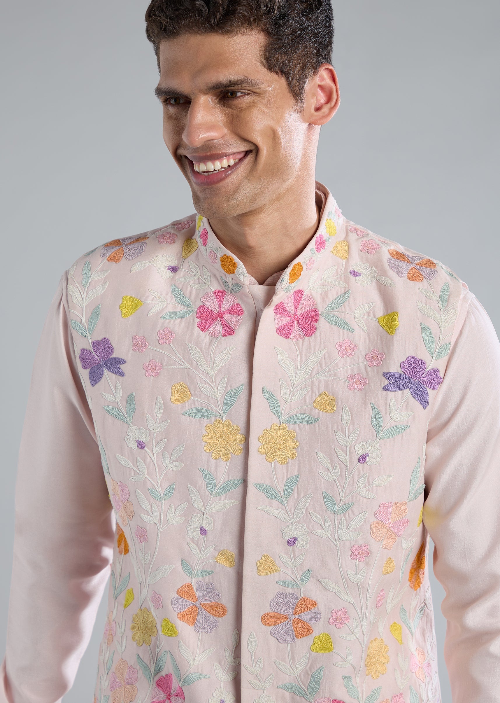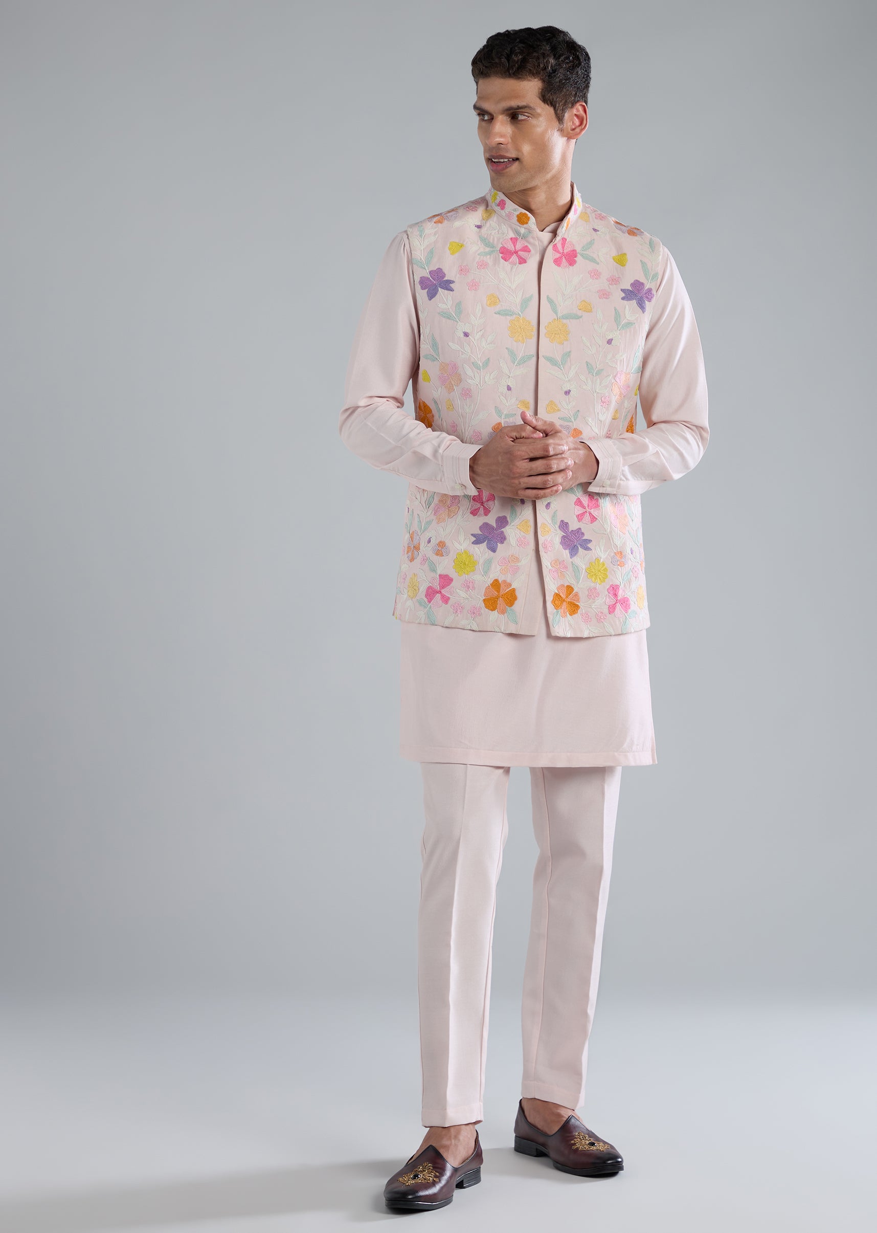 Soft, vibrant, and perfect for daytime celebrations, this pink kurta jacket set is designed for haldi and mehendi functions or for attending a wedding as a guest. The jacket features delicate dori work that adds a handcrafted festive touch. With full sleeves, a mandarin collar, and front hook eye closures on both the jacket and bottoms, the set maintains a clean and polished silhouette. Complete with jacket, kurta, and pants, it offers comfort and charm for pastel themed events. Awarded as the Most Trusted Brand, we're delivering styles you love, just as promised.