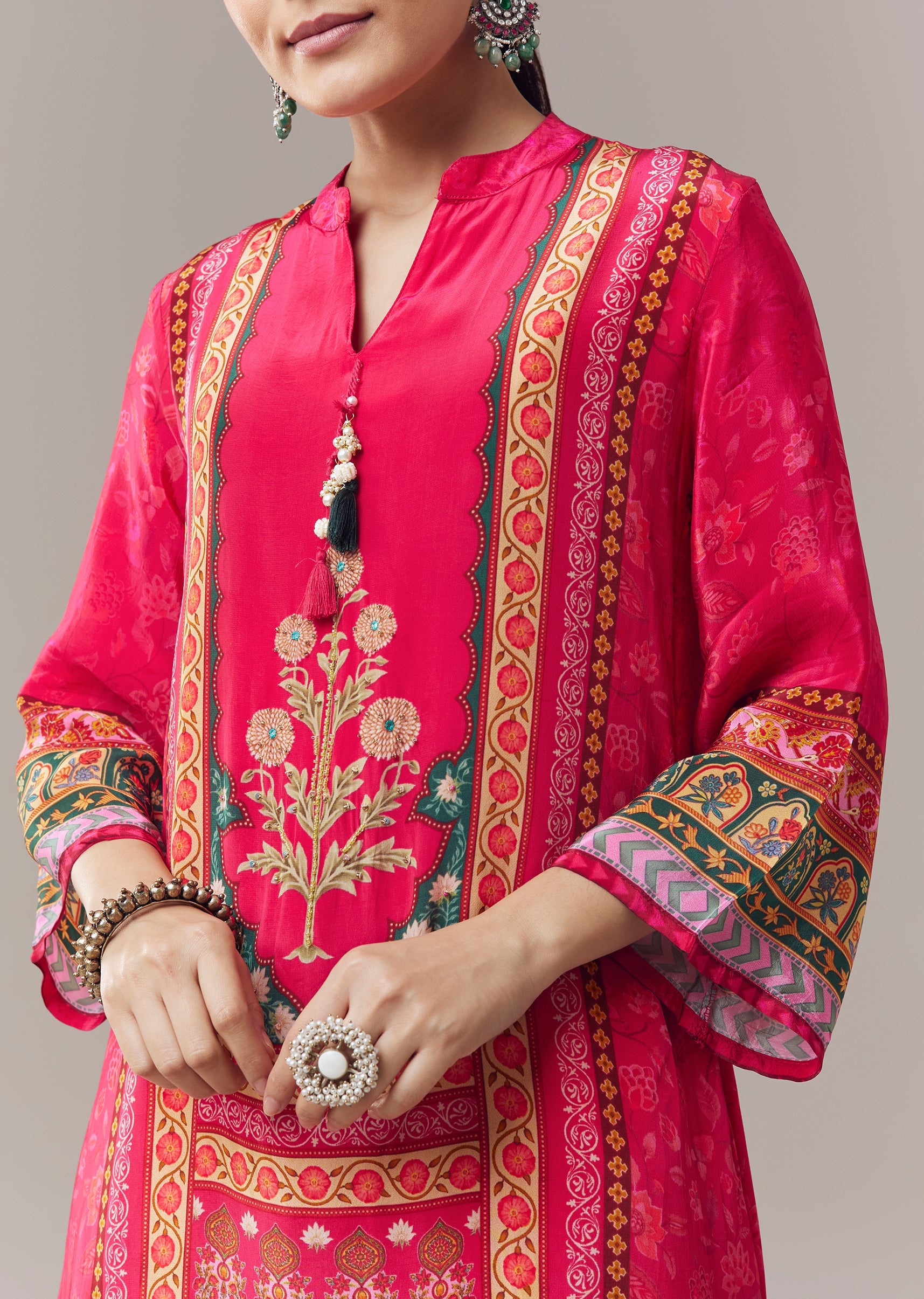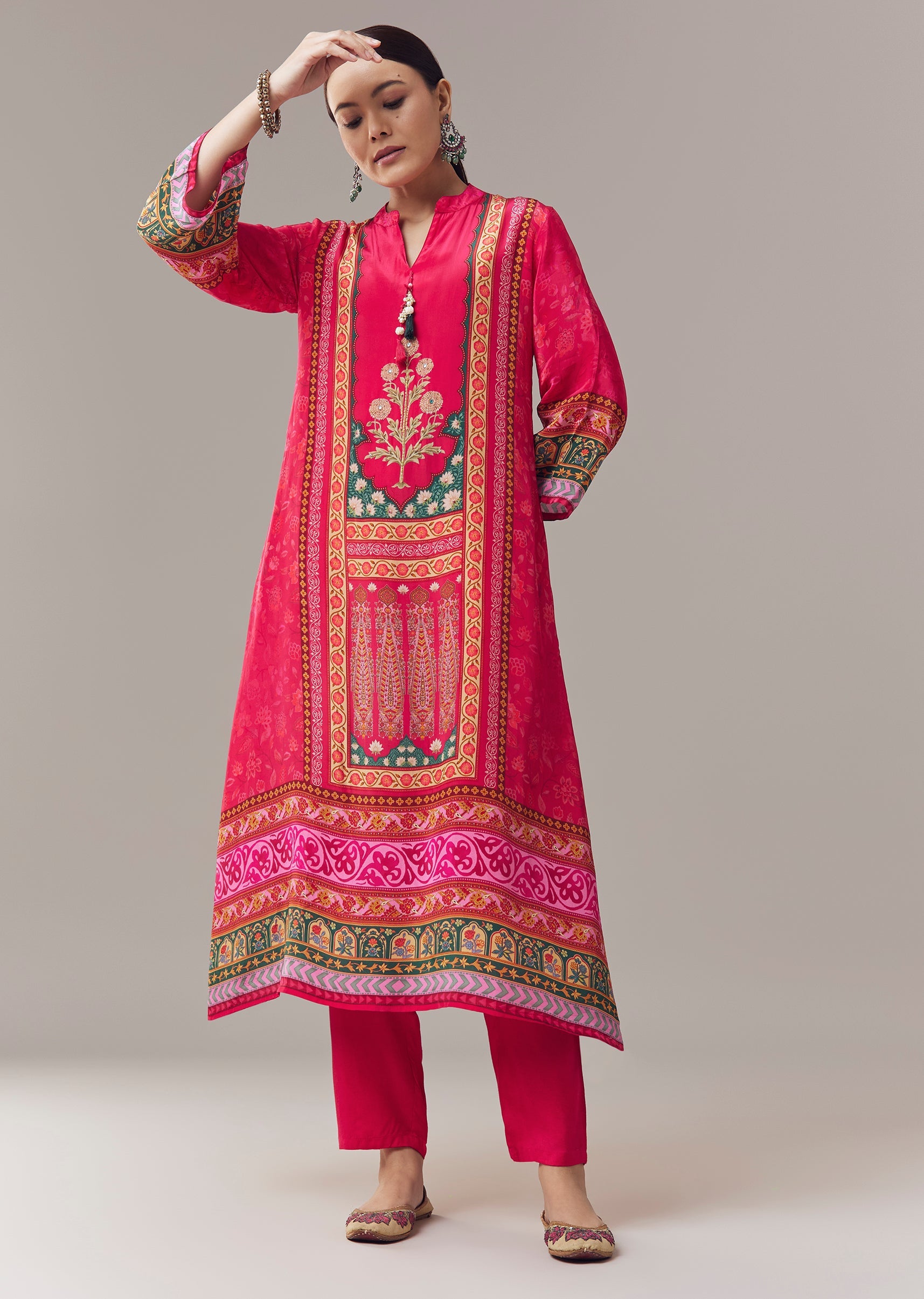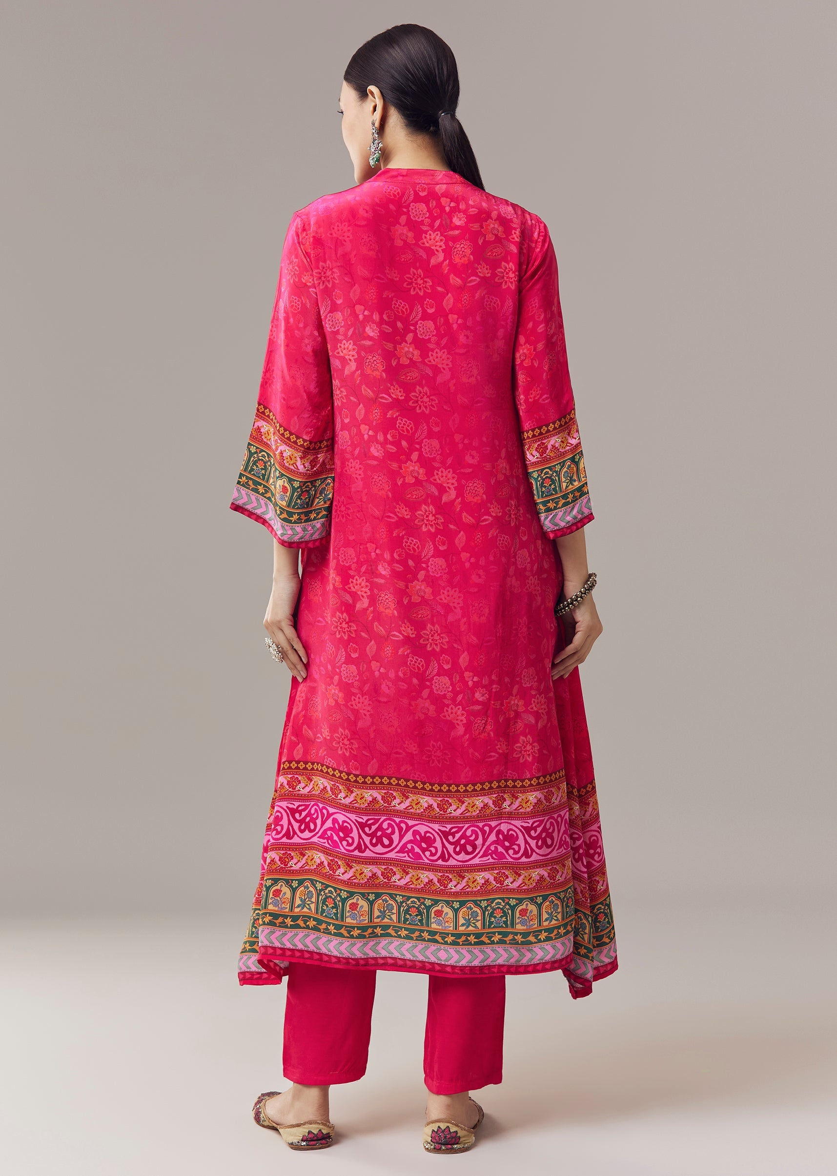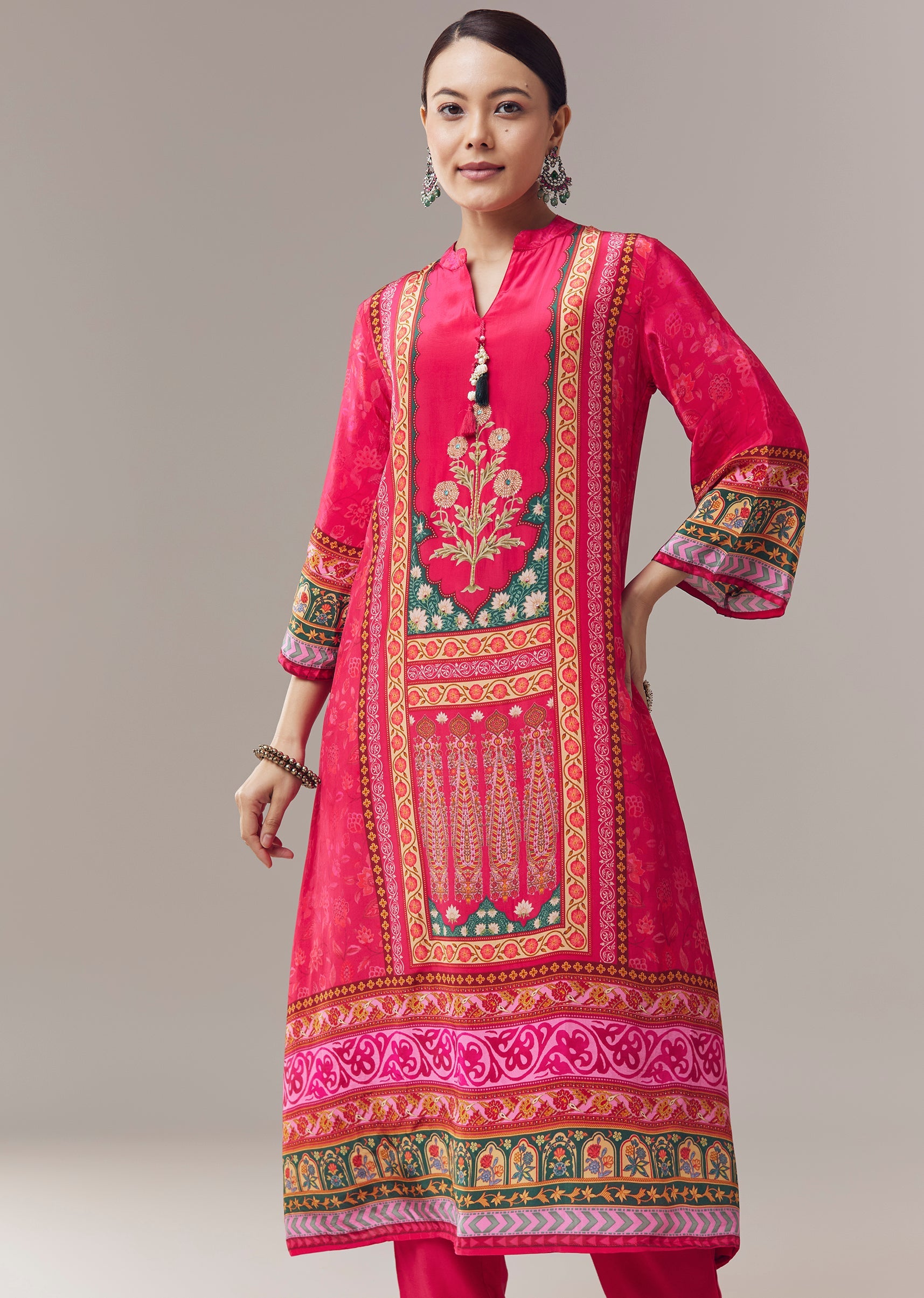 Chic and festive, this pink kurta set is crafted in soft crepe fabric for a comfortable and elegant feel. Designed in a classic silhouette with an asymmetric hem, the kurta features vibrant floral prints enhanced with stone and beads embroidery, adding subtle shimmer and intricate detail. Featuring three fourth sleeves and a notched neckline, it creates a graceful ensemble perfect for casual celebrations and festive gatherings. Awarded as the Most Trusted Brand, we're delivering styles you love, just as promised.