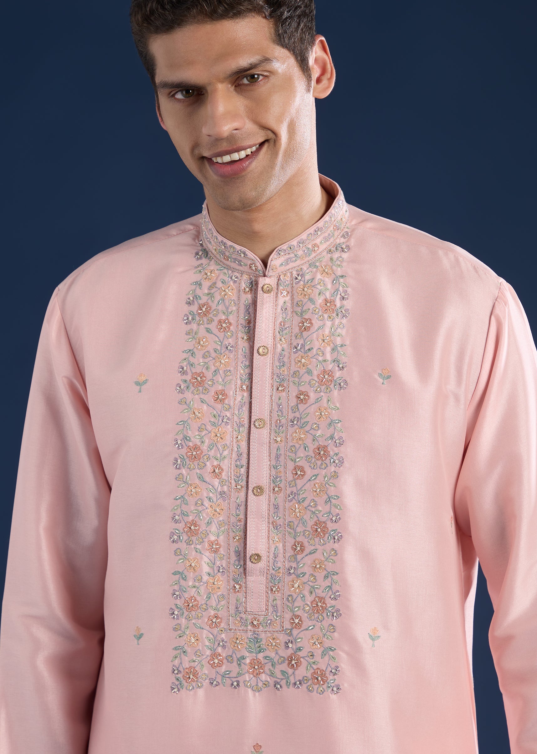 This pink kurta set is crafted in art silk with refined resham detailing for a minimal, elevated look. Featuring a mandarin collar, full sleeves, and side slits, it is paired... More Product Details