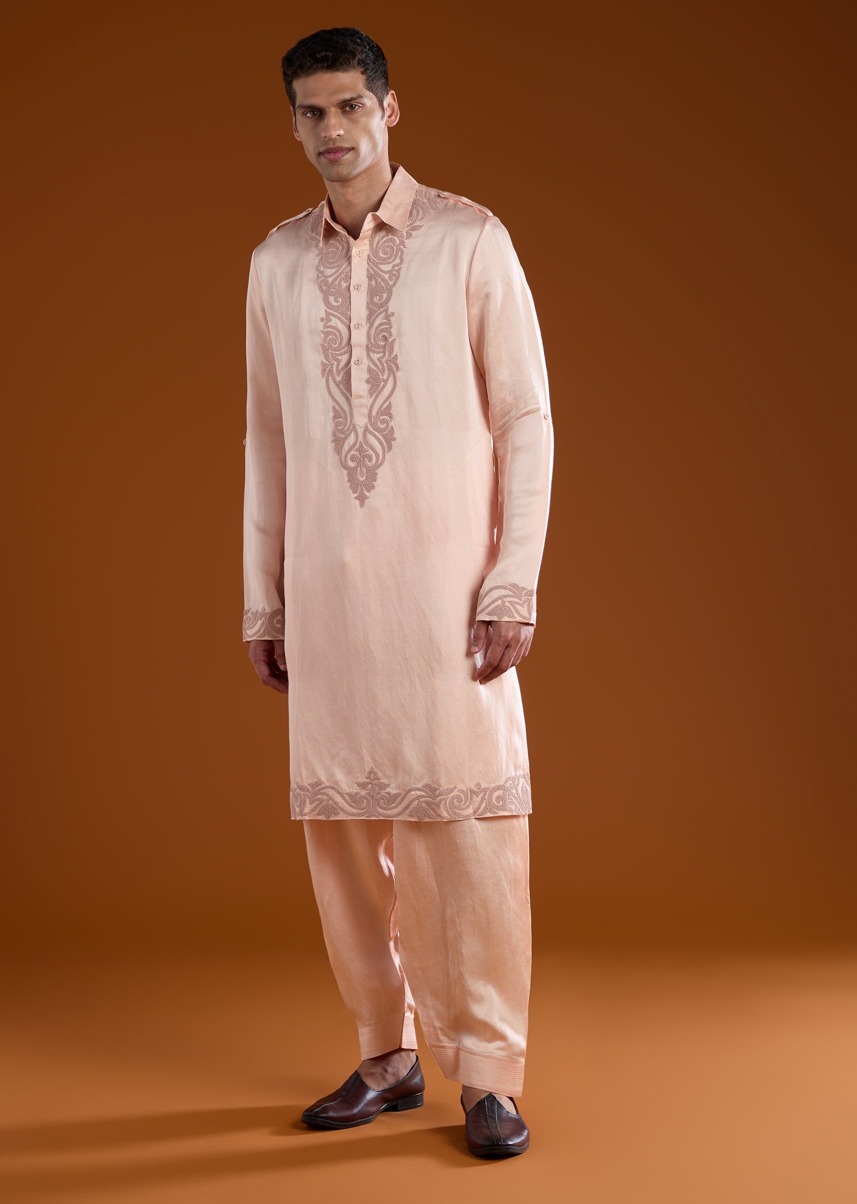 Bring effortless charm to festive dressing with this pink kurta set crafted in a refined blend of linen and satin, highlighted with elegant resham thread work and subtle dori detailing.... More Product Details