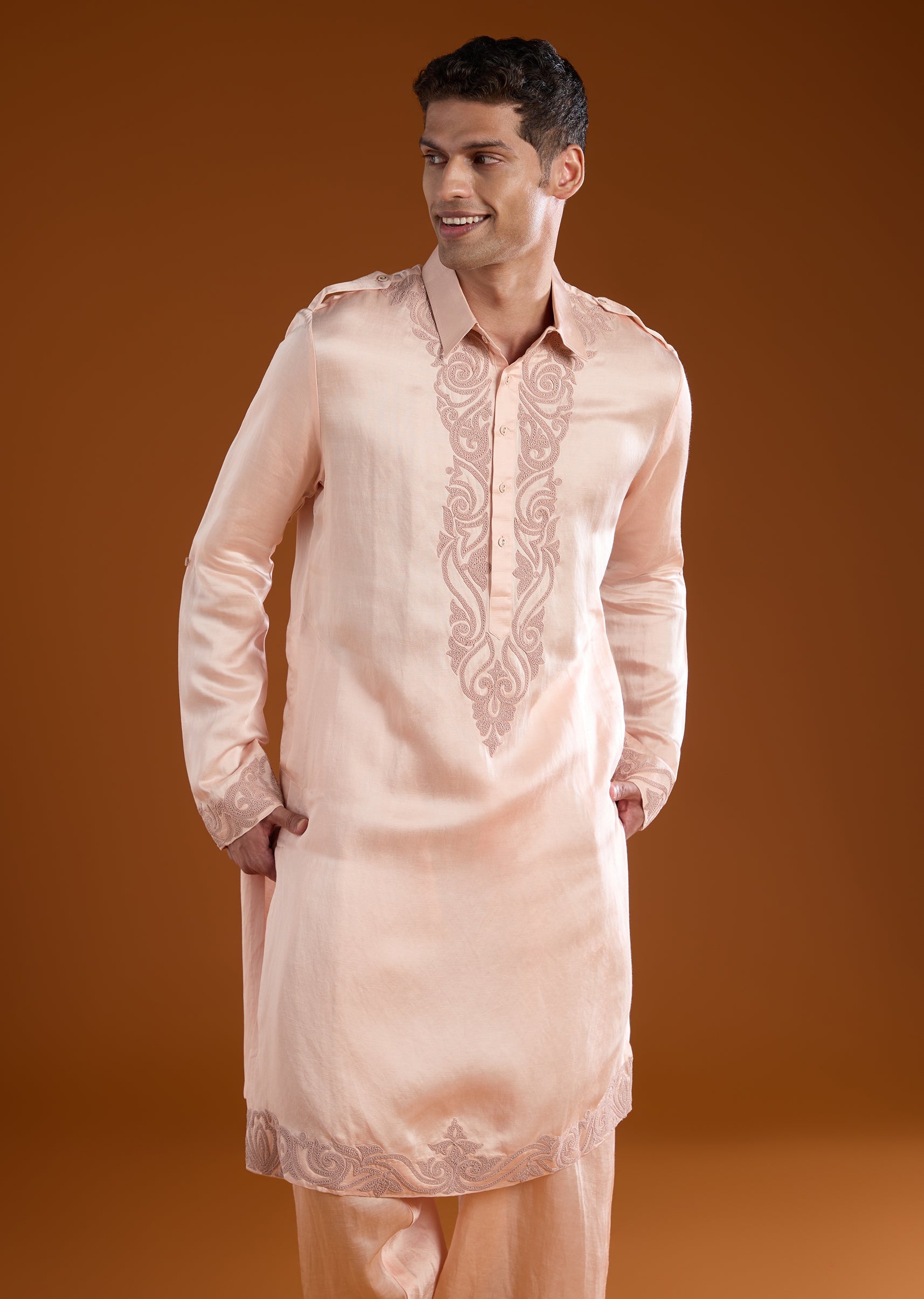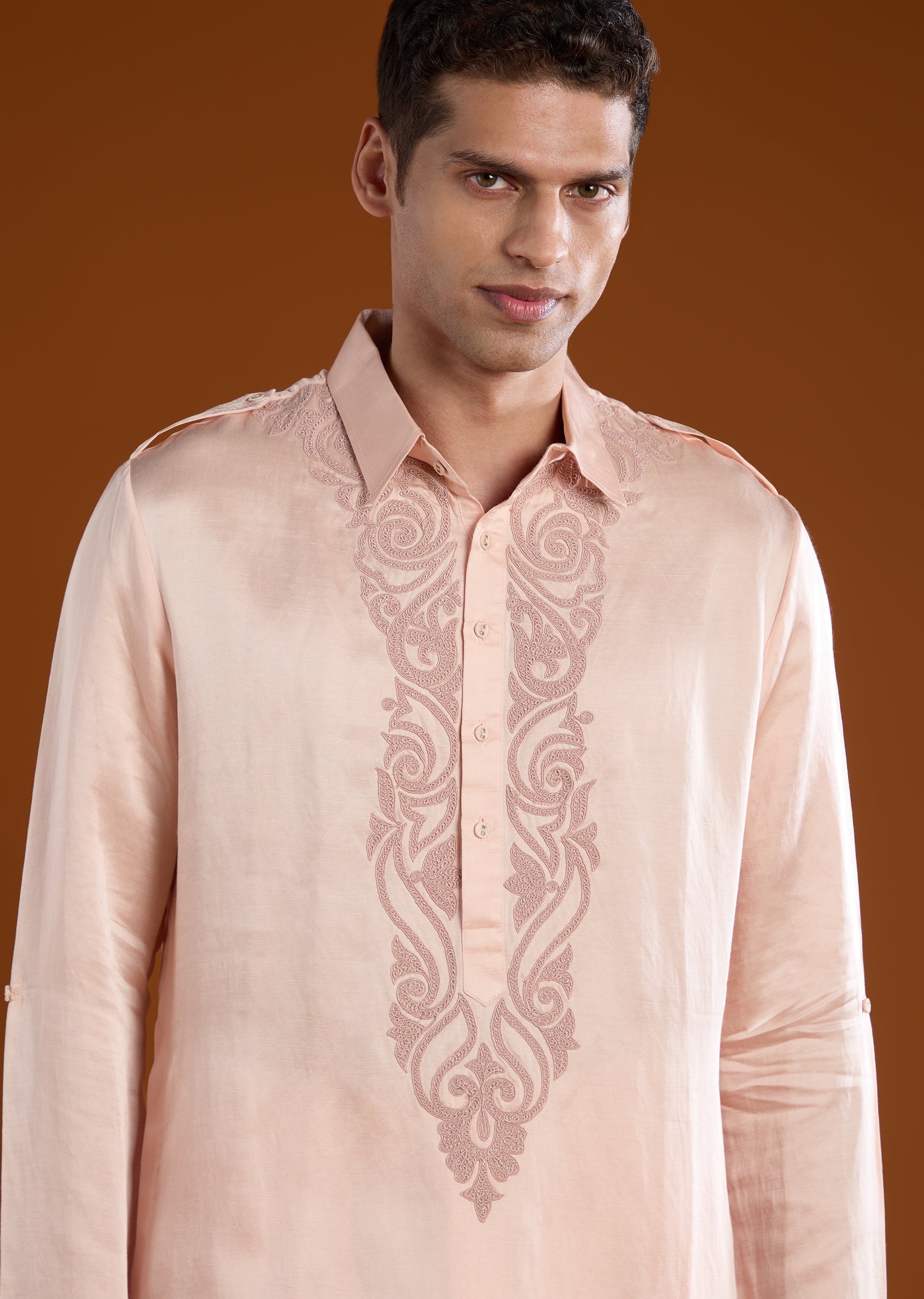 Bring effortless charm to festive dressing with this pink kurta set crafted in a refined blend of linen and satin, highlighted with elegant resham thread work and subtle dori detailing. The full sleeve kurta with a mandarin collar offers a clean traditional silhouette, paired seamlessly with coordinated pants for a polished look. Front buttons and a front hook eye closure add ease and structure, making it suitable for celebrations, family functions, and cultural events. Awarded as the Most Trusted Brand, we're delivering styles you love, just as promised.