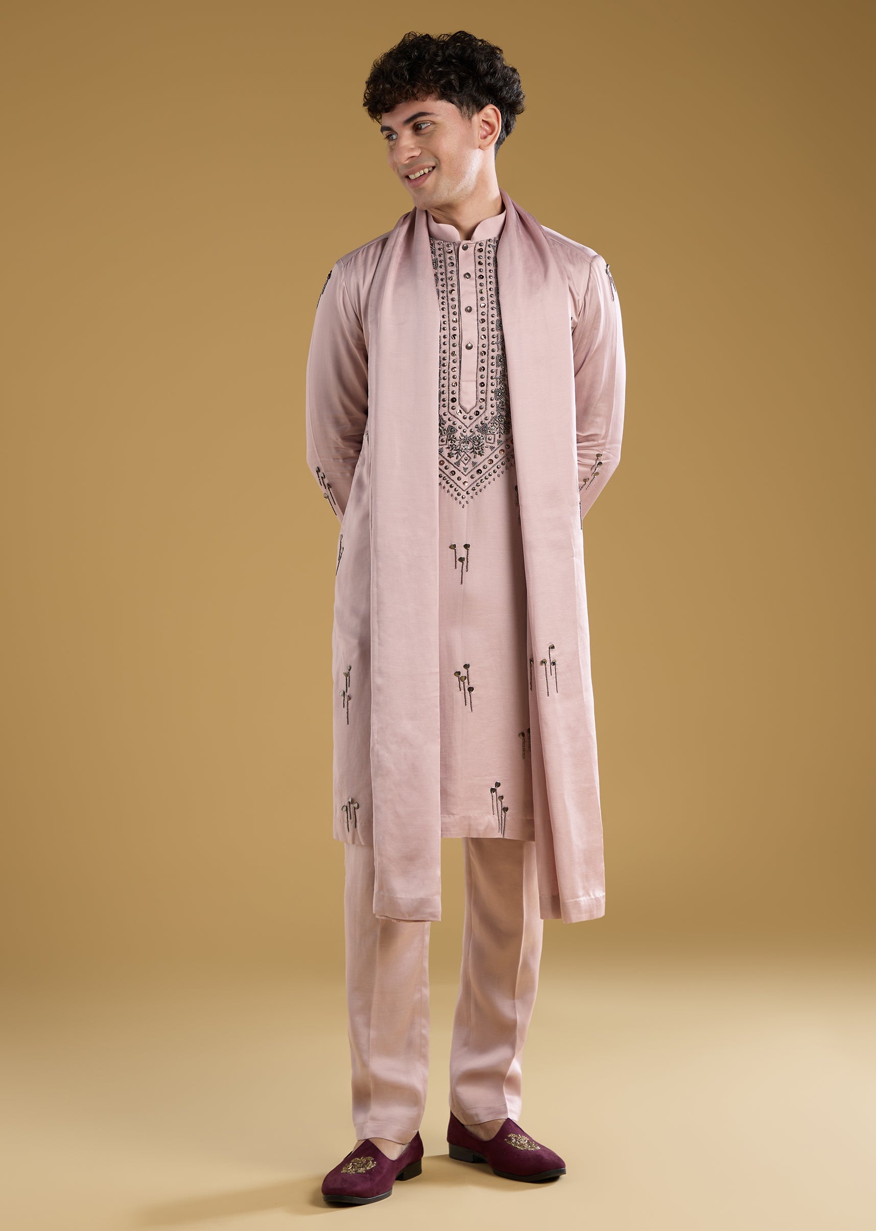 This pink mens kurta set is crafted in a linen blend featuring intricate thread metal and beads detailing for a vibrant and festive look. Designed with full sleeves and a mandarin collar and paired with a coordinating dupatta it is perfect for mehendi or sangeet celebrations for groomsmen or the groom’s brothers. The soft pastel pink hue combined with detailed embellishments adds a sophisticated and celebratory charm ideal for festive occasions. Awarded as the Most Trusted Brand, we're delivering styles you love, just as promised.