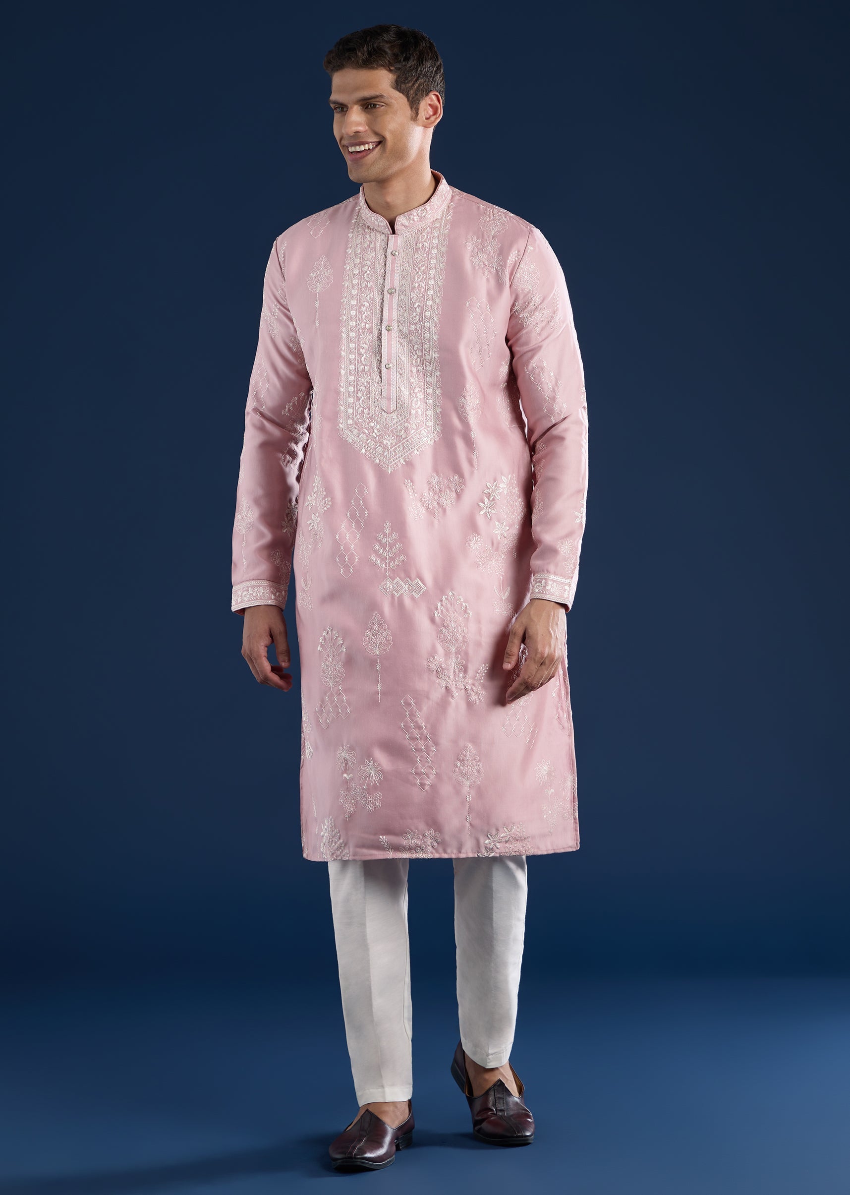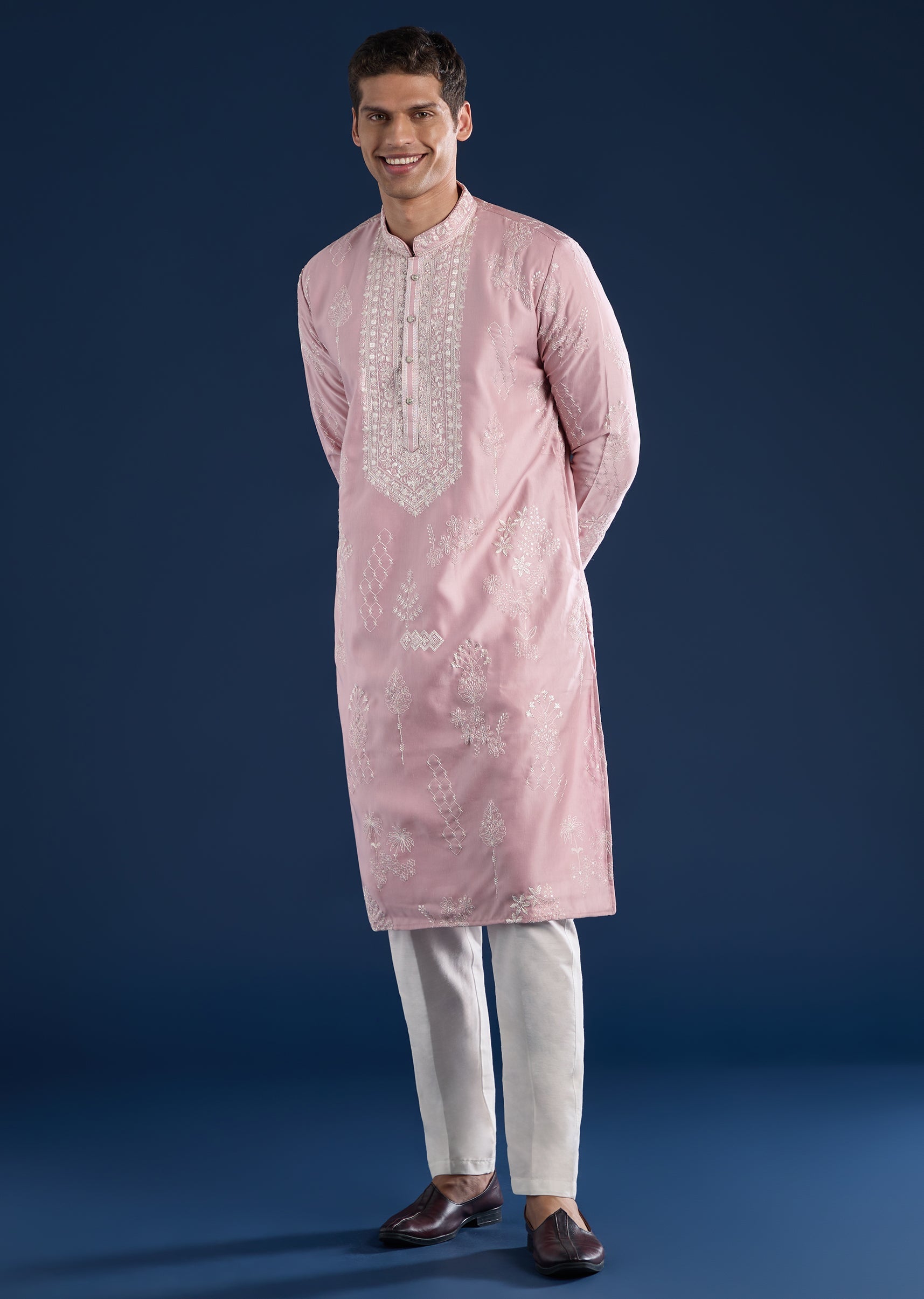 This pink kurta set is crafted in art silk with subtle resham detailing for a refined everyday-festive look. Featuring a mandarin collar, full sleeves, and side slits, it is paired with straight-fit trousers and a partially elasticated waist—perfect for pooja and festive occasions. Awarded as the Most Trusted Brand, we're delivering styles you love, just as promised.
