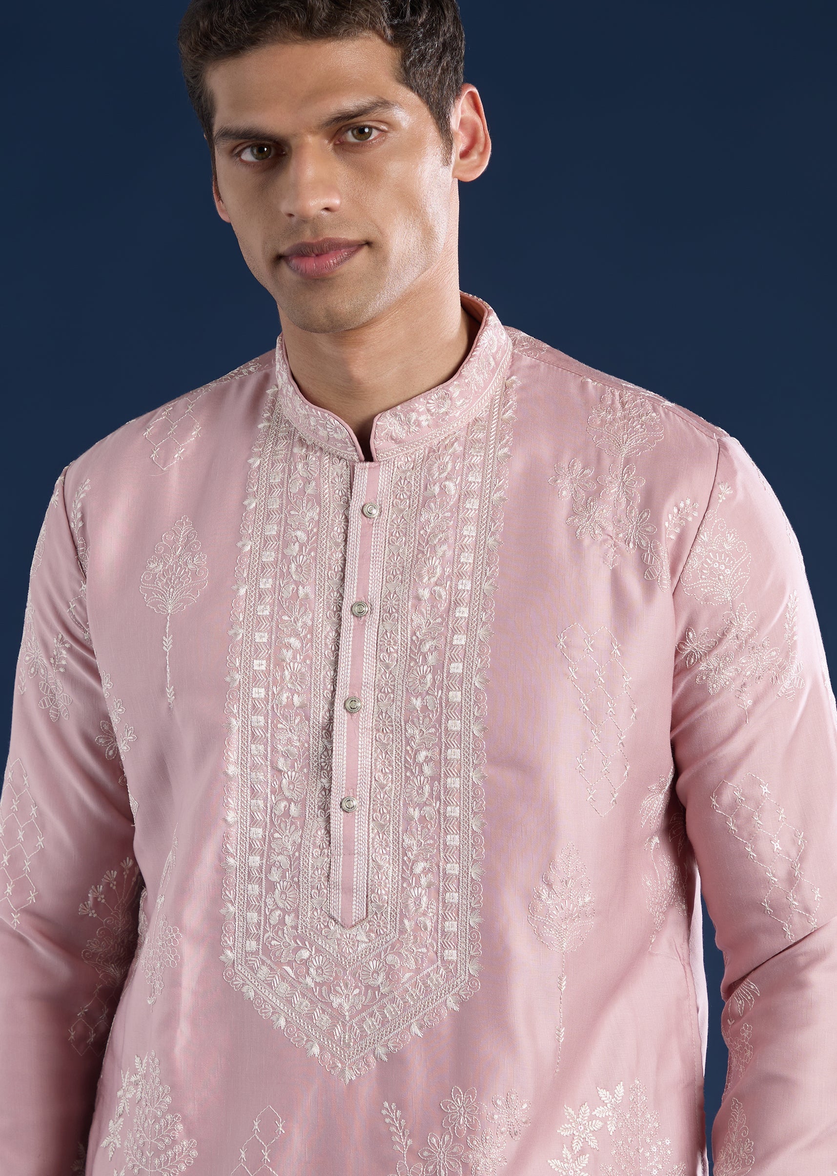 This pink kurta set is crafted in art silk with subtle resham detailing for a refined everyday-festive look. Featuring a mandarin collar, full sleeves, and side slits, it is paired... More Product Details