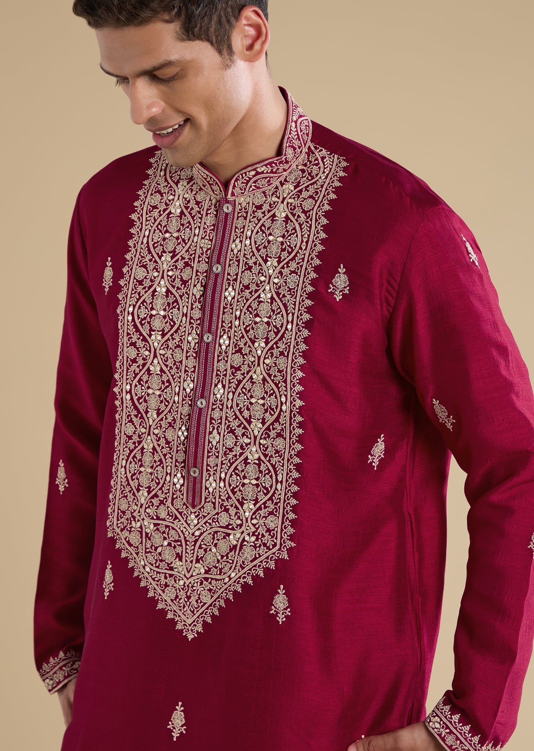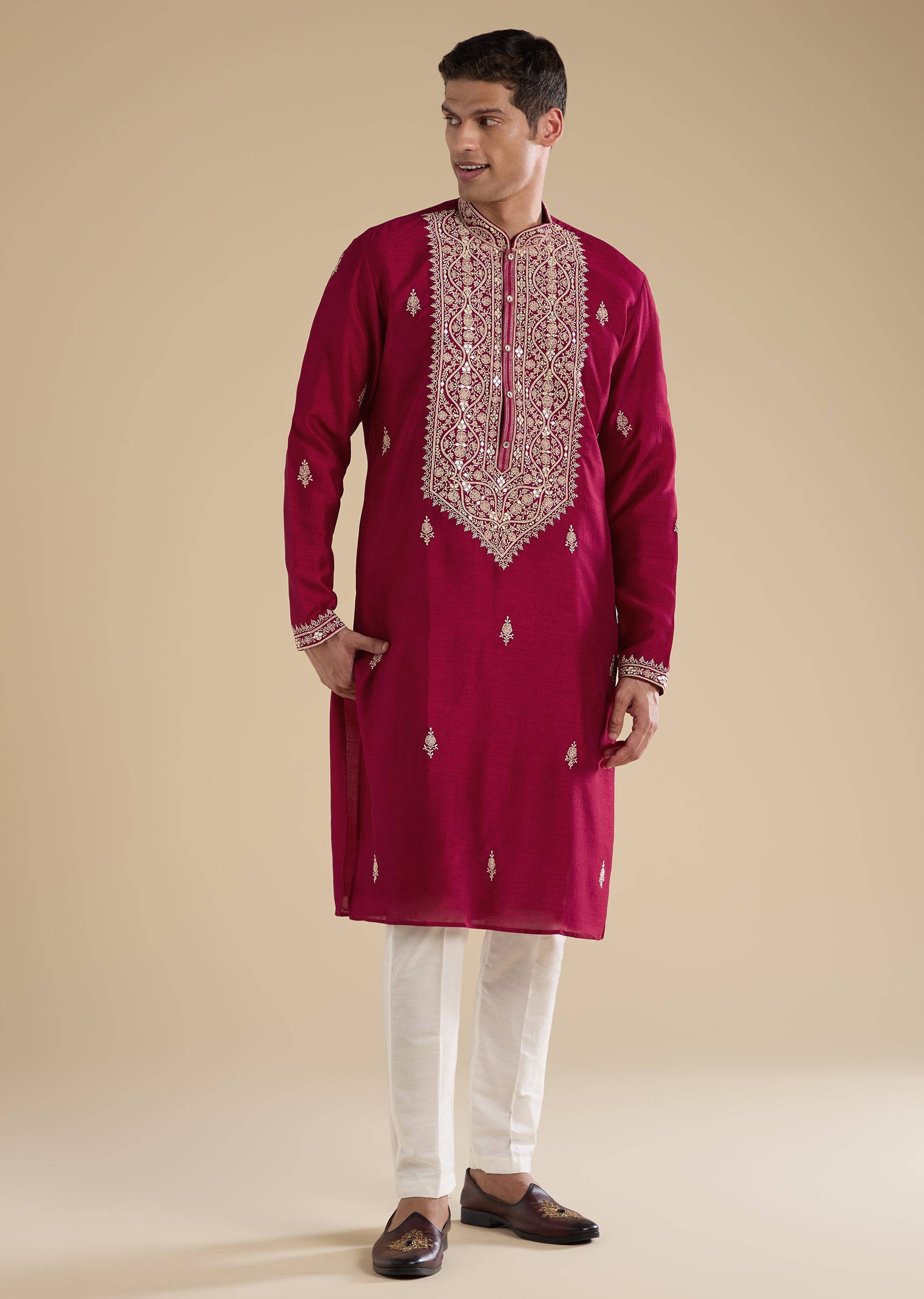 This pink kurta set is crafted in art silk and detailed with resham thread and mirror work for subtle festive shimmer. Finished with a mandarin collar, full sleeves, and side... More Product Details