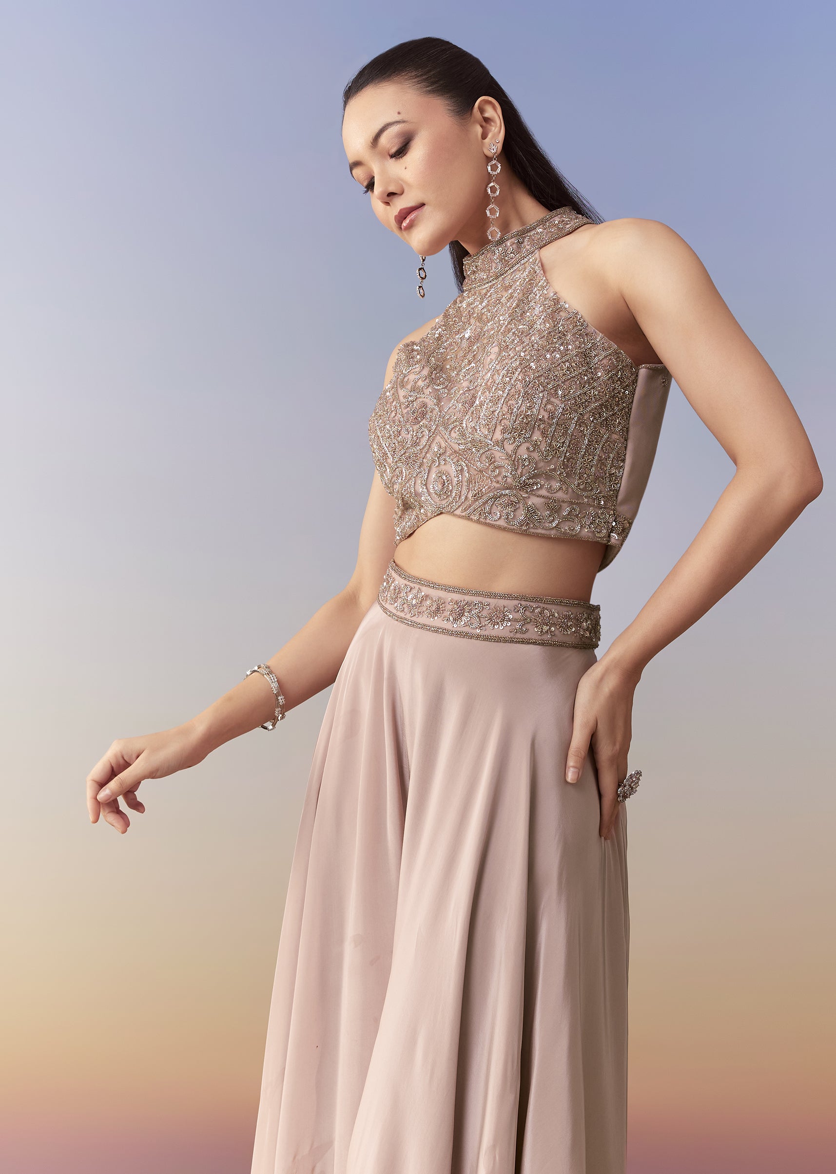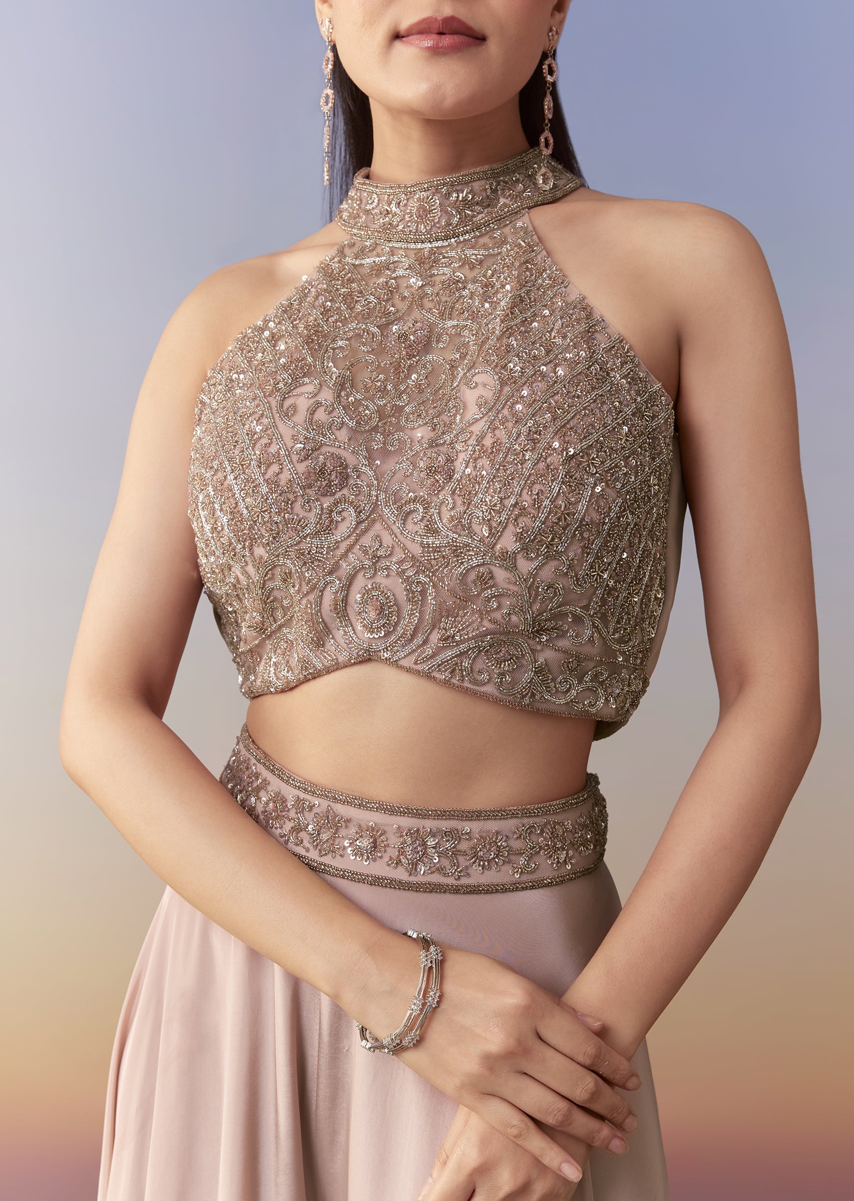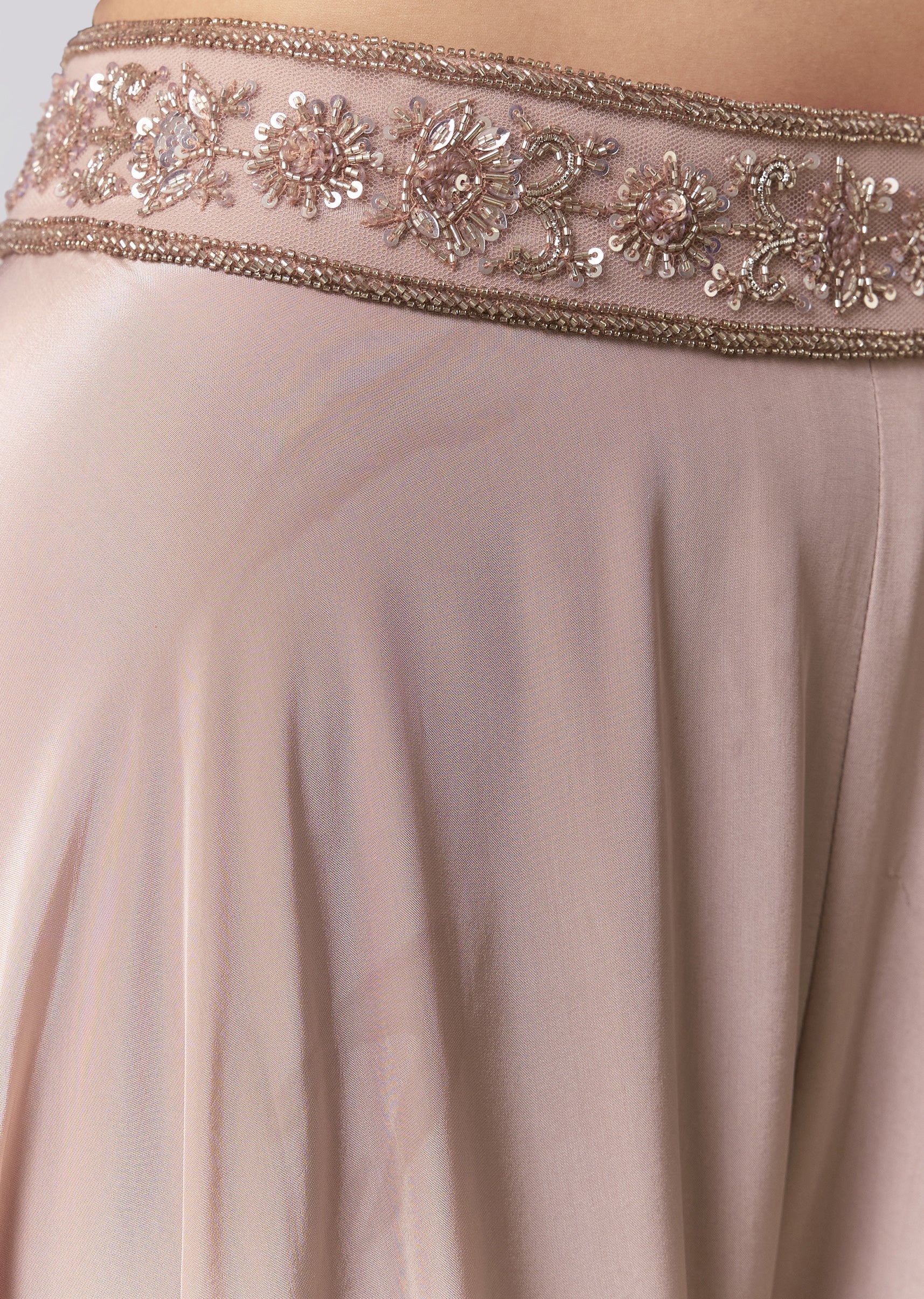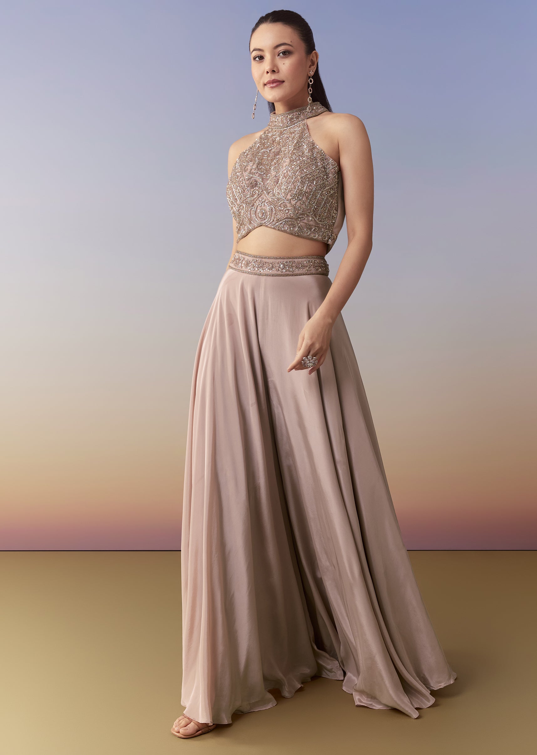 Bring a touch of modern elegance to your festive wardrobe with this pink Indo-western palazzo set, featuring a beautifully embellished crop top adorned with sequins and cutdana work for a... More Product Details