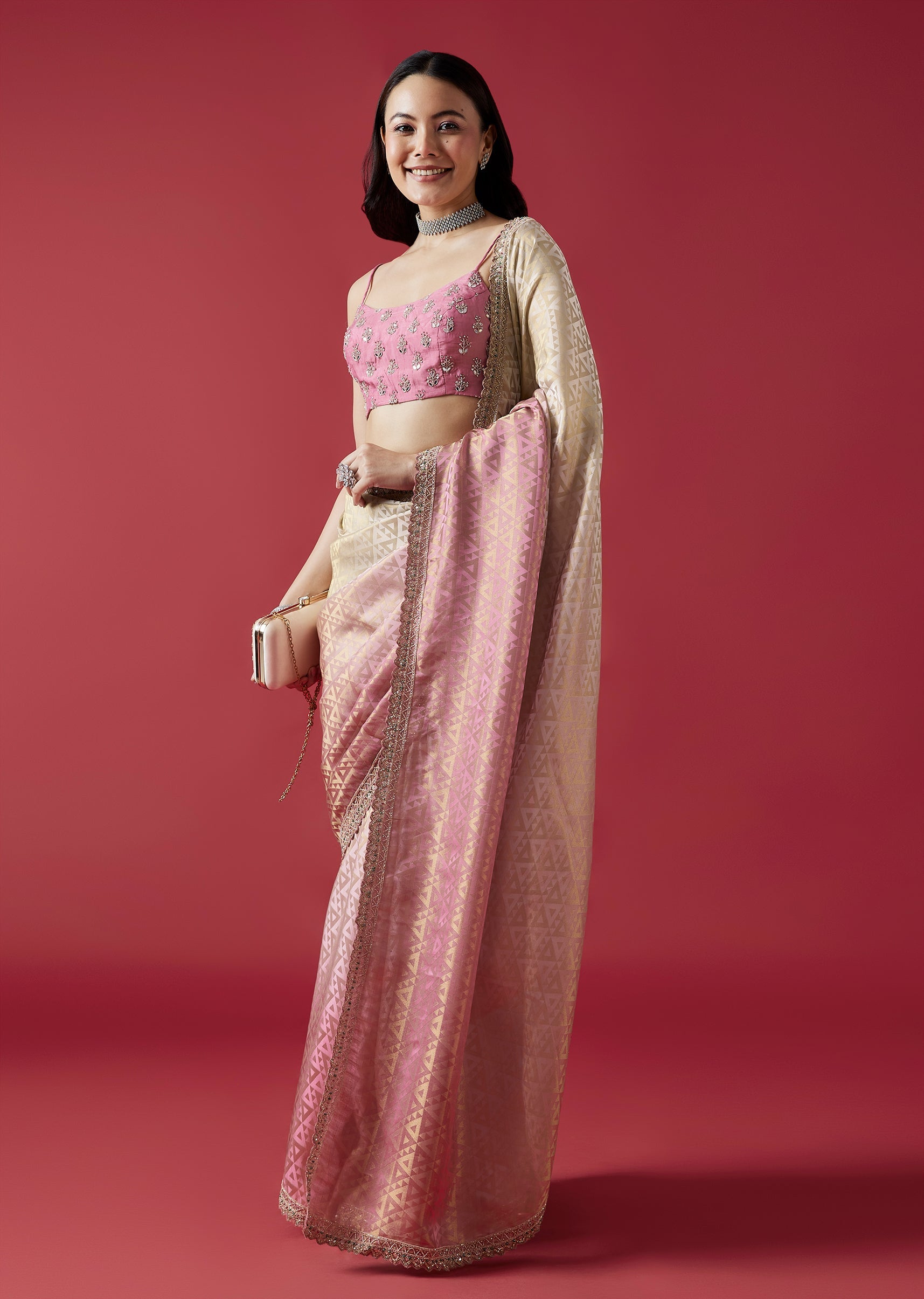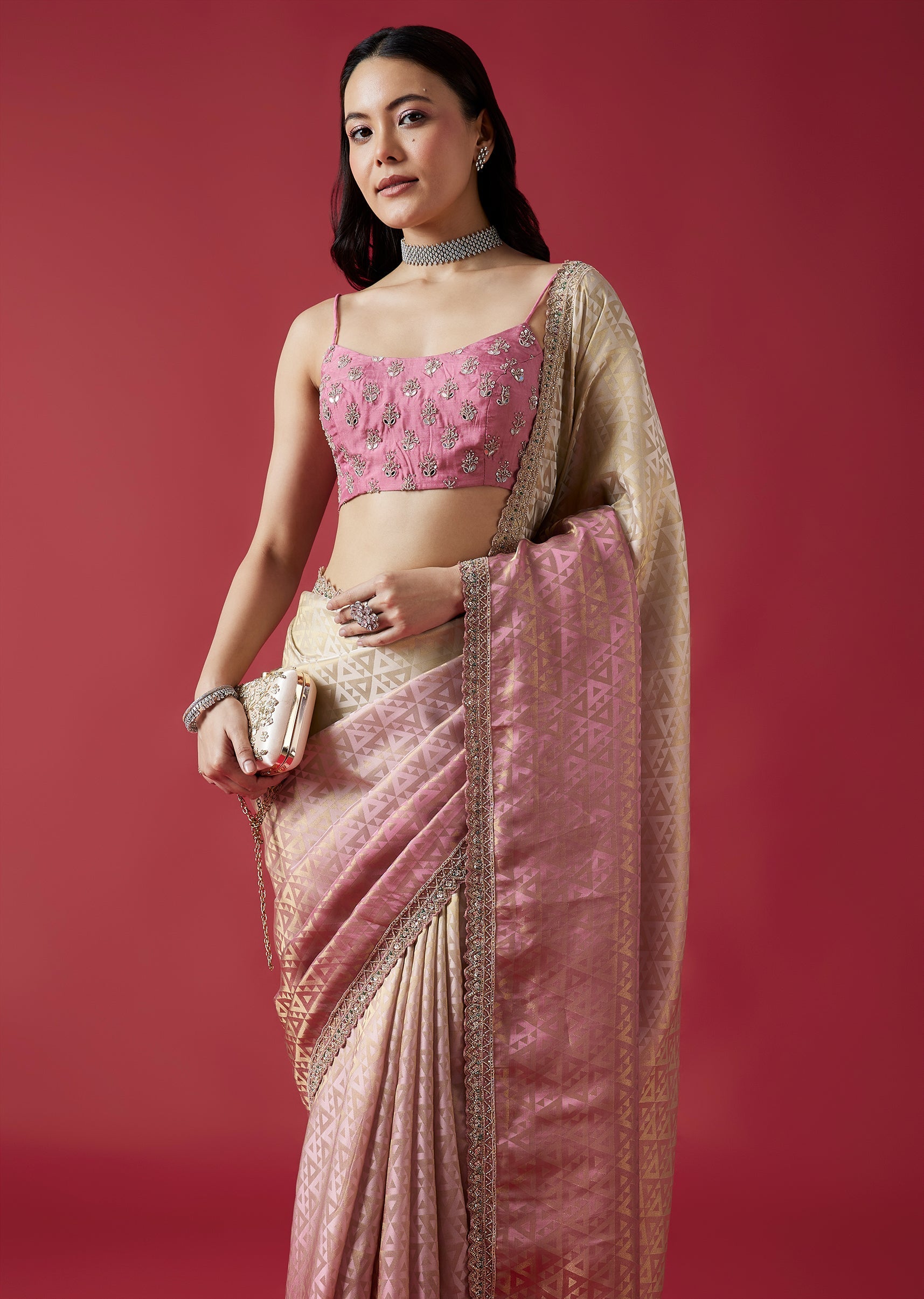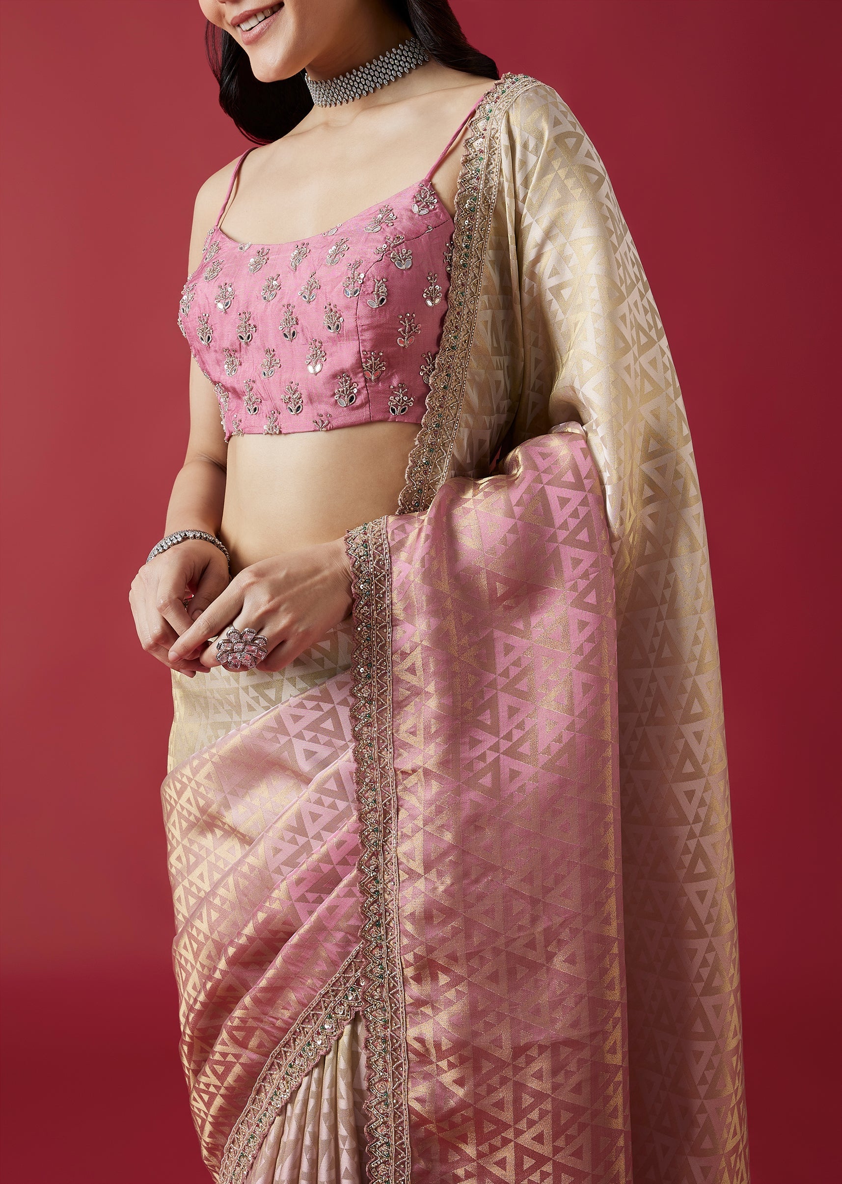 Pink Shaded Jacquard Silk Saree With Embroidered Border