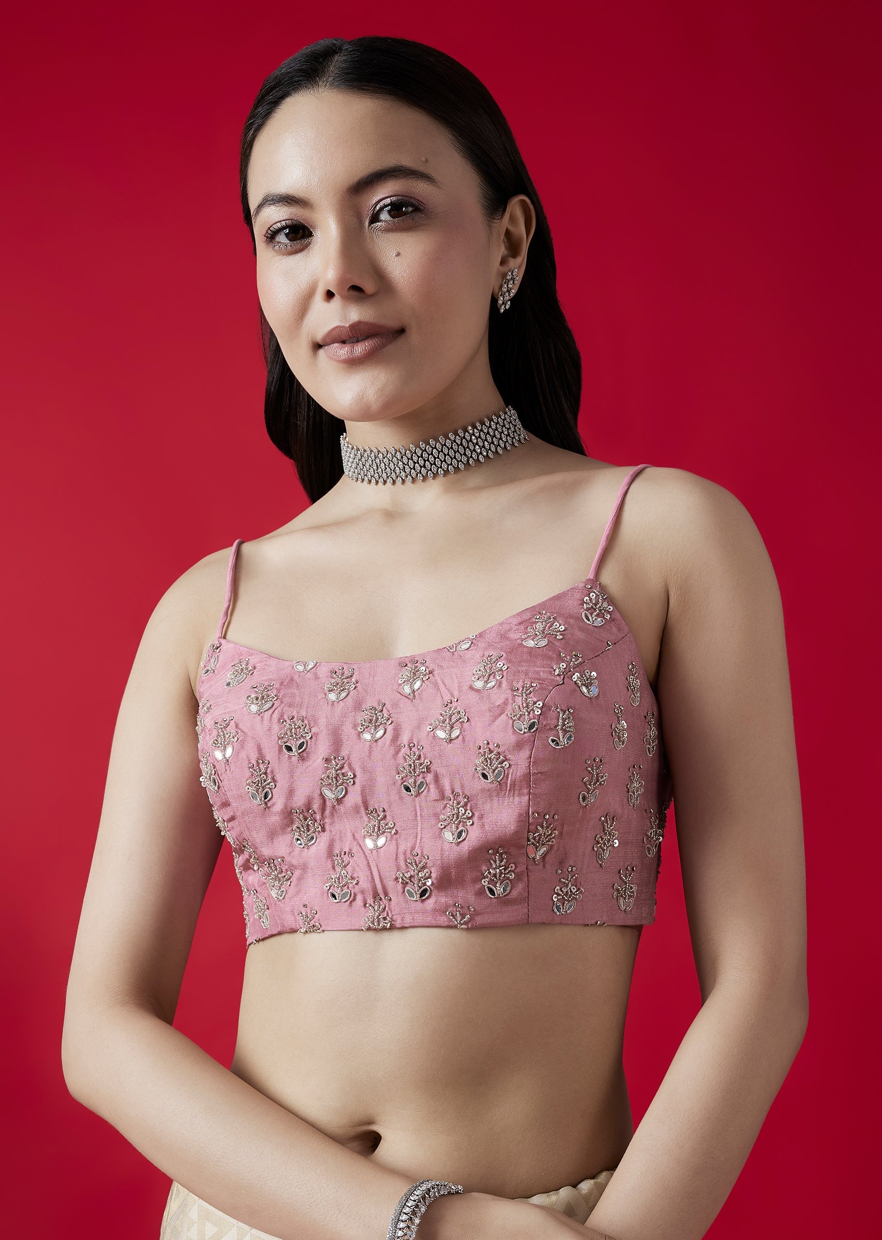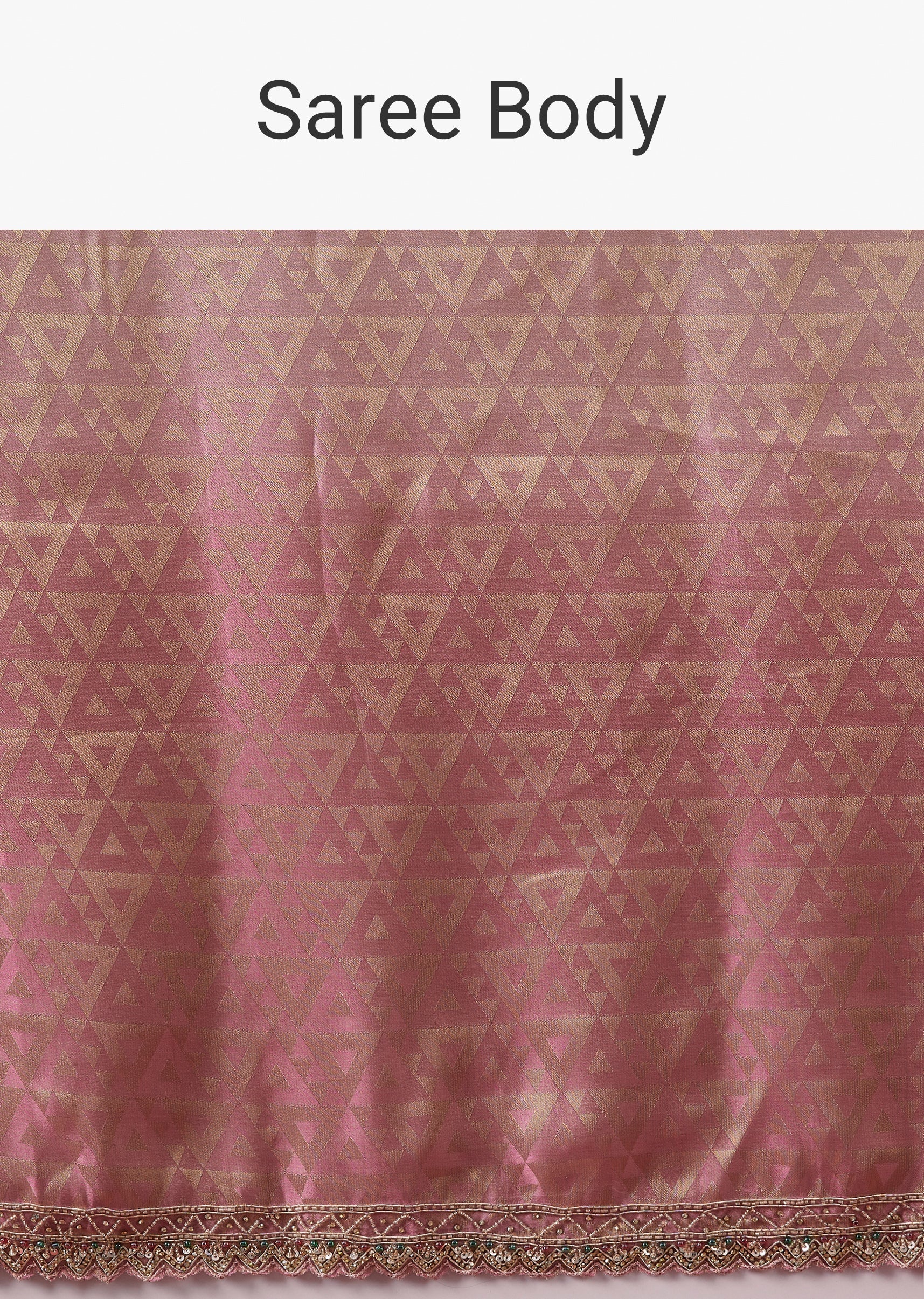 This elegant pink jacquard silk saree showcases a beautiful shaded effect with geometric patterns and a zigzag embroidered border detailed with cutdana, sequins and beads. It comes with a heavily... More Product Details