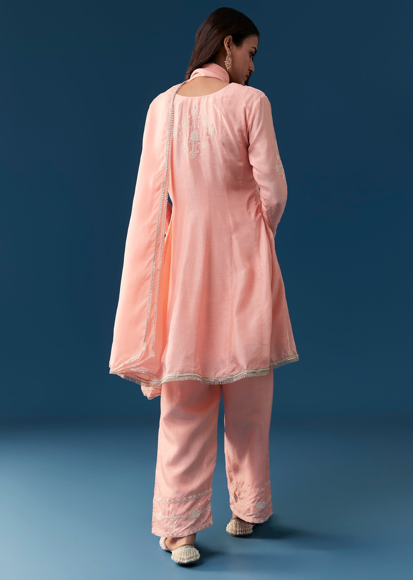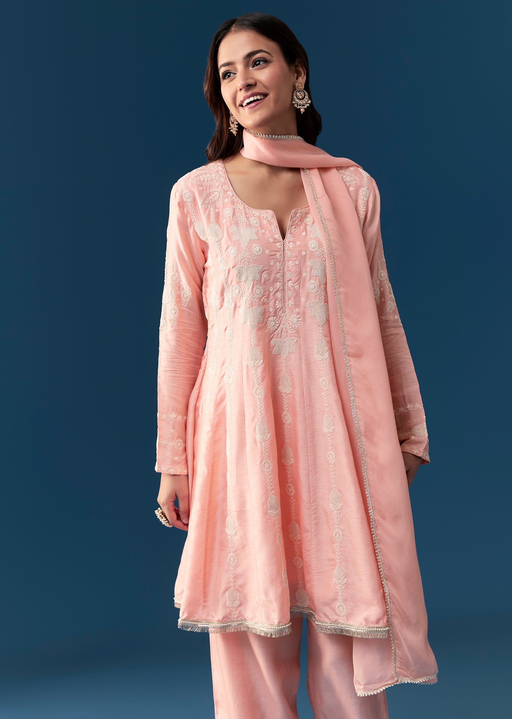 This pink anarkali suit features a peplum silhouette inspired by Pakistani style crafted from luxurious silk material. It is beautifully adorned with delicate thread work embroidery enhancing its ethnic... More Product Details