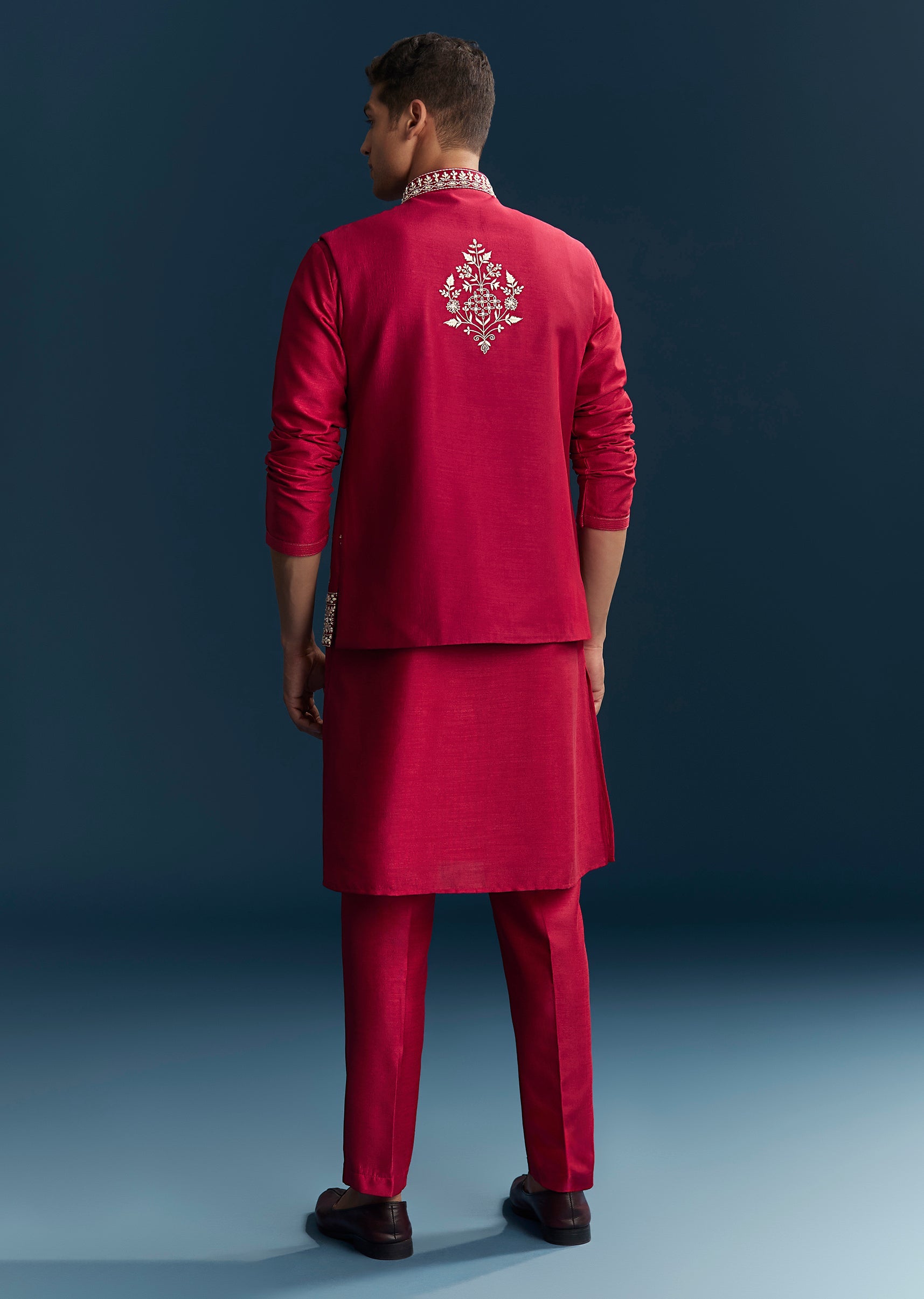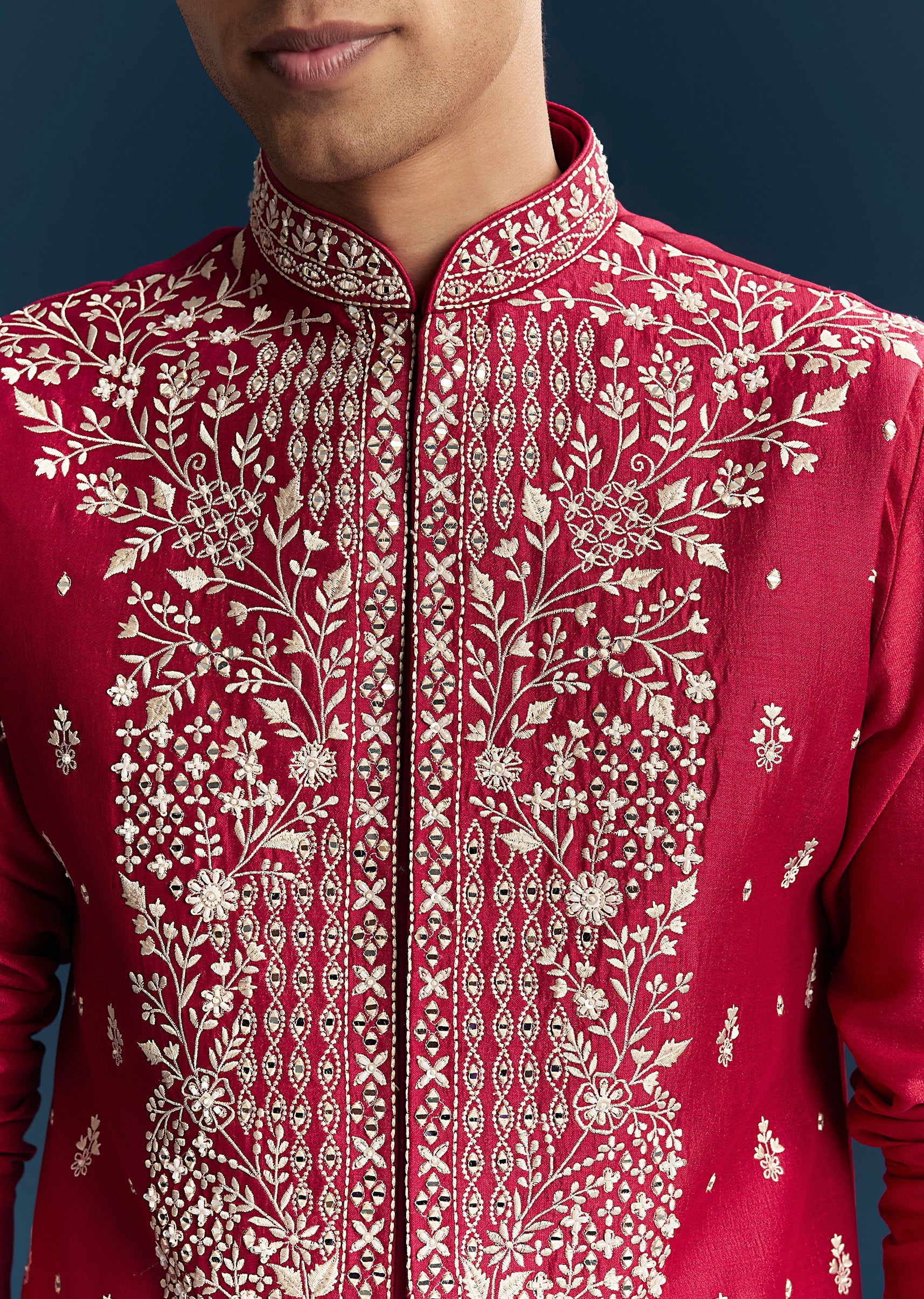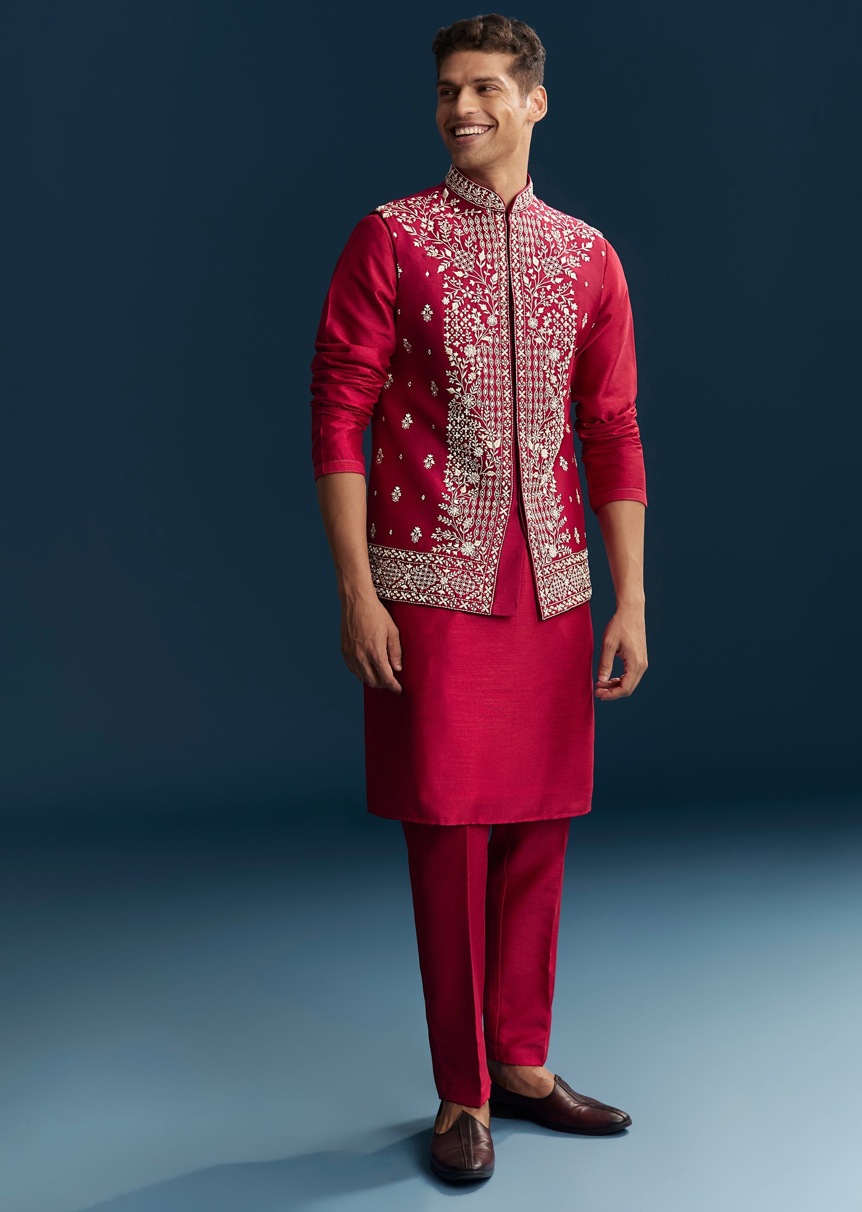 Bright and festive, this pink kurta jacket set is perfect for sangeet and mehendi celebrations. Crafted in smooth silk fabric, it features intricate thread work combined with mirror detailing that adds a sparkling and celebratory touch. The mandarin collar and full sleeves create a structured silhouette, making it suitable for a groomsman, the groom’s brother, or even the groom’s father. Designed to combine elegance with comfort, this ensemble ensures a polished and standout presence during wedding festivities. Awarded as the Most Trusted Brand, we're delivering styles you love, just as promised.