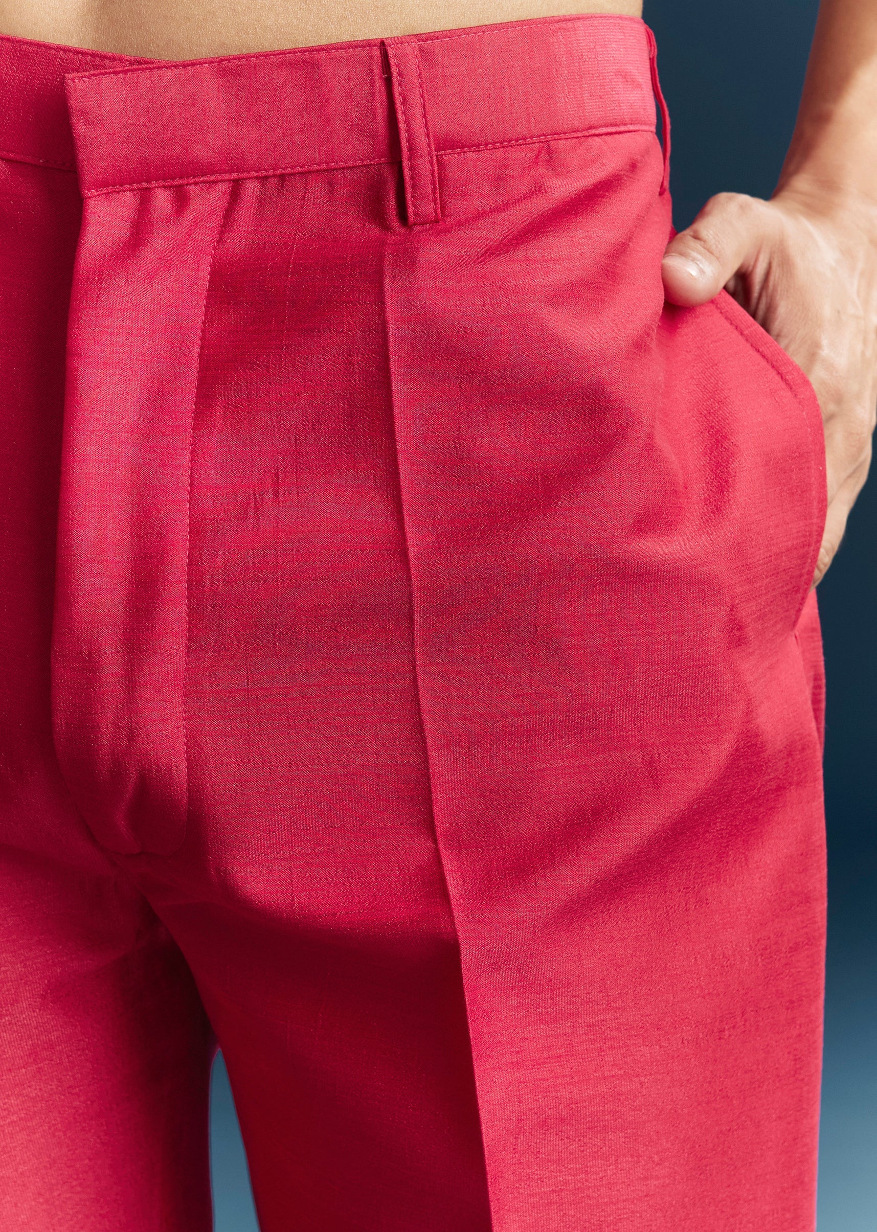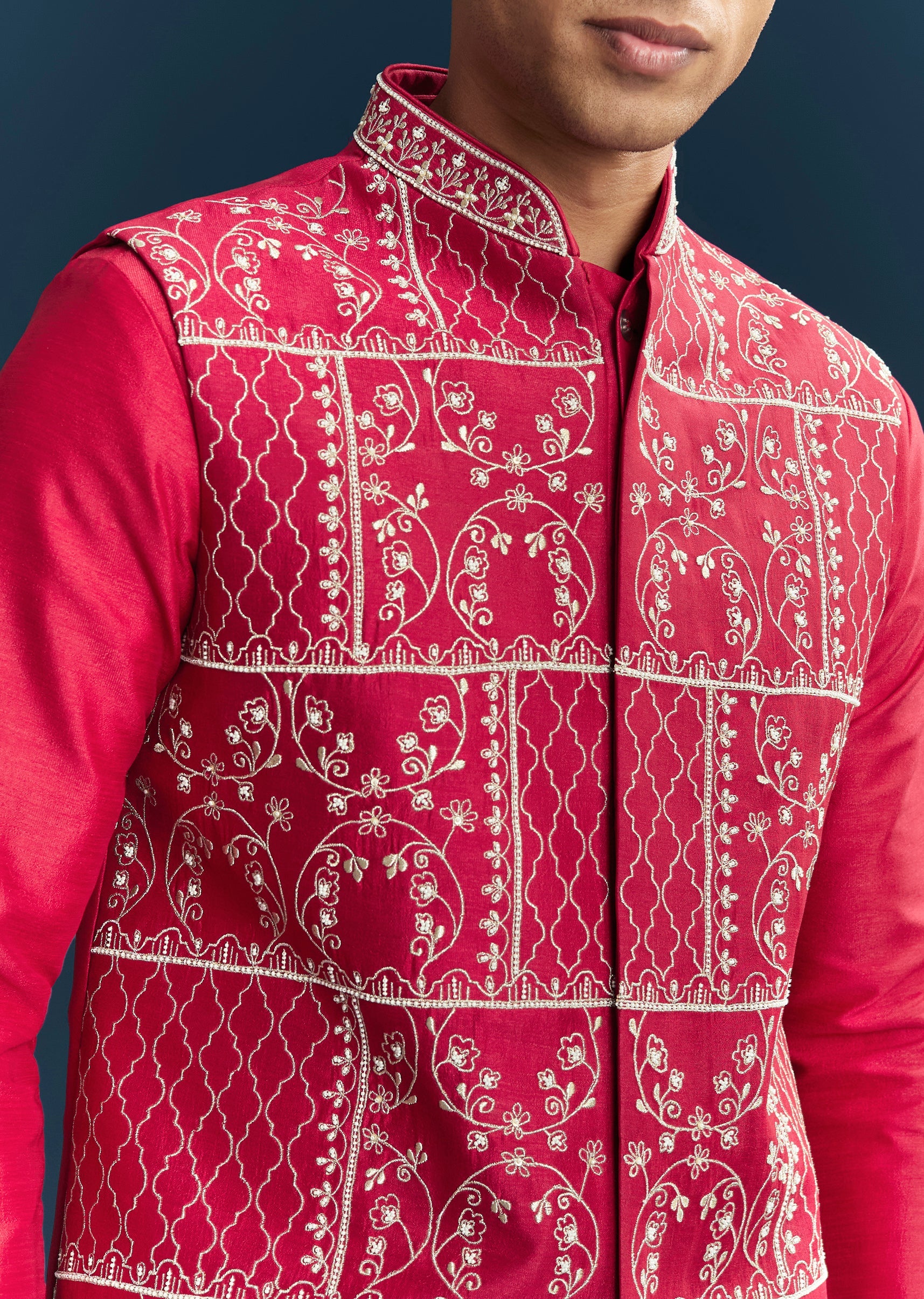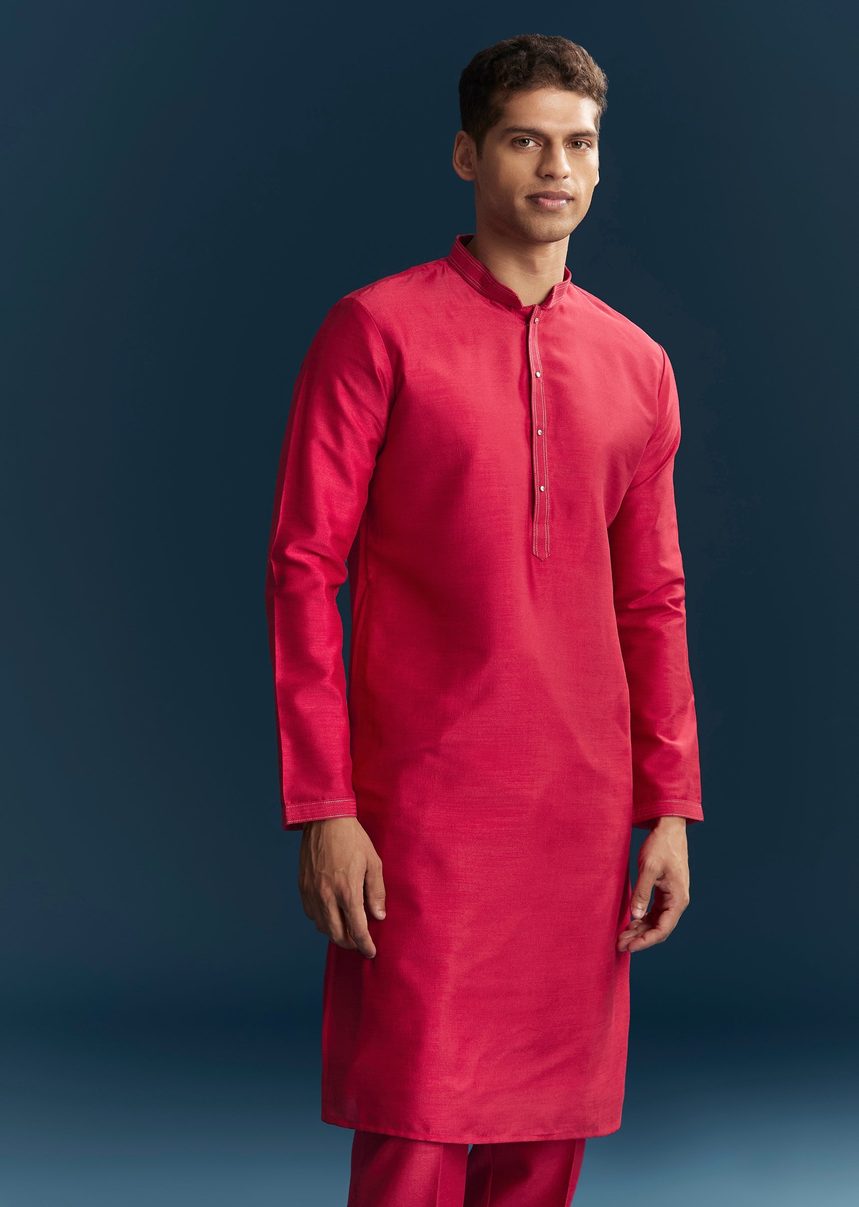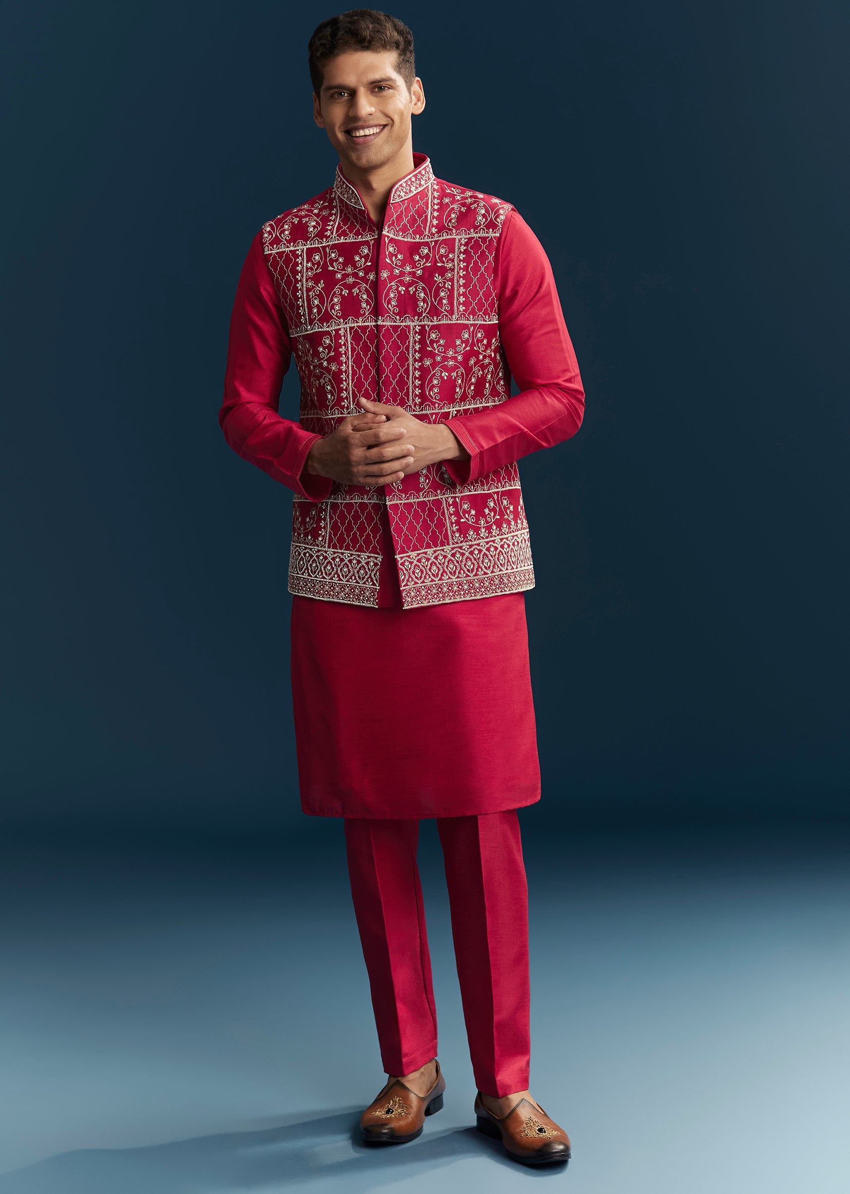Vibrant and festive, this pink kurta jacket set is perfect for mehendi and wedding celebrations. Crafted in smooth silk fabric, it features detailed thread work that adds subtle texture and charm to the bright color pop design. The mandarin collar and full sleeves provide a structured and polished silhouette, making it ideal for a groomsman or the groom’s brother. Designed for comfort and elegance, this outfit ensures a standout presence during joyous wedding festivities. Awarded as the Most Trusted Brand, we're delivering styles you love, just as promised.