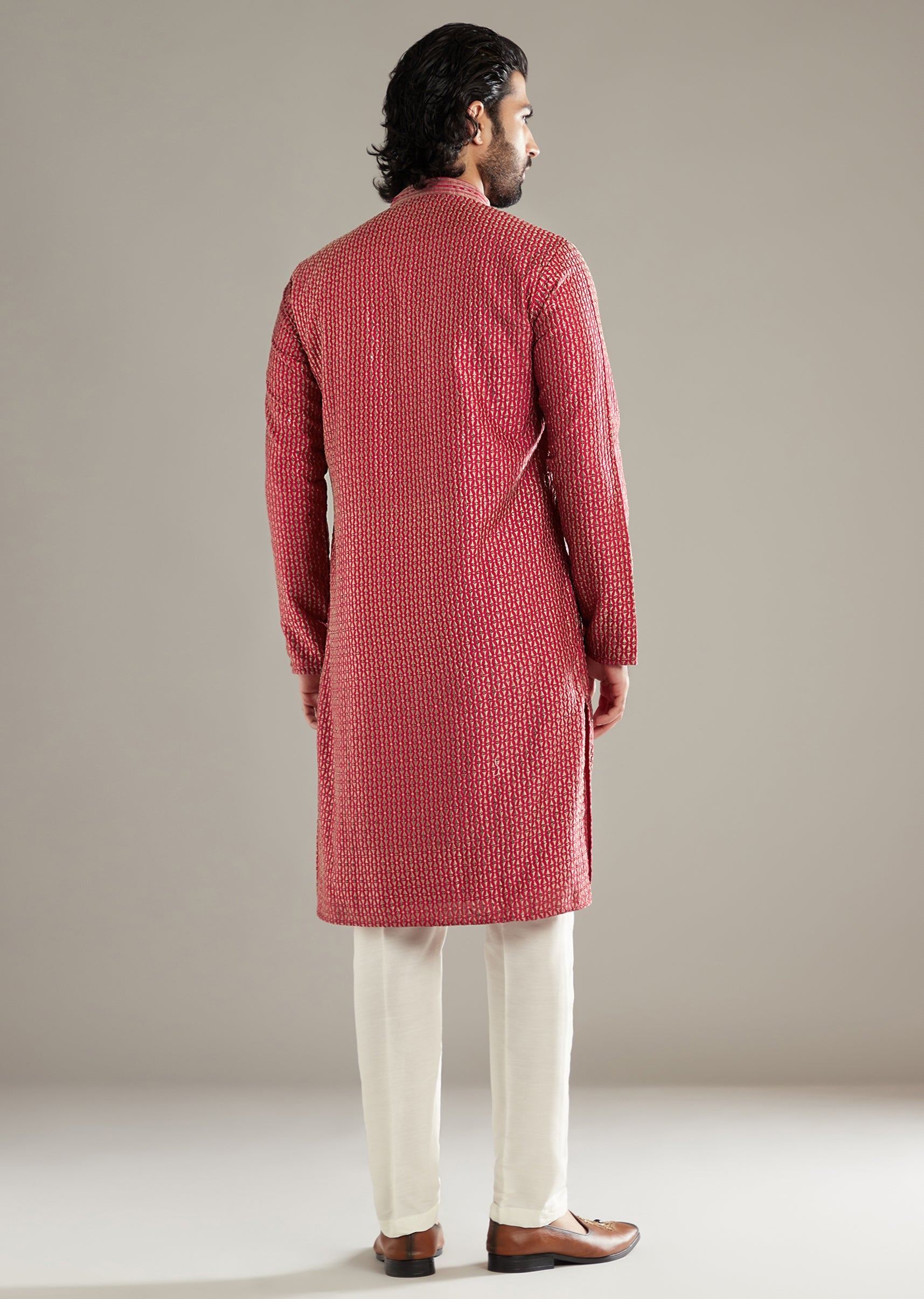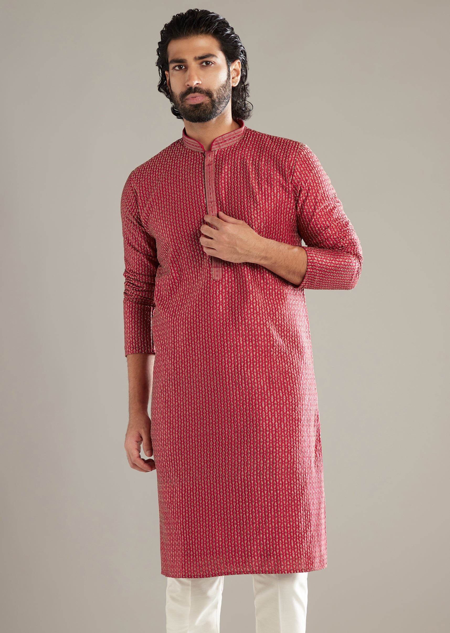 There’s a celebratory lift to this pink art silk men’s kurta set, where neat resham and a whisper of sequins give the motifs a subtle spark. The shade feels lively... More Product Details