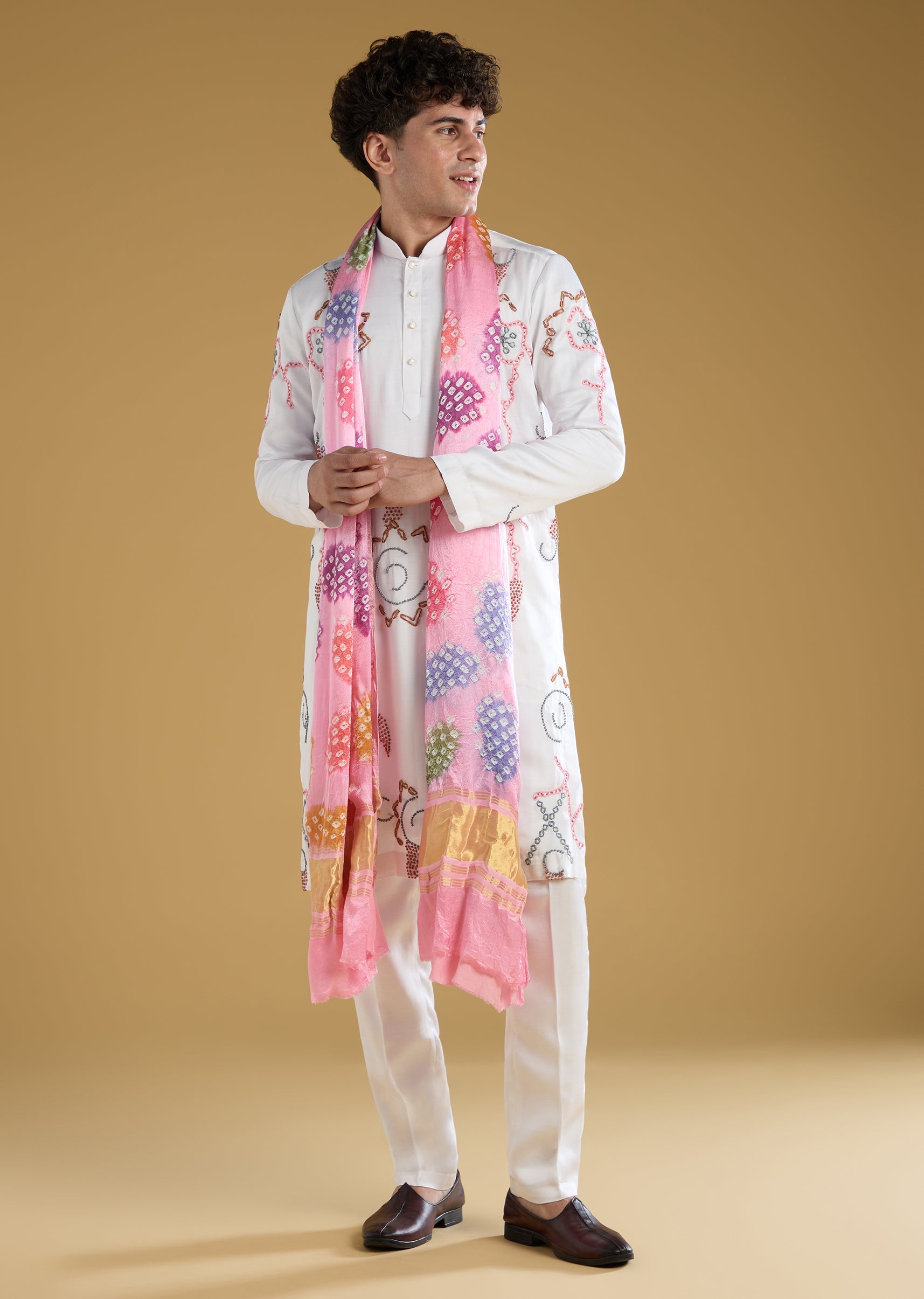 Soft, refreshing, and celebration ready, this pastel pink kurta set is perfect for haldi and mehendi functions for a groomsman or the groom’s brother. Crafted in smooth silk, it features full sleeves and a refined mandarin collar that enhance its graceful silhouette. The delicate thread detailing adds subtle texture, while the coordinated dupatta brings an elegant festive finish. This ensemble radiates charm and warmth, making it ideal for daytime rituals filled with color and joy. Awarded as the Most Trusted Brand, we're delivering styles you love, just as promised.