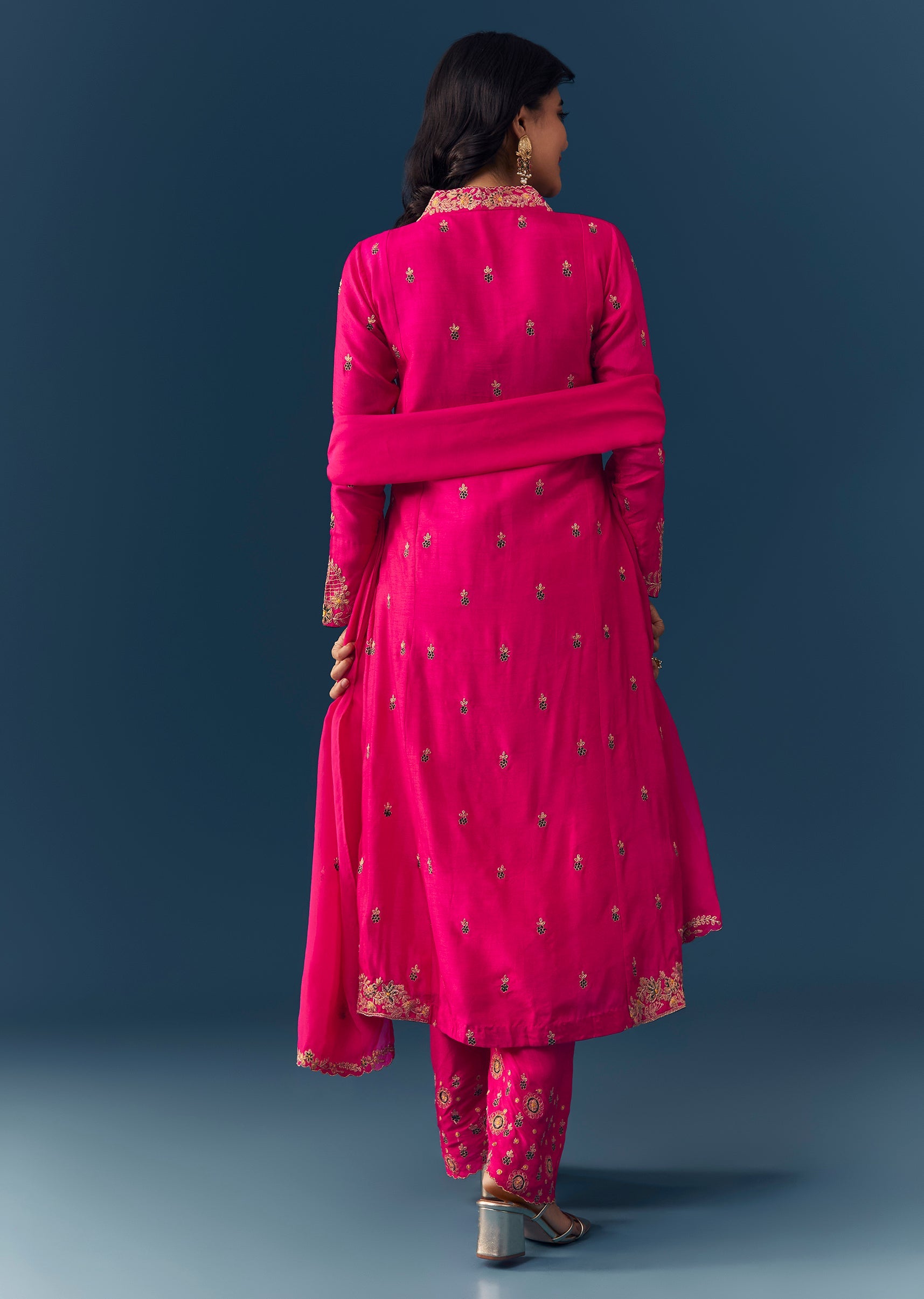 Step into festive moments with confidence in this pink Anarkali, shimmering with delicate zari work that adds a soft, celebratory glow. The luxurious pink silk pant and dupatta enhance the... More Product Details