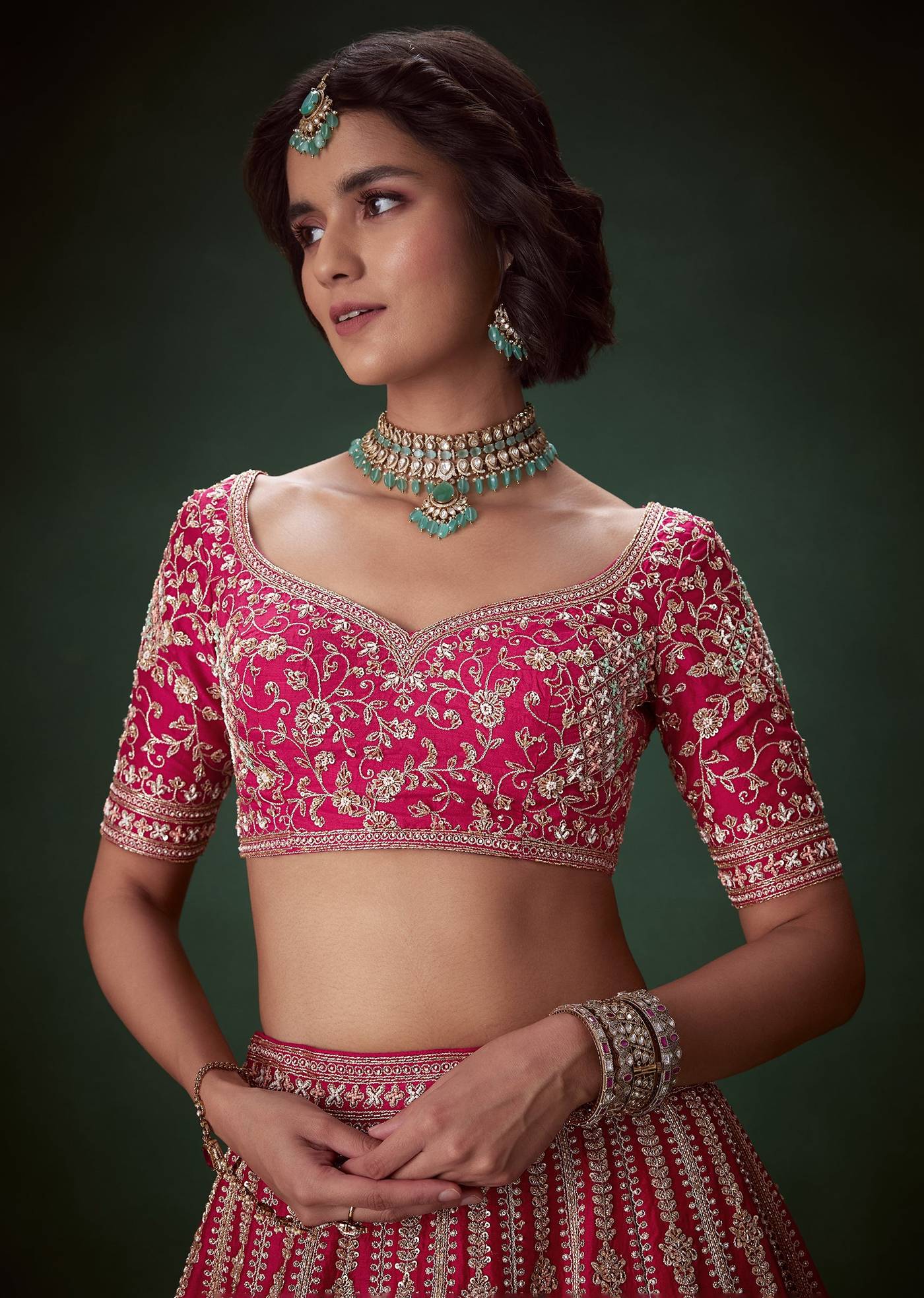 Embrace regal bridal beauty with this rich pink and magenta lehenga set, heavily embroidered with gold zari, resham, beads, sequins, and stone embellishments for a truly luxurious finish. The half... More Product Details
