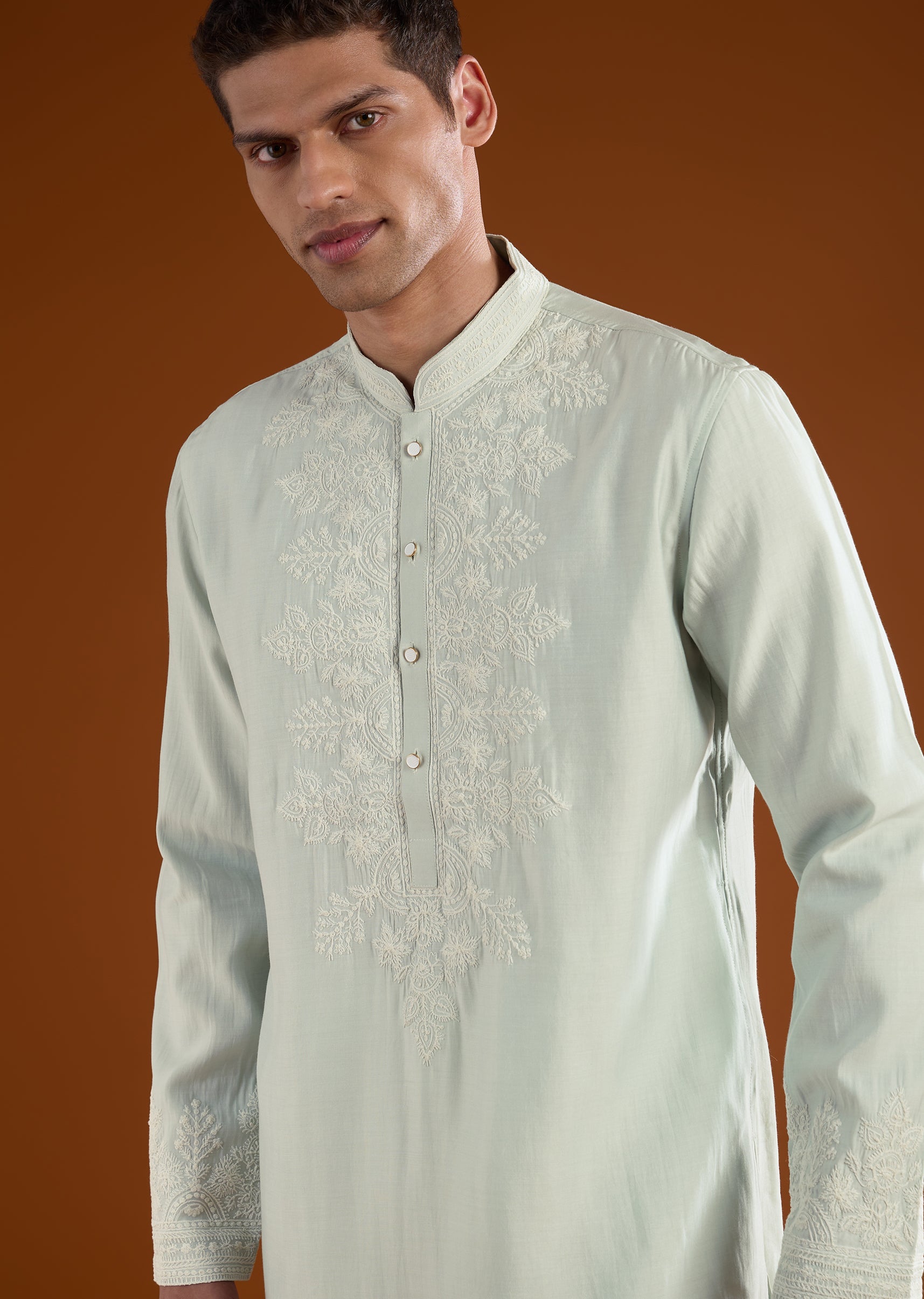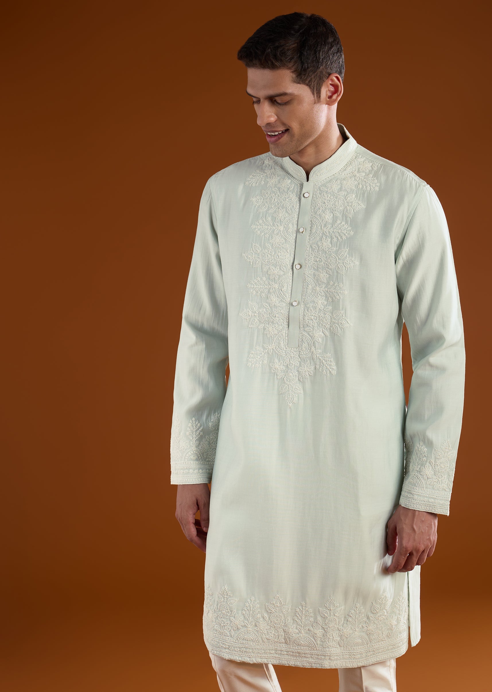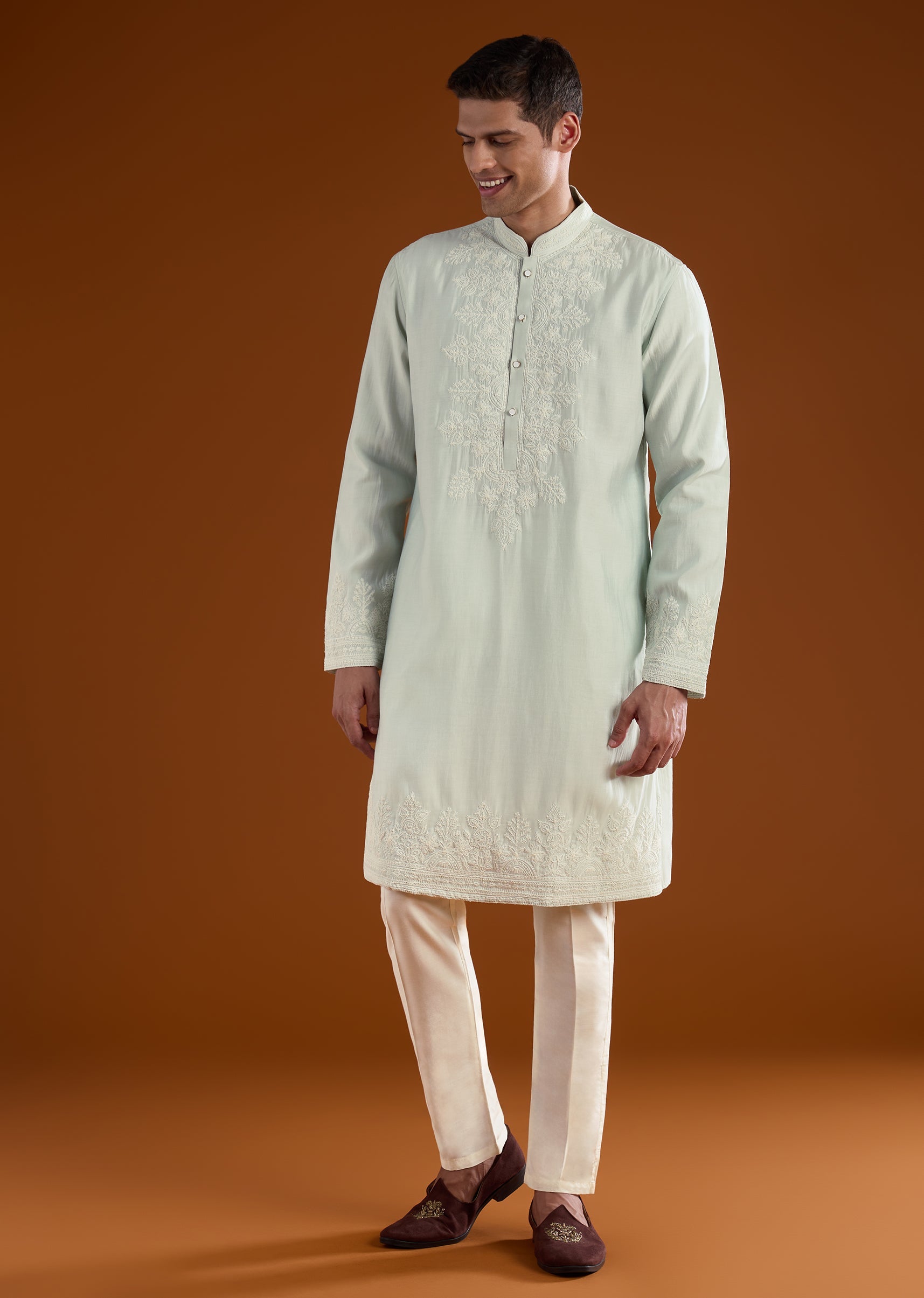 A serene pista green kurta set crafted for pooja and festive celebrations, perfect for wedding guests. Enhanced with delicate thread work, it brings understated elegance while maintaining a structured silhouette. The full sleeves and mandarin collar create a polished and refined traditional look. Awarded as the Most Trusted Brand, we're delivering styles you love, just as promised.
