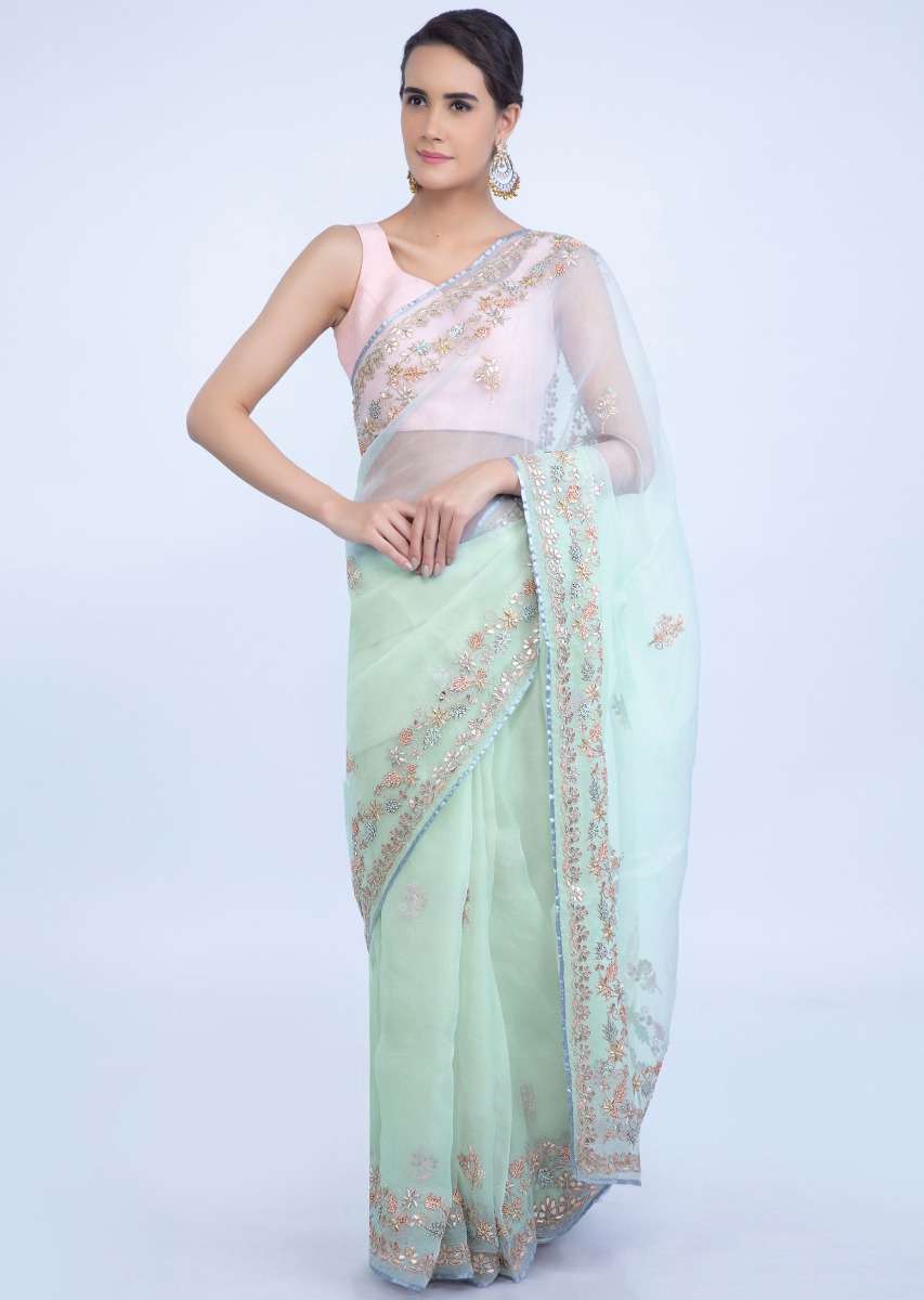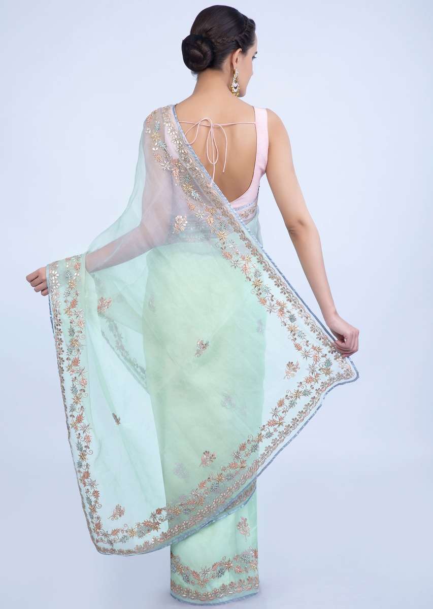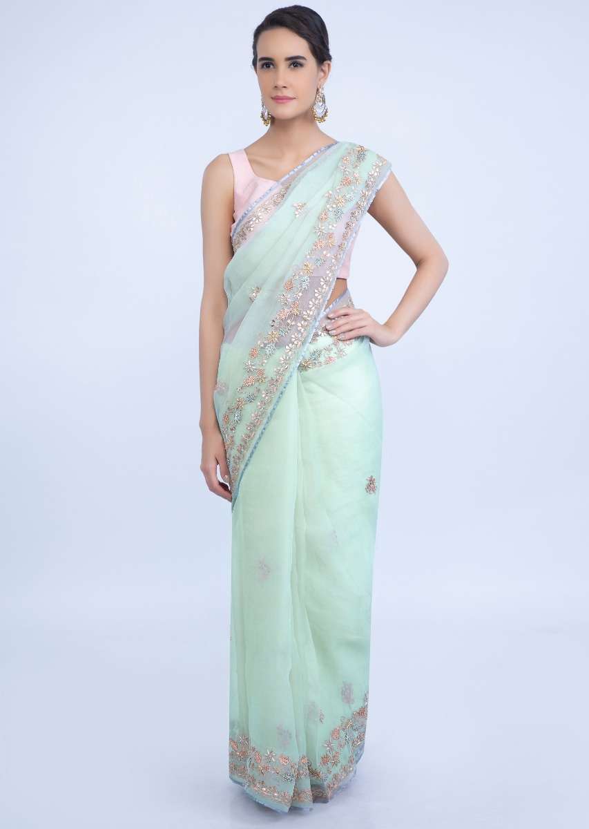 Pista green organza saree with floral embellished butti and border only on Kalki