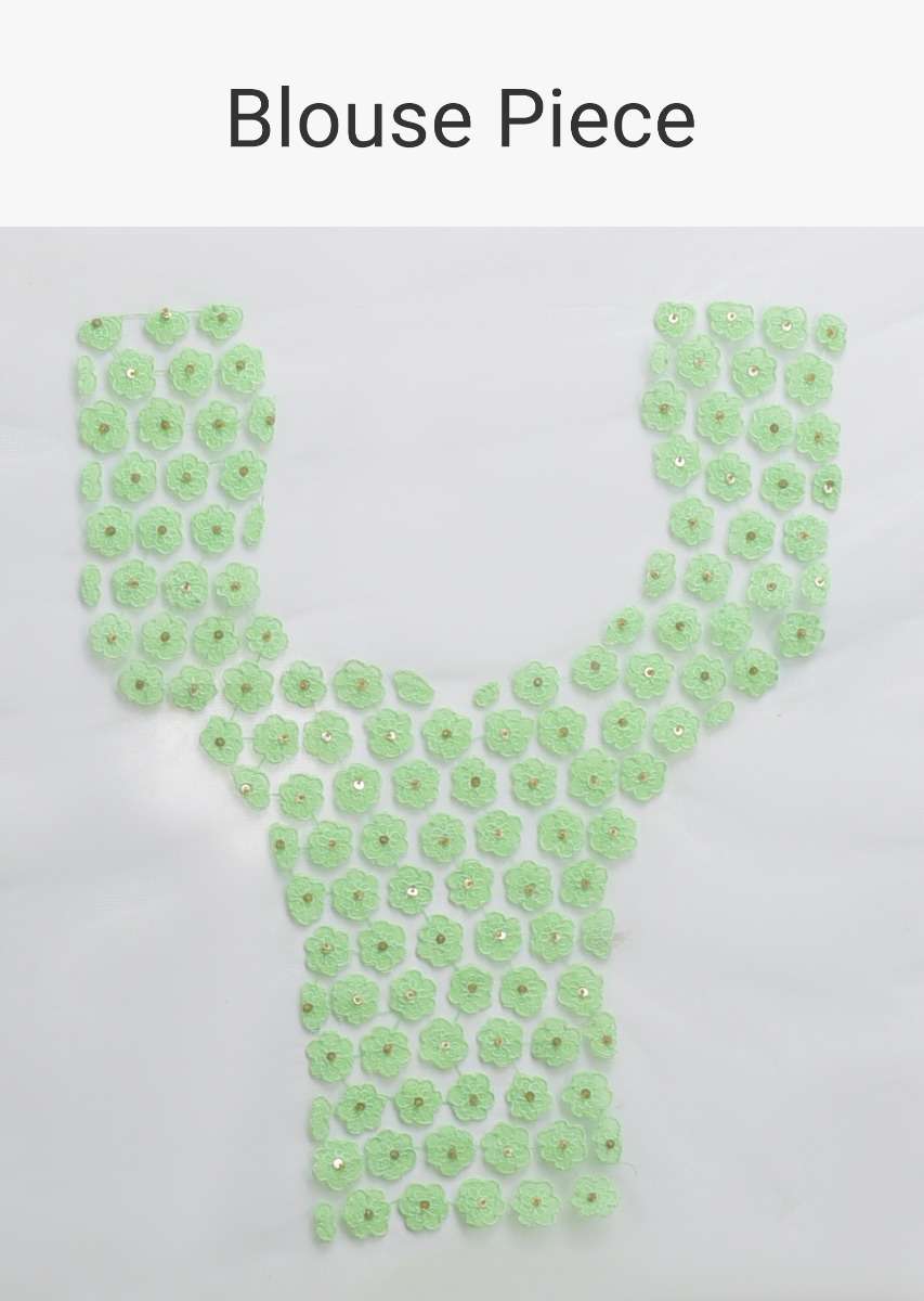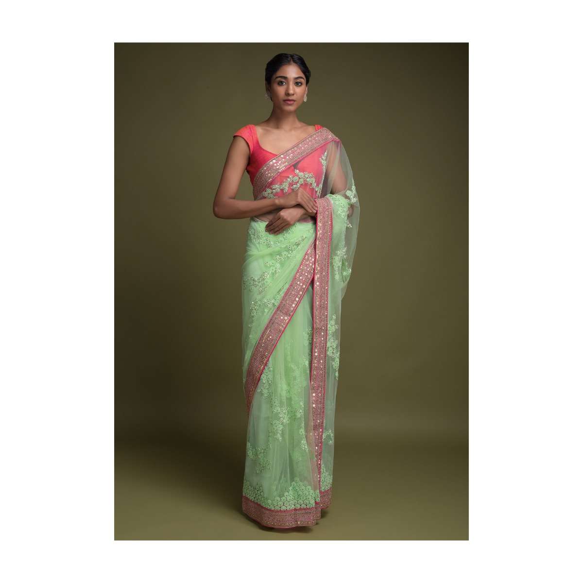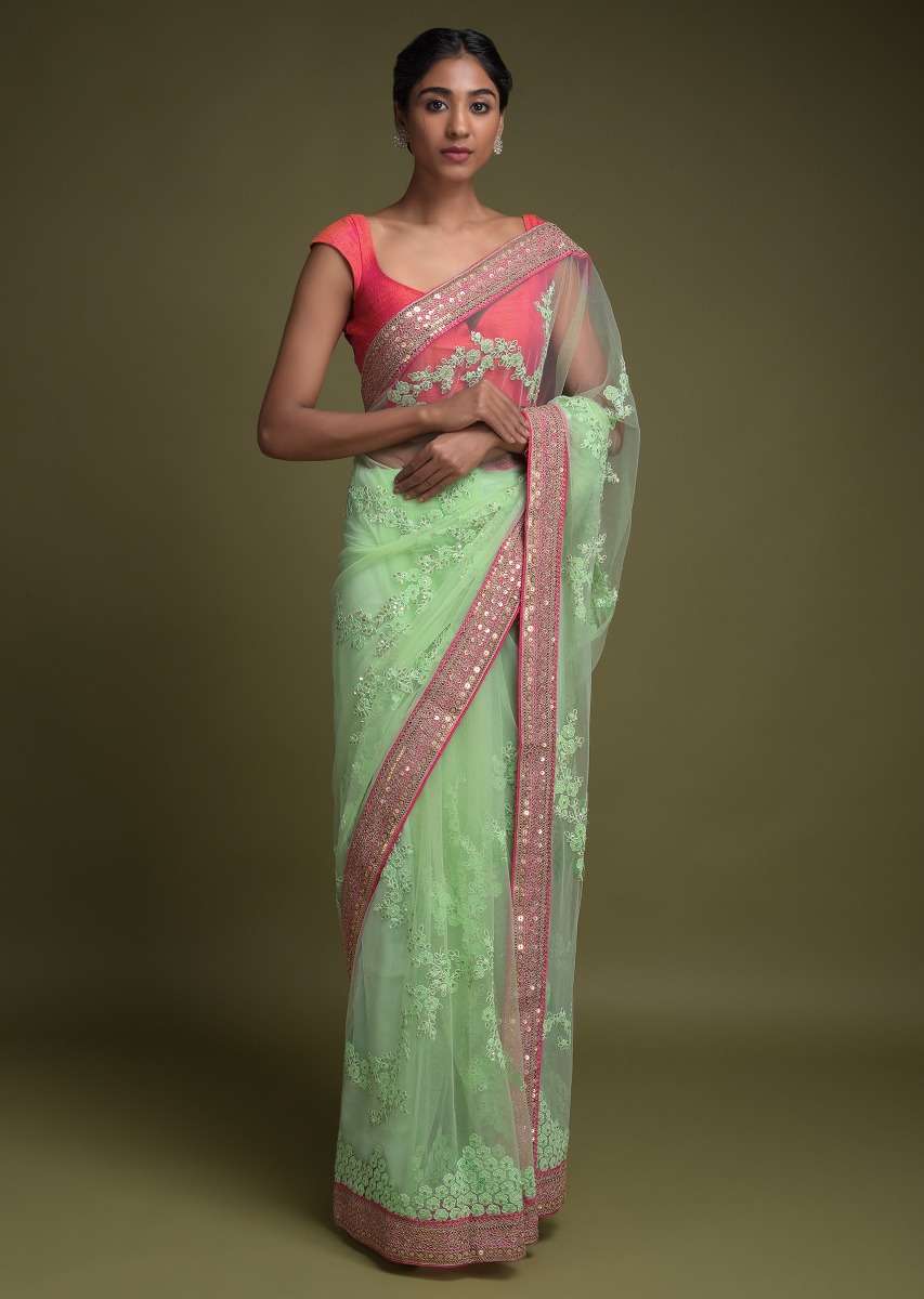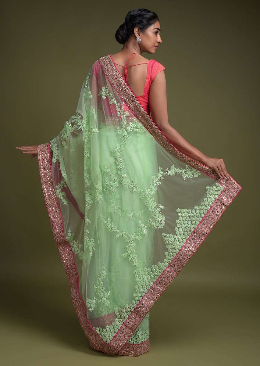 Pista Green Saree In Net With Applique, Thread And Sequins Embroidered Floral Pattern Online - Kalki Fashion