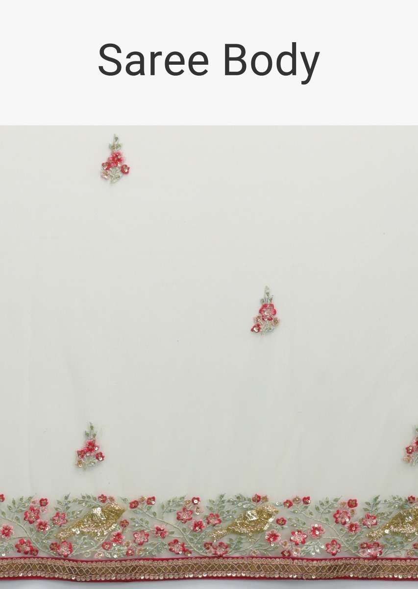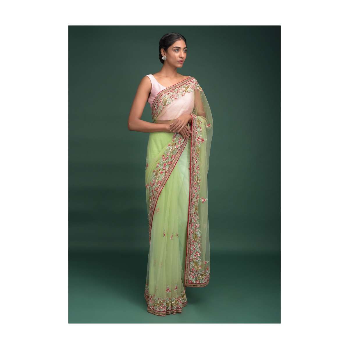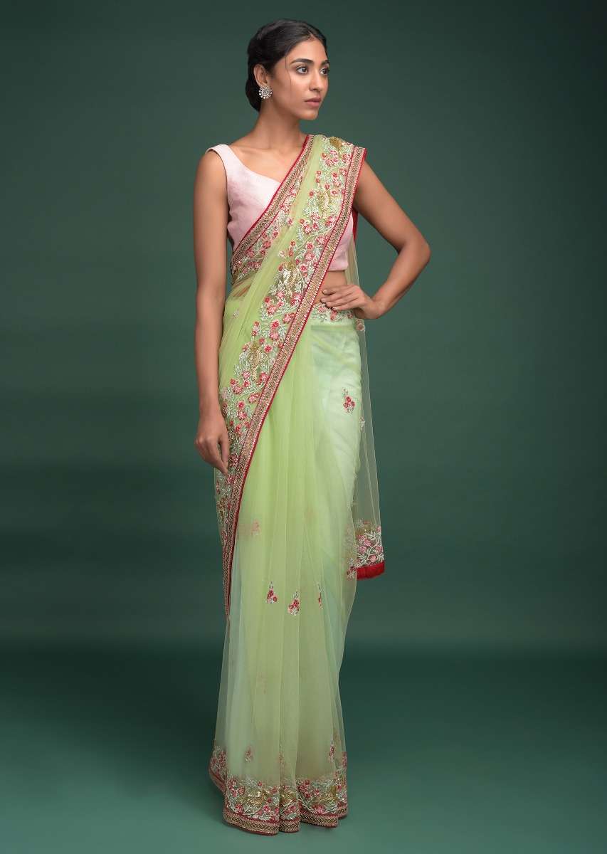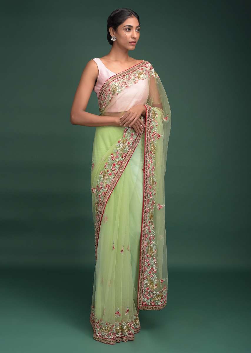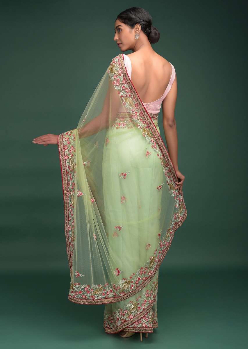 Pista Green Saree In Net With Resham Embroidered Floral Buttis And Border Online - Kalki Fashion