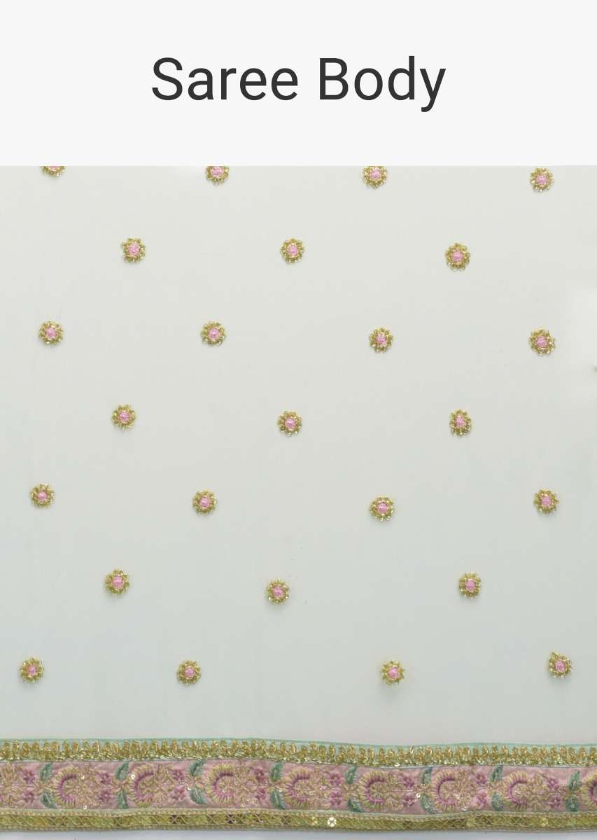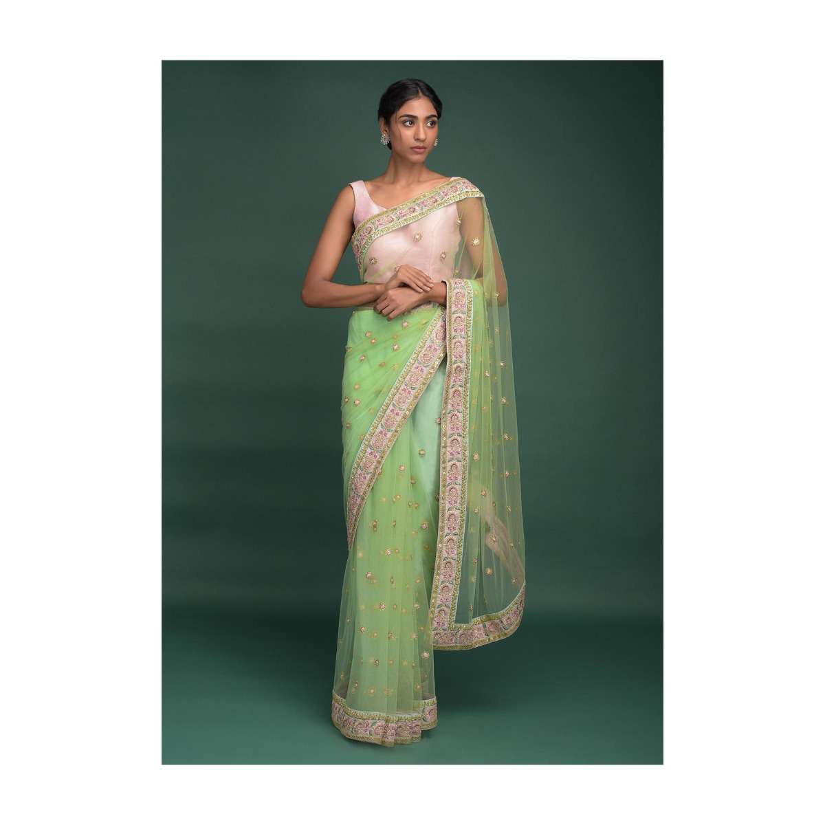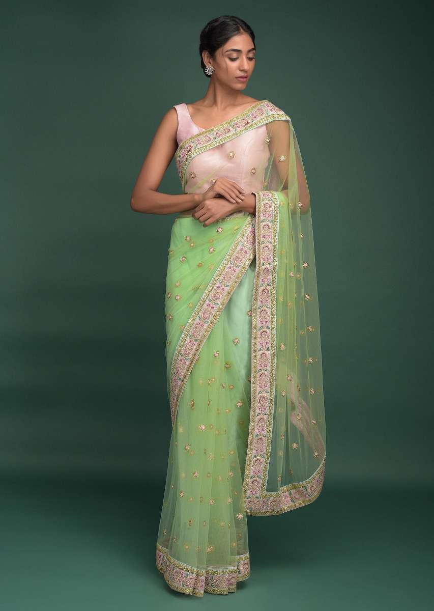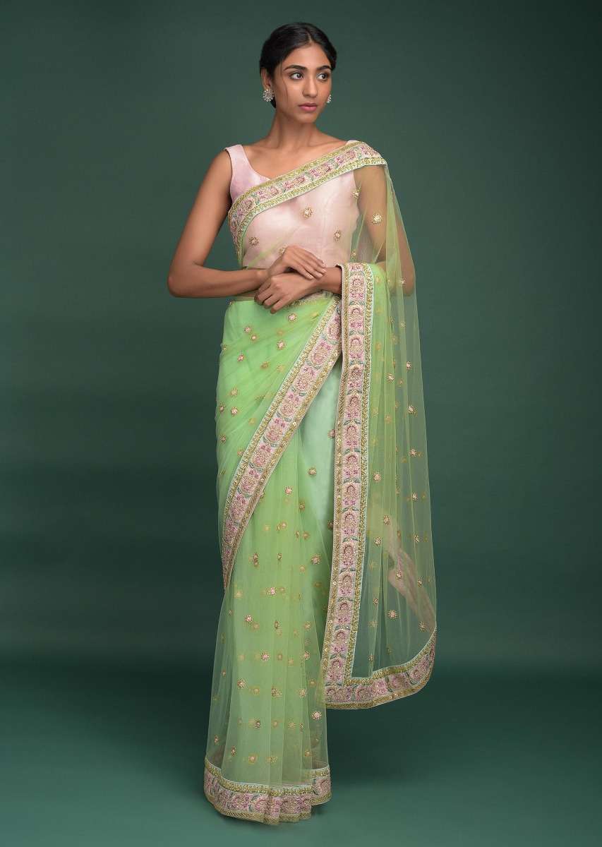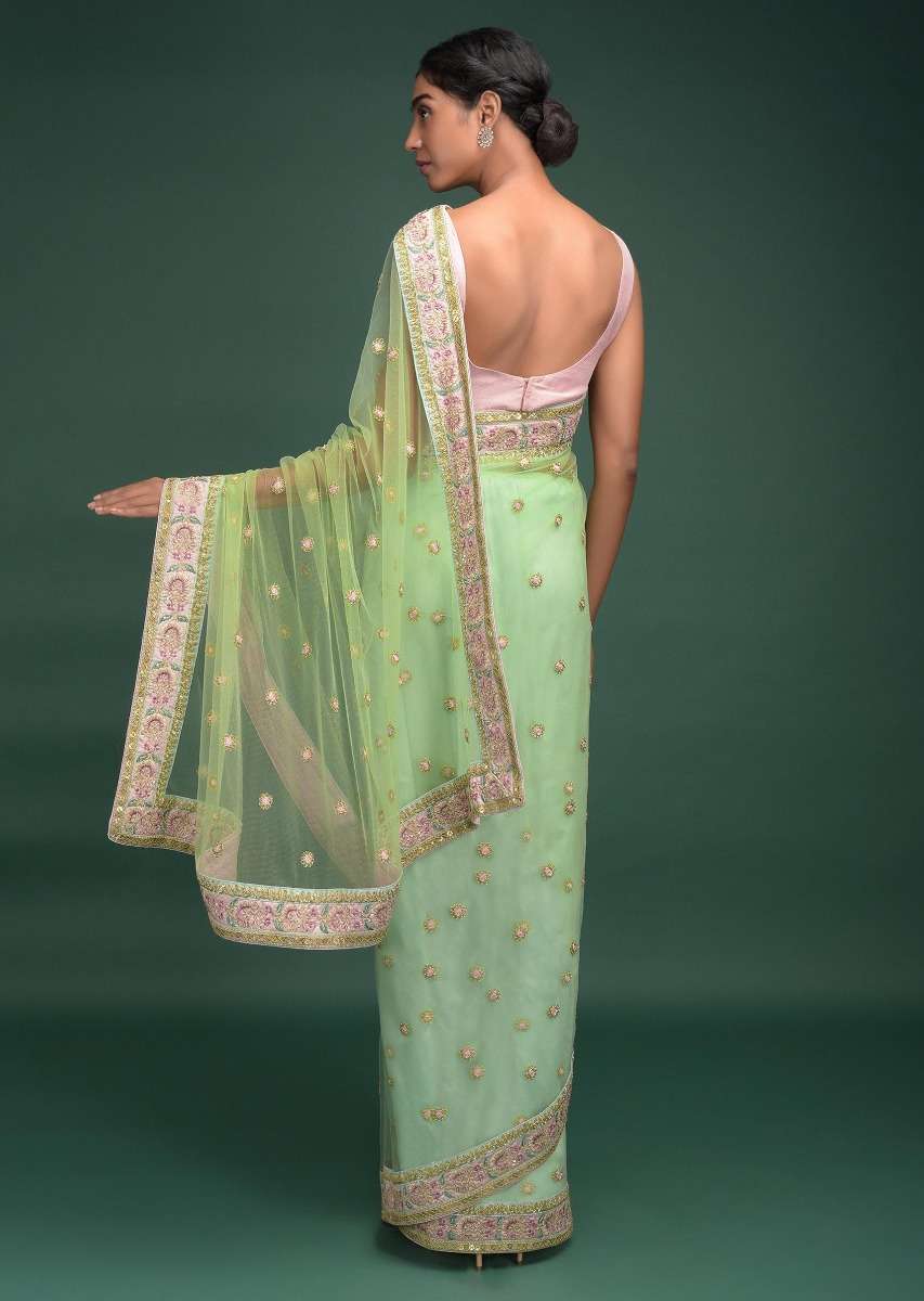 Pista Green Saree In Net With Resham, Sequins And Zari Embroidered Floral Buttis Online - Kalki Fashion