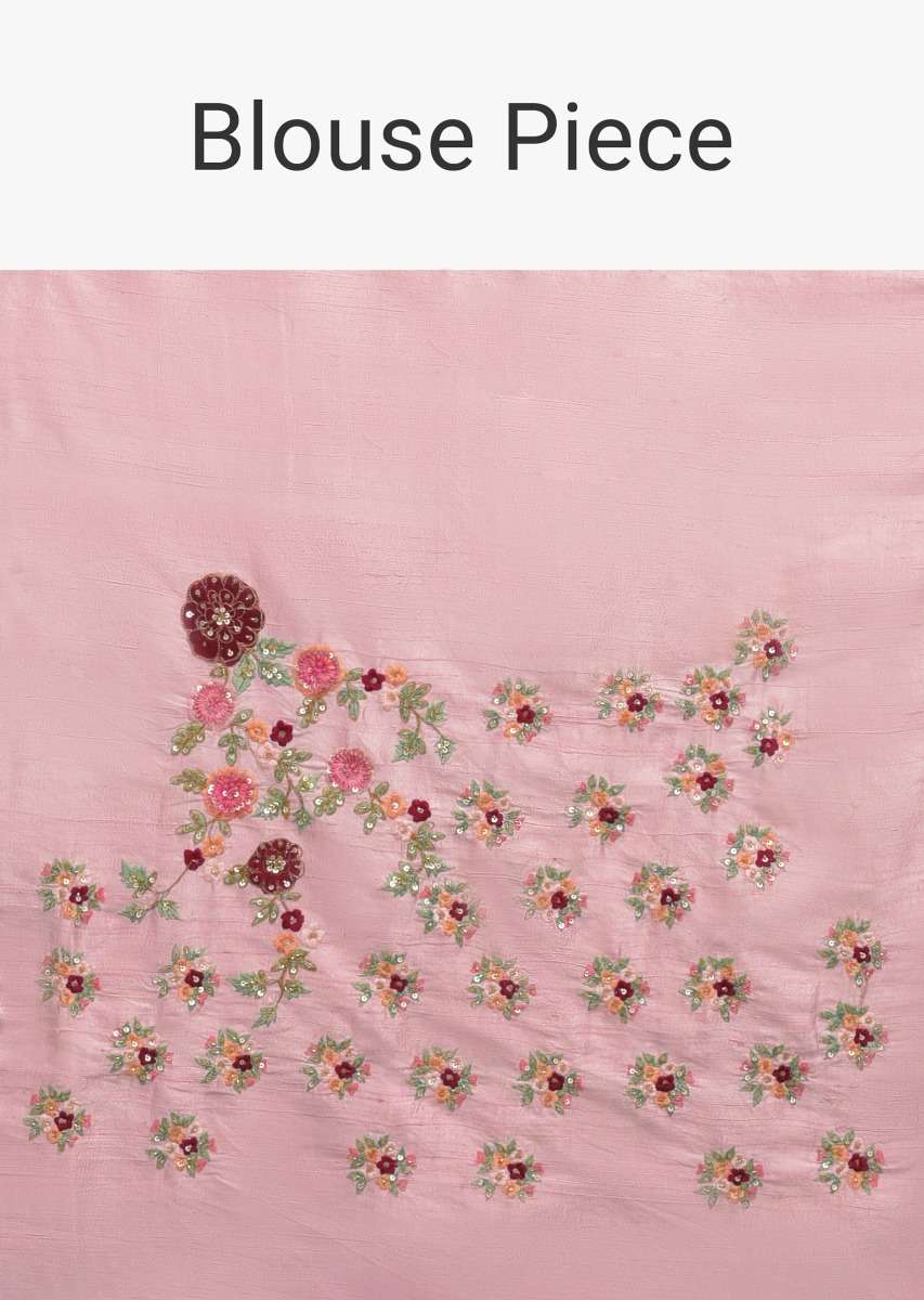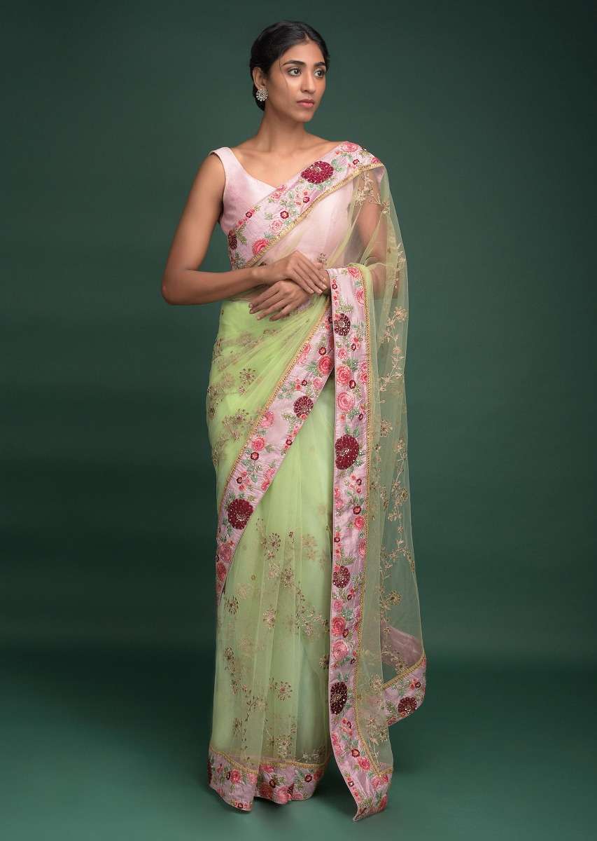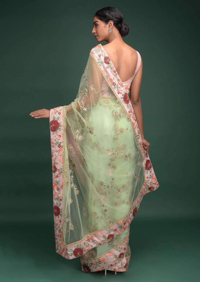 Pista Green Saree In Net With Velvet Patch Work In Floral Pattern On The Border Online - Kalki Fashion