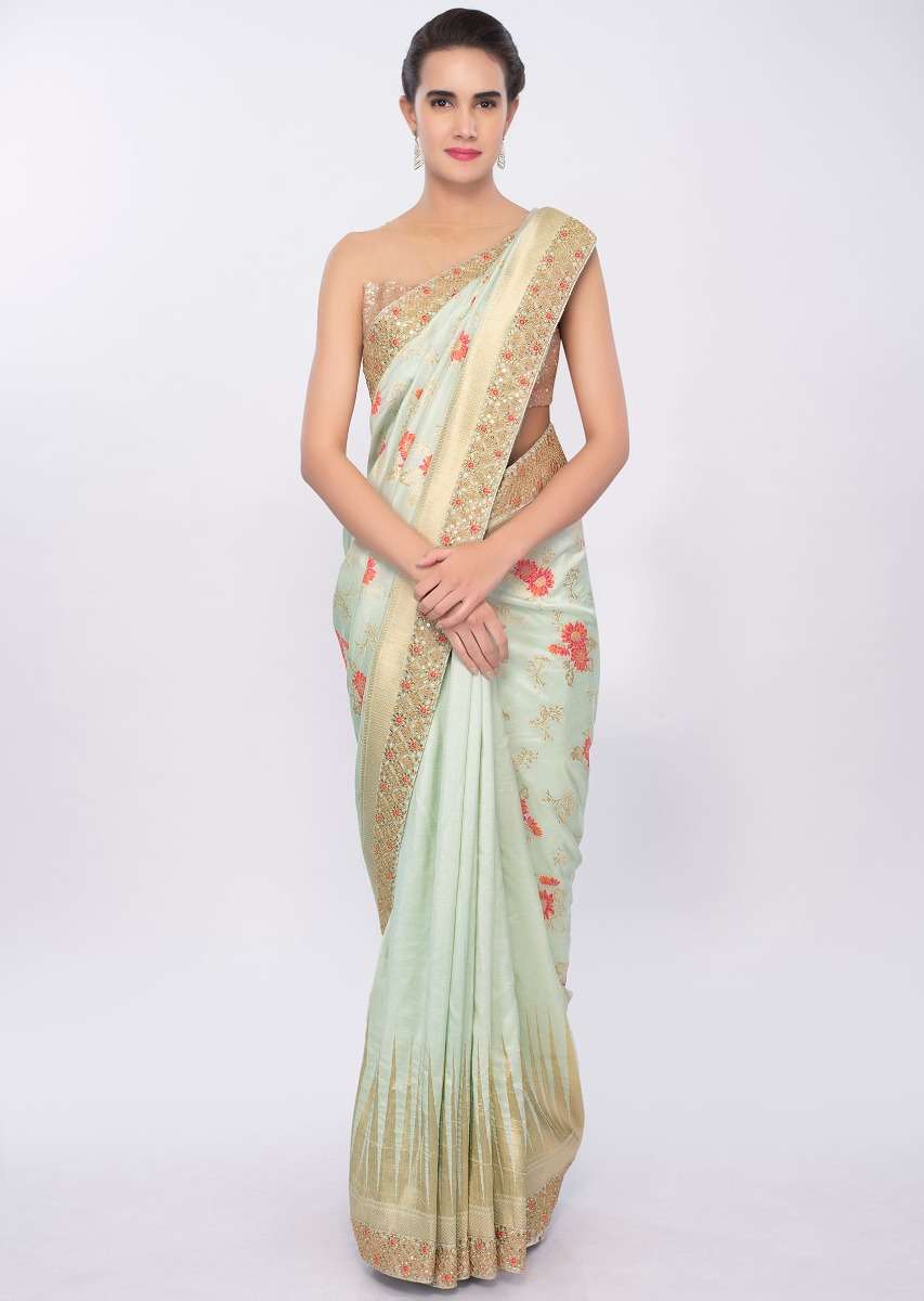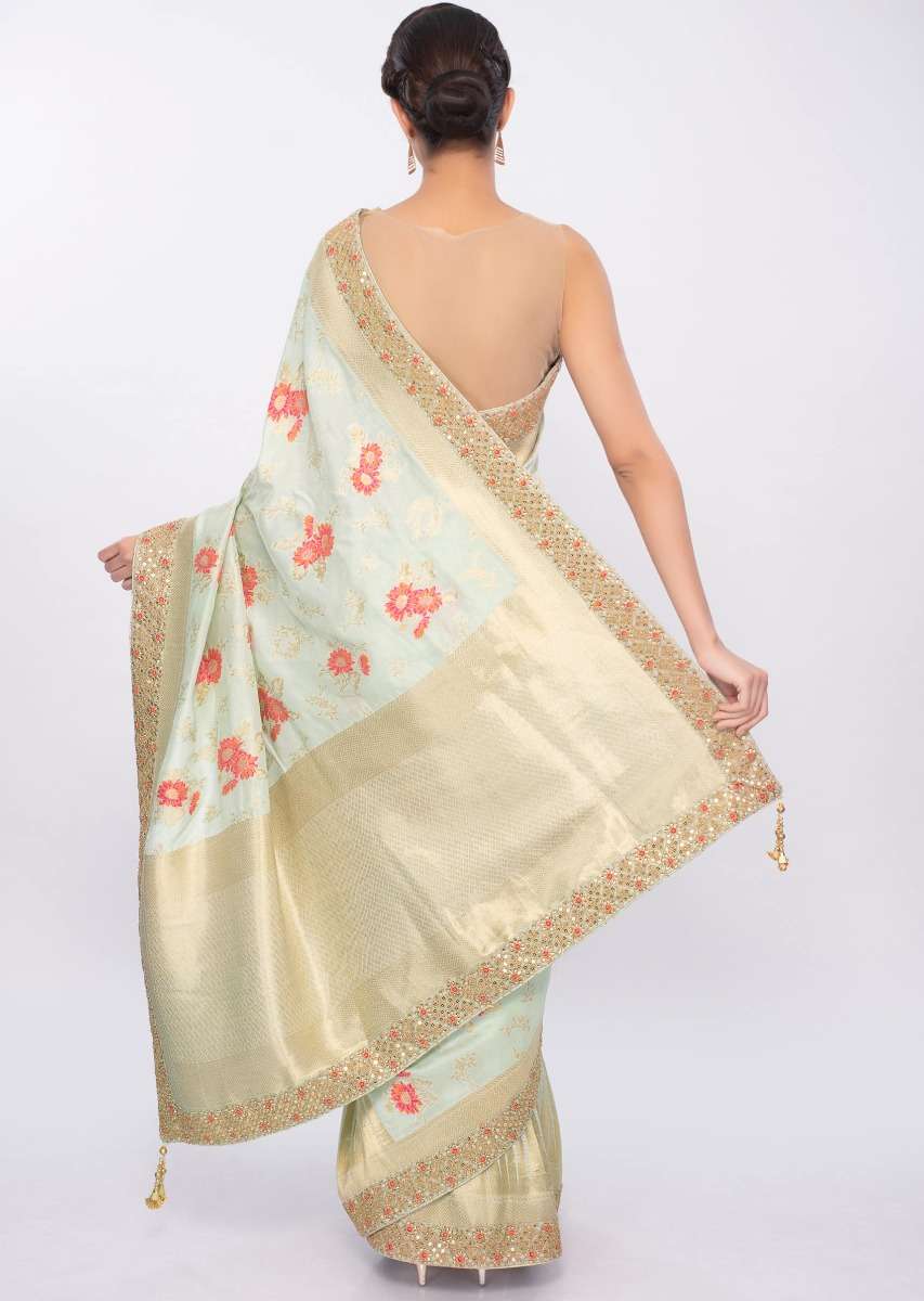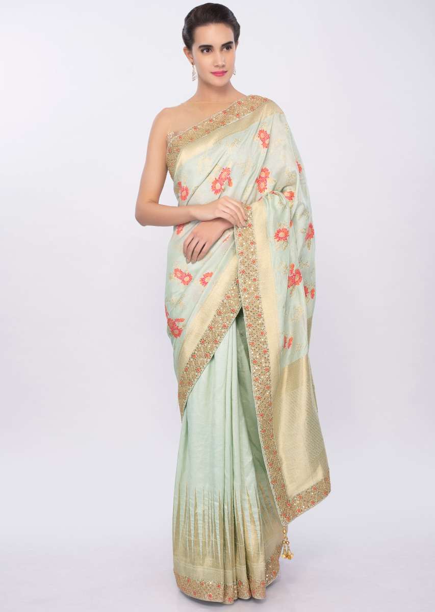 Pista green silk saree with multi color floral weaved pallo with tassel only on Kalki